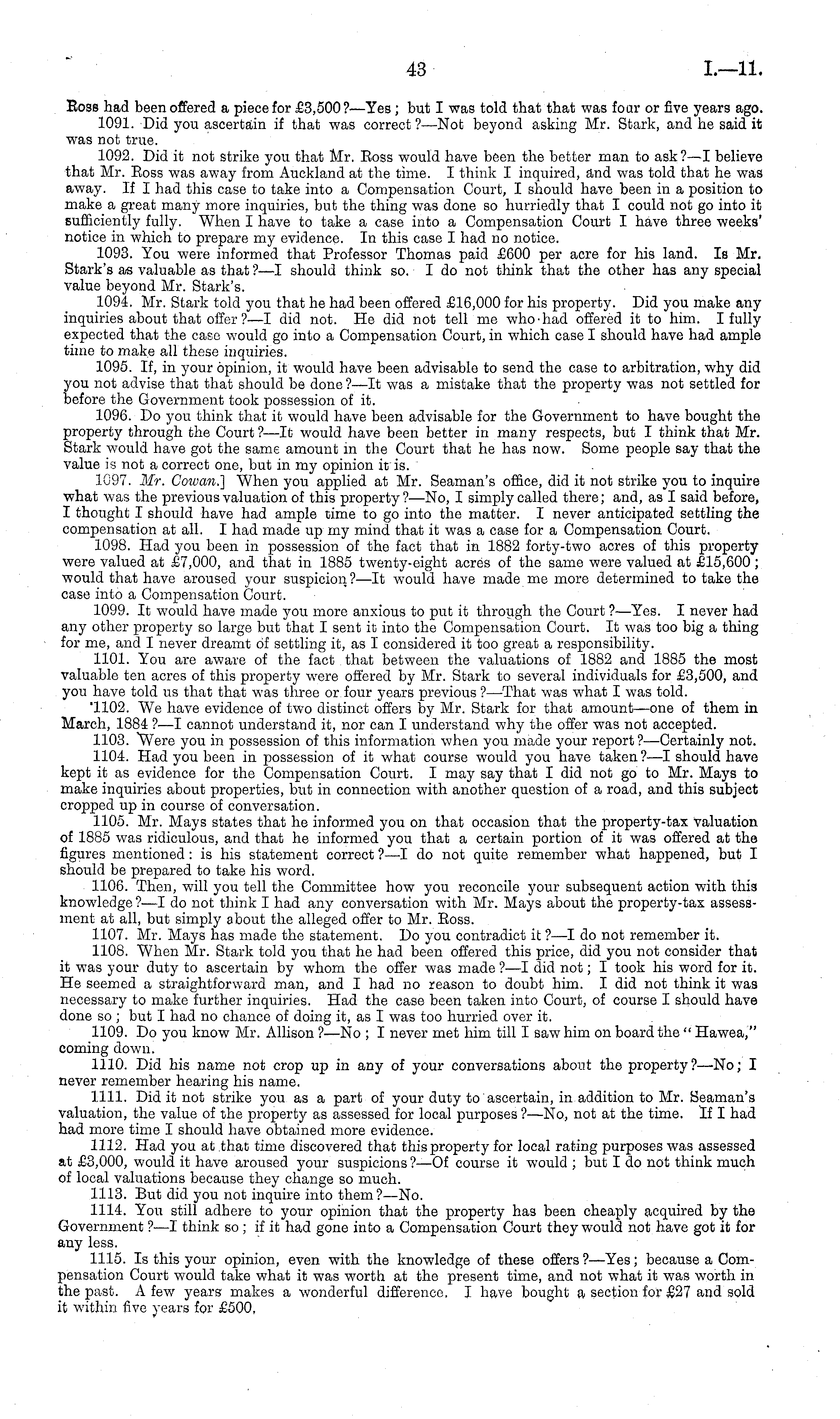 Eoss had been offered a piece for £3,500 ?—Yes ; but I was told that that was four or five years ago. 1091. Did you ascertain if that was correct ?—Not beyond asking Mr. Stark, and he said it was not true. 1092. Did it not strike you that Mr. Eoss would have been the better man to ask?—l believe that Mr. Eoss was away from Auckland at the time. I think I inquired, and was told that he was away. If I had this case to take into a Compensation Court, I should have been in a position to make a great many more inquiries, but the thing was done so hurriedly that I could not go into it sufficiently fully. When I have to take a case into a Compensation Court I have three weeks' notice in which to prepare my evidence. In this case I had no notice. 1093. You were informed that Professor Thomas paid £600 per acre for his land. Is Mr. Stark's as valuable as that ?—I should think so. I do not think that the other has any special value beyond Mr. Stark's. 1094. Mr. Stark told you that he had been offered £16,000 for his property. Did you make any inquiries about that offer ?—I did not. He did not tell me who-had offered it to him. I fully expected that the case would go into a Compensation Court, in which case I should have had ample time to make all these inquiries. 1095. If, in your opinion, it would have been advisable to send the case to arbitration, why did you not advise that that should be done ?—lt was a mistake that the property was not settled for before the Government took possession of it. 1096. Do you think that it would have been advisable for the Government to have bought the property through the Court ?—lt would have been better in many respects, but I think that Mr. Stark would have got the same amount in the Court that he has now. Some people say that the value is not a correct one, but in my opinion it is. 1097. Mr. Cowan.] When you applied at Mr. Seaman's office, did it not strike you to inquire what was the previous valuation of this property?—No, I simply called there; and, as I said before, I thought I should have had ample time to go into the matter. I never anticipated settling the compensation at all. I had made up my mind that it was a case for a Compensation Court. 1098. Had you been in possession of the fact that in 1882 forty-two acres of this property were valued at £7,000, and that in 1885 twenty-eight acres of the same were valued at £15,600 ; would that have aroused your suspicion ?—lt would have made me more determined to take the case into a Compensation Court. 1099. It would have made you more anxious to put it through the Court ?—Yes. I never had any other property so large but that I sent it into the Compensation Court. It was too big a thing for me, and I never dreamt of settling it, as I considered it too great a responsibility. 1101. You are aware of the fact that between the valuations of 1882 and 1885 the most valuable ten acres of this property were offered by Mr. Stark to several individuals for £3,500, and you have told us that that was three or four years previous ? —That was what I was told. "1102. W T e have evidence of two distinct offers by Mr. Stark for that amount—one of them in March, 1884 ?—I cannot understand it, nor can I understand why the offer was not accepted. 1103. Were you in possession of this information when you made your report ? —Certainly not. 1104. Had you been in possession of it what course would you have taken ?—I should have kept it as evidence for the Compensation Court. I may say that I did not go to Mr. Mays to make inquiries about properties, but in connection with another question of a road, and this subject cropped up in course of conversation. 1105. Mr. Mays states that he informed you on that occasion that the property-tax valuation of 1885 was ridiculous, and that he informed you that a certain portion of it was offered at the figures mentioned: is his statement correct ?—I do not quite remember what happened, but I should be prepared to take his word. 1106. Then, will you tell the Committee how you reconcile your subsequent action with this knowledge ?—I do not think I had any conversation with Mr. Mays about the property-tax assessment at all, but simply about the alleged offer to Mr. Eoss. 1107. Mr. Mays has made the statement. Do you contradict it ?—I do not remember it. 1108. When Mr. Stark told you that he had been offered this price, did you not consider that it was your duty to ascertain by whom the offer was made ?—I did not; I took his word for it. He seemed a straightforward man, and I had no reason to doubt him. I did not think it was necessary to make further inquiries. Had the case been taken into Court, of course I should have done so ; but I had no chance of doing it, as I was too hurried over it. 1109. Do you know Mr. Allison ?—No ; I never met him till I saw him on board the " Hawea," coming down. 1110. Did his name not crop up in any of your conversations about the property? —No; I never remember hearing his name. 1111. Did it not strike you as a part of your duty to ascertain, in addition to Mr. Seaman's valuation, the value of the property as assessed for local purposes ?—No, not at the time. If I had had more time I should have obtained more evidence. 1112. Had you at that time discovered that this property for local rating purposes was assessed at £3,000, would it have aroused your suspicions ?—Of course it would ; but Ido not think much of local valuations because they change so much. 1113. But did you not inquire into them?— No. 1114. You still adhere to your opinion that the property has been cheaply acquired by the Government ? —I think so; if it had gone into a Compensation Court they would not have got it for any less. 1115. Is this your opinion, even with the knowledge of these offers ?—Yes; because a Compensation Court would take what it was worth at the present time, and not what it was worth in the past. A few years makes a wond