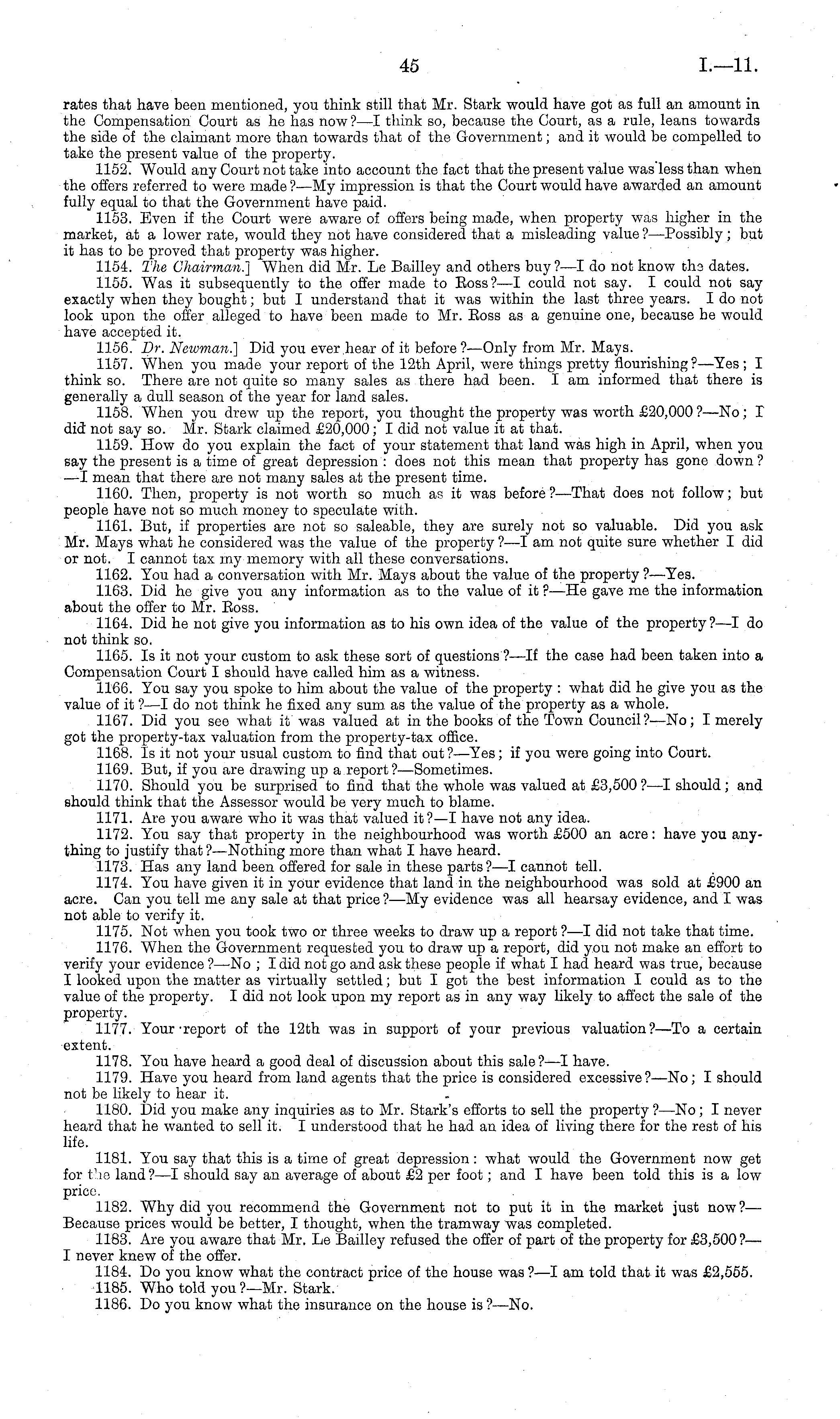 rates that have been mentioned, you think still that Mr. Stark would have got as full an amount in the Compensation Court as he has now? —I think so, because the Court, as a rule, leans towards the side of the claimant more than towards that of the Government; and it would be compelled to take the present value of the property. 1152. Would any Court not take into account the fact that the present value was less than when the offers referred to were made ?—My impression is that the Court would have awarded an amount fully equal to that the Government have paid. 1153. Even if the Court were aware of offers being made, when property was higher in the market, at a lower rate, would they not have considered that a misleading value ? —Possibly ; but it has to be proved that property was higher. 1154. The Chairman.] When did Mr. Le Bailley and others buy ?—I do not know ths dates. 1155. Was it subsequently to the offer made to Eoss?—l could not say. I could not say exactly when they bought; but I understand that it was within the last three years. Ido not look upon the offer alleged to have been made to Mr. Eoss as a genuine one, because he would have accepted it. 1156. Dr. Newman.] Did you ever hear of it before ?—Only from Mr. Mays. 1157. When you made your report of the 12th April, were things pretty flourishing?— Yes ; I think so. There are not quite so many sales as there had been. I am informed that there is generally a dull season of the year for land sales. 1158. When you drew up the report, you thought the property was worth £20,000 ?—No; I did not say so. Mr. Stark claimed £20,000; I did not value it at that. 1159. How do you explain the fact of your statement that land was high in April, when you say the present is a time of great depression : does not this mean that property has gone down ? —-I mean that there are not many sales at the present time. 1160. Then, property is not worth so much as it was before ?—That does not follow; but people have not so much money to speculate with. 1161. But, if properties are not so saleable, they are surely not so valuable. Did you ask Mr. Mays what he considered was the value of the property ?—I am not quite sure whether I did or not. I cannot tax my memory with all these conversations. 1162. You had a conversation with Mr. Mays about the value of the property ?—Yes. 1163. Did he give you any information as to the value of it ? —He gave me the information about the offer to Mr. Eoss. 1164. Did he not give you information as to his own idea of the value of the property? —I do not think so. 1165. Is it not your custom to ask these sort of questions ?—lf the case had been taken into a Compensation Court I should have called him as a witness. 1166. You say you spoke to him about the value of the property : what did he give you as the value of it ?—I do not think he fixed any sum as the value of the property as a whole. 1167. Did you see what it was valued at in the books of the Town Council?—No; I merely got the property-tax valuation from the property-tax office. 1168. Is it not your usual custom to find that out?— Yes; if you were going into Court. 1169. But, if you are drawing up a report ? —Sometimes. 1170. Should you be surprised to find that the whole was valued at £3,500 ?—I should; and should think that the Assessor would be very much to blame. 1171. Are you aware who it was that valued it?—l have not any idea. 1172. You say that property in the neighbourhood was worth £500 an acre: have you anything to justify that ?—Nothing more than what I have heard. 1173. Has any land been offered for sale in these parts? —I cannot tell. 1174. You have given it in your evidence that land in the neighbourhood was sold at £900 an acre. Can you tell me any sale at that price ? —My evidence was all hearsay evidence, and I was not able to verify it. 1175. Not when you took two or three weeks to draw up a report ?—I did not take that time. 1176. When the Government requested you to draw up a report, did you not make an effort to verify your evidence ? —No ; I did not go and ask these people if what I had heard was true, because I looked upon the matter as virtually settled; but I got the best information I could as to the value of the property. I did not look upon my report as in any way likely to affect the sale of the property. 1177. Your'report of the 12th was in support of your previous valuation?—To a certain extent. 1178. You have heard a good deal of discussion about this sale? —I have. 1179. Have you heard from land agents that the price is considered excessive?—No; I should not be likely to hear it. 1180. Did you make any inquiries as to Mr. Stark's efforts to sell the property ?—No; I never heard that he wanted to sell it. I understood that he had an idea of living there for the rest of his life. 1181. You say that this is a time of great depression: what would the Government now get for the land?—l should say an average of about £2 per foot; and I have been told this is a low price. 1182. Why did you recommend the Government not to put it in the market just now? — Because prices would be better, I thought, when the tramway was completed. 1183. Are you aware that Mr. Le Bailley refused the offer of part of the property for £3,500? — I never knew of the offer. 1184. Do you know what the contract price of the house was ? —I am told that it was £2,555. 1185. Who told you ?—Mr. Stark. 1186. Do you know what the insurance on the house is ?—No.