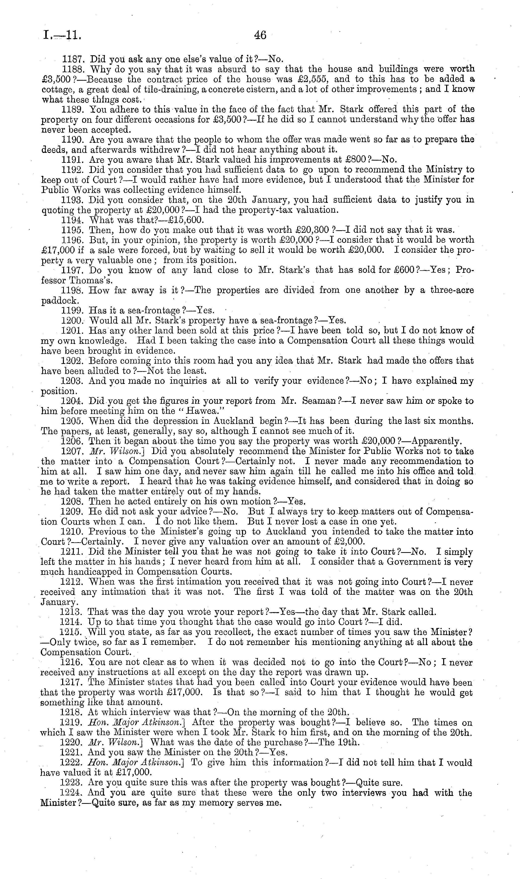 1187. Did you ask any one else's value of it? —No. 1188. Why do you say that it was absurd to say that the house and buildings were worth £3,500 ? —Because the contract price of the house was £2,555, and to this has to be added a cottage, a great deal of tile-draining, a concrete cistern, and a lot of other improvements ; and I know what these things cost. 1189. You adhere to this value in the face of the fact that Mr. Stark offered this part of the property on four different occasions for £3,500 ?-—lf he did so I cannot understand why the offer has never been accepted. 1190. Are you aware that the people to whom the offer was made went so far as to prepare the deeds, and afterwards withdrew ?—I did not hear anything about it. 1191. Are you aware that Mr. Stark valued his improvements at £800?— No. 1192. Did you consider that you had sufficient data to go upon to recommend the Ministry to keep out of Court ?—I would rather have had more evidence, but I understood that the Minister for Public Works was collecting evidence himself. 1193. Did you consider that, on the 20th January, you had sufficient data to justify you in quoting the property at £20,000 ?—I had the property-tax valuation. 1194. What was that?—£ls,6oo. 1195. Then, how do you make out that it was worth £20,300 ?—I did not say that it was. 1196. But, in your opinion, the property is worth £20,000 ? —I consider that it would be worth £17,000 if a sale were forced, but by waiting to sell it would be worth £20,000. I consider the property a very valuable one ; from its position. 1197. Do you know of any land close to Mr. Stark's that has sold for £600 ?—Yes; Professor Thomas's. 1198. How far away is it ? —The properties are divided from one another by a three-acre paddock. 1199. Has it a sea-frontage ?—Yes. ■ 1200. Would all Mr. Stark's property have a sea-frontage? —Yes. 1201. Has any other land been sold at this price ?—I have been told so, but Ido not know of my own knowledge. Had I been taking the case into a Compensation Court all these things would have been brought in evidence. 1202. Before coming into this room had you any idea that Mr. Stark had made the offers that have been alluded to ? —Not the least. 1203. And you made no inquiries at all to verify your evidence ?—No; I have explained my position. 1204. Did you get the figures in your report from Mr. Seaman?—l never saw him or spoke to him before meeting him on the " Hawea." 1205. When did the depression in Auckland begin ? —lt has been during the last six months. The papers, at least, generally, say so, although I cannot see much of it. 1206. Then it began about the time you say the property was worth £20,000 ? —Apparently. 1207. Mr. Wilson.] Did you absolutely recommend the Minister for Public Works not to take the matter into a Compensation Court ?—Certainly not. I never made any recommendation to him at all. I saw him one day, and never saw him again till he called me into his office and told me to write a report. I heard that he was taking evidence himself, and considered that in doing so he had taken the matter entirely out of my hands. 1208. Then he acted entirely on his own motion ?—Yes. 1209. He did not ask your advice?— No. But I always try to keep matters out of Compensation Courts when I can. Ido not like them. But I never lost a case in one yet. 1210. Previous to the Minister's going up to Auckland you intended to take the matter into Court ? —Certainly. I never give any valuation over an amount of £2,000. 1211. Did the Minister tell you that he was not going to take it into Court?— No. I simply left the matter in his hands; I never heard from him at all. I consider that a Government is very much handicapped in Compensation Courts. 1212. When was the first intimation you received that it was not going into Court?—l never received any intimation that it was not. The first I was told of the matter was on the 20th January. 1213. That was the day you wrote your report ?—Yes—the day that Mr. Stark called. 1214. Up to that time you thought that the case would go into Court ?—I did. 1215. Will you state, as far as you recollect, the exact number of times you saw the Minister? —Only twice, so far as I remember. Ido not remember his mentioning anything at all about the Compensation Court. 1216. You are not clear as to when it was decided not to go into the Court ?—No; I never received any instructions at all except on the day the report was drawn up. 1217. The Minister states that had you been called into Court your evidence would have been that the property was worth £17,000. Is that so ?—I said to him that I thought he would get something like that amount. 1218. At which interview was that ?—On the morning of the 20th. 1219. Son. Major Atkinson.] After the property was bought?—l believe so. The times on which I saw the Minister were when I took Mr. Stark to him first, and on the morning of the 20th. 1220. Mr. Wilson.] What was the date of the purchase ?—-The 19th. 1221. And you saw the Minister on the 20th?—Yes. 1222. Hon. Major Atkinson.] To give him this information?—l did not tell him that I would have valued it at £17,000. 1223. Are you quite sure this was after the property was bought?— Quite sure. 1224. And you are quite sure that these were the only two interviews you had with the Minister? —Quite sure, as far as my memory serves me.