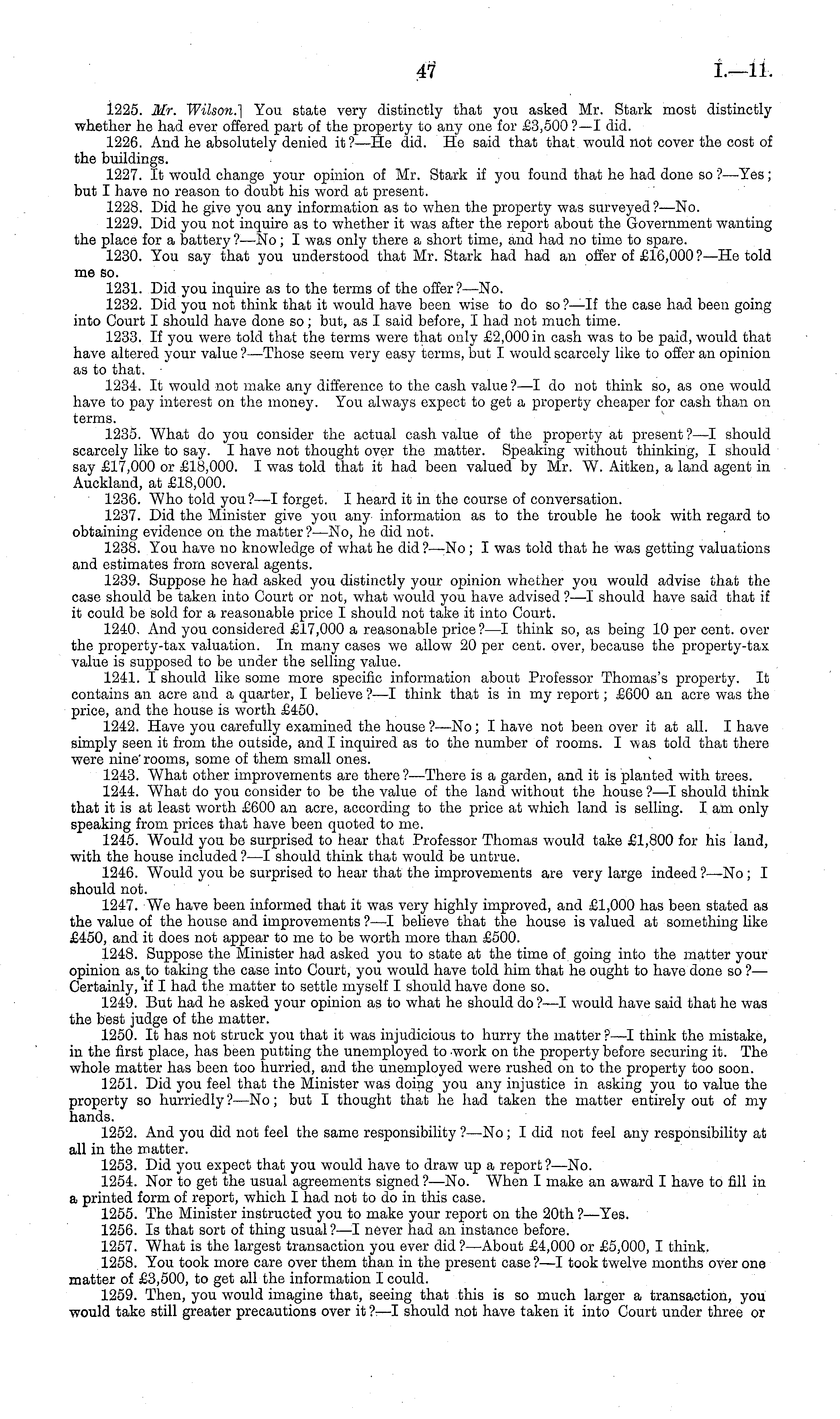 1225. Mr. Wilson.'] You state very distinctly that you asked Mr. Stark most distinctly whether he had ever offered part of the property to any one for £3,500 ?—I did. 1226. And he absolutely denied it?—He did. He said that that would not cover the cost of the buildings. 1227. It would change your opinion of Mr. Stark if you found that he had done so'?— Yes; but I have no reason to doubt his word at present. 1228. Did he give you any information as to when the property was surveyed? —No. 1229. Did you not inquire as to whether it was after the report about the Government wanting the place for a battery ?—No; I was only there a short time, and had no time to spare. 1230. You say that you understood that Mr. Stark had had an offer of £16,000 ? —He told me so. 1231. Did you inquire as to the terms of the offer?— No. 1232. Did you not think that it would have been wise to do so?—lf the case had been going into Court I should have done so; but, as I said before, I had not much time. 1233. If you were told that the terms were that only £2,000 in cash was to be paid, would that have altered your value ?—Those seem very easy terms, but I would scarcely like to offer an opinion as to that. 1234. It would not make any difference to the cash value? —I do not think so, as one would have to pay interest on the money. You always expect to get a property cheaper for cash than on terms. 1235. What do you consider the actual cash value of the property at present ?—I should scarcely like to say. I have not thought over the matter. Speaking without thinking, I should say £17,000 or £18,000. I was told that it had been valued by Mr. W. Aitken, a land agent in Auckland, at £18,000. 1236. Who told you?—l forget. I heard it in the course of conversation. 1237. Did the Minister give you any information as to the trouble he took with regard to obtaining evidence on the matter? —No, he did not. 1238. You have no knowledge of what he did ?— : No ; I was told that he was getting valuations and estimates from several agents. 1239. Suppose he had asked you distinctly your opinion whether you would advise that the case should be taken into Court or not, what would you have advised ?—I should have said that if it could be sold for a reasonable price I should not take it into Court. 1240. And you considered £17,000 a reasonable price? —I think so, as being 10 per cent, over the property-tax valuation. In many cases we allow 20 per cent, over, because the property-tax value is supposed to be under the selling value. 1241. I should like some more specific information about Professor Thomas's property. It contains an acre and a quarter, I believe ?—I think that is in my report; £600 an acre was the price, and the house is worth £450. 1242. Have you carefully examined the house ? —No; I have not been over it at all. I have simply seen it from the outside, and I inquired as to the number of rooms. I was told that there were nine'rooms, some of them small ones. 1243. What other improvements are there ?—There is a garden, and it is planted with trees. 1244. What do you consider to be the value of the land without the house ? —I should think that it is at least worth £600 an acre, according to the price at which land is selling. lam only speaking from prices that have been quoted to me. 1245. Would you be surprised to hear that Professor Thomas would take £1,800 for his land, with the house included ?—I should think that would be untrue. 1246. Would you be surprised to hear that the improvements are very large indeed ?—-No; I should not. 1247. We have been informed that it was very highly improved, and £1,000 has been stated as the value of the house and improvements ? —I believe that the house is valued at something like £450, and it does not appear to me to be worth more than £500. 1248. Suppose the Minister had asked you to state at the time of going into the matter your opinion as_to taking the case into Court, you would have told him that he ought to have done so ?— Certainly, if I had the matter to settle myself I should have done so. 1249. But had he asked your opinion as to what he should do ?—I would have said that he was the best judge of the matter. 1250. It has not struck you that it was injudicious to hurry the matter ?—I think the mistake, in the first place, has been putting the unemployed to -work on the property before securing it. The whole matter has been too hurried, and the unemployed were rushed on to the property too soon. 1251. Did you feel that the Minister was doing you any injustice in asking you to value the property so hurriedly?—No; but I thought that he had taken the matter entirely out of my hands. 1252. And you did not feel the same responsibility ?—No; I did not feel any responsibility at all in the matter. 1253. Did you expect that you would have to draw up a report?— No. 1254. Nor to get the usual agreements signed ?—No. When I make an award I have to fill in a printed form of report, which I had not to do in this case. 1255. The Minister instructed you to make your report on the 20th ?—Yes. 1256. Is that sort of thing usual?—l never had an instance before. 1257. What is the largest transaction you ever did?— About £4,000 or £5,000, I think. 1258. You took more care over them than in the present case ?—I took twelve months over one matter of £3,500, to get all the information I could. 1259. Then, you would imagine that, seeing that this is so much larger a transaction, you would take still greater precautions over it ?■ —I should not have taken it into Court under three or
