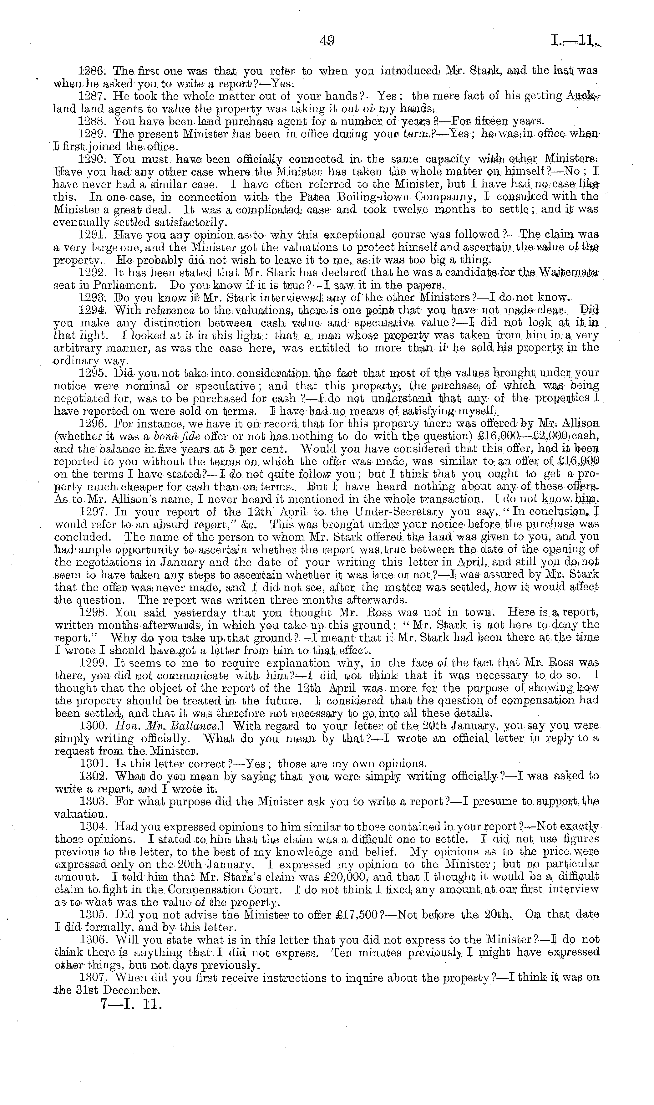 1286. The first one was that you refer to when you introduced Mr. Stark, and the last was when he asked you to write a report ?' —Yes. 1287. He took the whole matter out of your hands?— Yes ; the mere fact of his getting Auck,land land agents to value the property was taking it out of my hands. 1288. You have been land purchase agent for a number of years ? —For fifteen years. 1289. The present Minister has been in office during your term? —Yes; he was ; in office when I first joined the office. 1290. You must have been officially connected in, the same capacity with other Ministers. Have you had: any other case where the Minister has taken the whole matter on, himself ?—No ; I have never had a similar case. I have often referred to the Minister, but I have had no case like this. In ono case, in connection with the Patea Boiling-down Coinpanriy, I consulted with the Minister a great deal. It was a complicated case and took twelve months to settle; and it. was eventually settled satisfactorily. 1291. Have you any opinion as to why this exceptional course was followed ?—The claim was a very large one, and the Minister got the valuations to protect himself and ascertain the value of the property. He probably did not wish to leave it to me, as it was too big a thing. 1292. It has been stated that Mr. Stark has declared that he was a candidate for the Waitemaita seat in Parliament. Do you know if it is true ? —I saw it in the papers. 1293. Do you know if. Mr. Stark interviewed; any of the other Ministers? —I do,not know. 1294. With reference to the valuations, there is one point that you have not made clear,: DiiJ you make any distinction between cash value and speculative value ?—I did not look at it in that light. I looked at it in this light : that a man whose property was taken from him in a very arbitrary manner, as was the case here, was entitled to more than if he sold his property, in the ordinary way. 1295. Did you not take into, consideration the fact that most of the values brought under your notice were nominal or speculative ; and that this property, the purchase of which was being negotiated for, w r as to be purchased for cash ? —I do not understand that any of the properties I have reported on were sold on terms. I have had no means of satisfying myself. 1296. For instance, we have it on record that for this property there was offered by Mr. Allison (whether it was a bond fide offer or not has nothing to do with the question) £16,000—£2,000) cash, and the balance in five years, at 5 per cent. Would you have considered that this offer, had it been reported to you without the terms on which the offer was made, was similar to an offer of £16,000 on the terms I have stated? —I do not quite follow you; but I think that you ought to get a property much, cheaper for cash than on terms. But 1 have heard nothing about any of these offers. As to Mr. Allison's name, I never heard it mentioned in the whole transaction. Ido not know him. 1297. In your report of the 12th April to the Under-Secretary you say, "In conclusion, I would refer to an absurd report," &c. This was brought under your notice before the purchase was concluded. The name of the person to whom Mr. Stark offered the land was given to you, and you had ample opportunity to ascertain whether the report was true between the date of the opening of the negotiations in January and the date of your writing this letter in April, and still you dp, not seem to have taken any stops to ascertain whether it was true or not ?—I was assured by Mr. Stark that the offer was, never made, and I did not see, after the matter was settled, how it would affect the question. The report was written three months afterwards. 1298. You said yesterday that you thought Mr. Boss was not in town. Here is a report, written months afterwards, in which you take up this ground: " Mr. Stark is not here to deny the report." Why do you take up that ground ?^—l meant that if Mr. Stark had been there at the time I wrote I should have got a letter from him to that effect. 1299. It seems to me to require explanation why, in the face of the fact that Mr. Ross was there, you did not communicate with him? —I did not think that it was necessary to do so. I thought that the object of the report of the 12th April was more for the purpose of showing how the property should be treated in the future. I considered that the question of compensation had been settled, and that it was therefore not necessary to go into all these details. 1300. Hon. Mr. Ballance.} With regard to your letter of the 20th January, you say you were simply writing officially. What do you mean by that ? —I wrote an official letter in reply to a request from the Minister. 1301. Is this letter correct? —Yes; those are my own opinions. 1302. What do you mean by saying that you were simply writing officially?—l was asked to write a report, and I wrote it. 1303. For what purpose did the Minister ask you to write a report? —I presume to support.the valuation. 1304. Had you expressed opinions to him similar to those contained in your report ? —Not exactly those opinions. I stated to him that the claim was a difficult one to settle. I did not use figures previous to the letter, to the best of my knowledge and belief. My opinions as to the price were expressed only on the 20th January. I expressed my opinion to the Minister; but no particular amount. I told him that Mr. Stark's claim was £20,000, and that I thought it would be a difficult claim to, fight in the Compensation Court. Ido not think I fixed any amount at our first interview as to, what was the value of the property. 1305. Did you not advise the Minister to offer £17,500?—N0t before the 20th. On that date I did formally, and by this letter. 1306. Will you state what is in this letter that you did not express to the Minister? —I do not think there is anything that I did not express. Ten minutes previousl