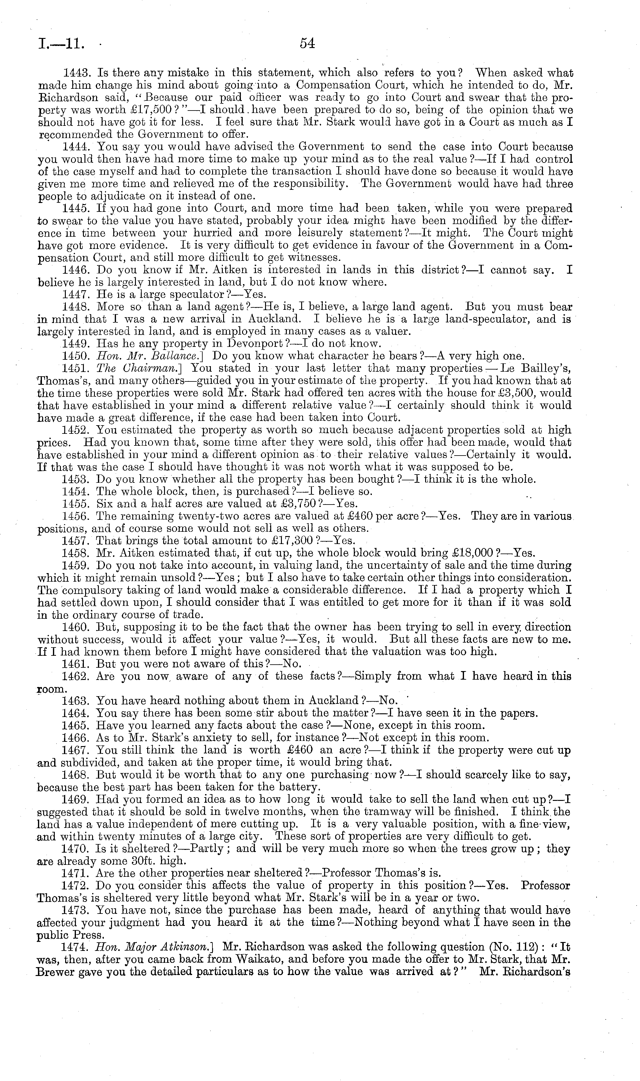 1443. Is there any mistake in this statement, which also refers to you ? When asked what made him change his mind about going into a Compensation Court, which he intended to do, Mr. Eichardson said, "Because our paid officer was ready to go into Court and swear that the property was worth £17,500?" —I should.have been prepared to do so, being of the opinion that we should not have got it for less. I feel sure that Mr. Stark would have got in a Court as much as I recommended the Government to offer. 1444. You say you would have advised the Government to send the case into Court because you would then have had more time to make up your mind as to the real value ?—lf I had control of the case myself and had to complete the transaction I should have done so because it would have given me more time and relieved me of the responsibility. The Government would have had three people to adjudicate on it instead of one. 1445. If you had gone into Court, and more time had been taken, while you were prepared to swear to the value you have stated, probably your idea might have been modified by the difference in time between your hurried and more leisurely statement?—lt might. The Court might have got more evidence. It is very difficult to get evidence in favour of the Government in a Compensation Court, and still more difficult to get witnesses. 1446. Do you know if Mr. Aitken is interested in lands in this district ?—I cannot say. I believe he is largely interested in land, but I do not know where. 1447. He is a large speculator?— Yes. 1448. More so than a land agent?—He is, I believe, a large land agent. But you must bear in mind that I was a new arrival in Auckland. I believe he is a large land-speculator, and is largely interested in land, and is employed in many cases as a valuer. 1449. Has he any property in Devonport ?—I do not know. 1450. Hon. Mr. Ballanoe.] Do you know what character he bears ?—A very high one. 1451. The Chairman.] You stated in your last letter that many properties : —Le Bailley's, Thomas's, and many others—guided you in your estimate of the property. If you had known that at the time these properties were sold Mr. Stark had offered ten acres with the house for £3,500, would that have established in your mind a different relative value ?—I certainly should think it would have made a great difference, if the case had been taken into Court. 1452. You estimated the property as worth so much because adjacent properties sold at high prices. Had you known that, some time after they were sold, this offer had been made, would that have established in your mind a different opinion as to their relative values ?—Certainly it would. If that was the case I should have thought it was not worth what it was supposed to be. 1453. Do you know whether all the property has been bought ? —I think it is the whole. 1454. The whole block, then, is purchased ?—I believe so. 1455. Six and a half acres are valued at £3,750? —Yes. 1456. The remaining twenty-two acres are valued at £460 per acre ? —Yes. They are in various positions, and of course some would not sell as well as others. 1457. That brings the total amount to £17,300 ?—Yes. 1458. Mr. Aitken estimated that, if cut up, the whole block would bring £18,000 ? —Yes. 1459. Do you not take into account, in valuing land, the uncertainty of sale and the time during which it might remain unsold? —Yes ; but I also have to take certain other things into consideration. The compulsory taking of land would make a considerable difference. If I had a property which I had settled down upon, I should consider that I was entitled to get more for it than if it was sold in the ordinary course of trade. 1460. But, supposing it to be the fact that the owner has been trying to sell in every, direction without success, would it affect your value ?—Yes, it would. But all these facts are new to me. If I had known them before I might have considered that the valuation was too high. 1461. But you were not aware of this? —No. 1462. Are you now aware of any of these facts?— Simply from what I have heard in this room. 1463. You have heard nothing about them in Auckland ? —No. 1464. You say there has been some stir about the matter?—l have seen it in the papers. 1465. Have you learned any facts about the case ?—None, except in this room. 1466. As to Mr. Stark's anxiety to sell, for instance?— Not except in this room. 1467. You still think the land is worth £460 an acre? —I think if the property were cut up and subdivided, and taken at the proper time, it would bring that. 1468. But would it be worth that to any one purchasing now ?-*—l should scarcely like to say, because the best part has been taken for the battery. 1469. Had you formed an idea as to how long it would take to sell the land when cut up?—l suggested that it should be sold in twelve months, when the tramway will be finished. I think, the land has a value independent of mere cutting up. It is a very valuable position, with a fine-view, and within twenty minutes of a large city. These sort of properties are very difficult to get. 1470. Is it sheltered ? —Partly ; and will be very much more so when the trees grow up ; they are already some 30ft. high. 1471. Are the other properties near sheltered?— Professor Thomas's is. 1472. Do you consider this affects the value of property in this position?— Yes. Professor Thomas's is sheltered very little beyond what Mr. Stark's will be in a year or two. 1473. You have not, since the purchase has been made, heard of anything that would have affected your judgment had you heard it at the time ?—Nothing beyond what I have seen in the public Press. 1474. Hon. Major Atkinson.} Mr. Eichardson was asked the following question (No. 112): "It was, then, after you came back from Waikato, and before you made the offer to Mr. Stark, that Mr. Brewer gave you the detailed particulars as to how the value was arrived