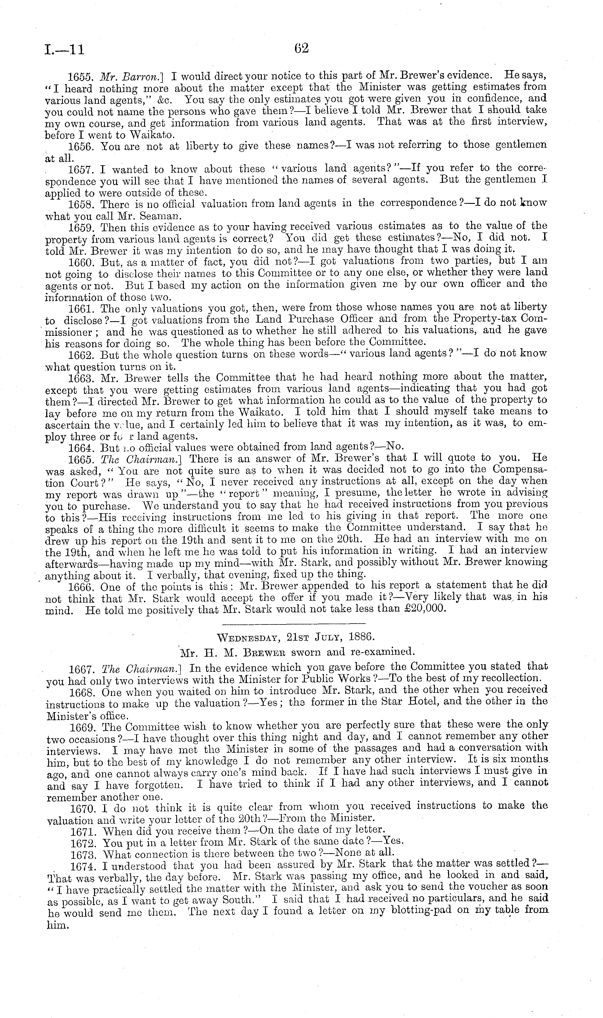 Wednesday, 21st July, 1886. Mr. H. M. Beeweb sworn and re-examined. 1667. The Chairman.] In the evidence which you gave before the Committee you stated that you had only two interviews with the Minister for Public Works '!— To the best of my recollection. 1668. One when you waited on him to introduce Mr. Stark, and the other when you received instructions to make up the valuation ?—Yes ; the former in the Star Hotel, and the other in the Minister's office. 1669. The Committee wish to know whether you are perfectly sure that these were the only two occasions ?—I have thought over this thing night and day, and I cannot remember any other interviews. I may have met the Minister in some of the passages and had a conversation with him, but to the best of my knowledge I do not remember any other interview. It is six months a"-o,' and one cannot always carry one's mind back. If I have had such interviews I must give in and say I have forgotten. I have tried to think if I had any other interviews, and I cannot remember another one. 1670. I do not think it is quite clear from whom you received instructions to make the valuation and write your letter of the 20th ?—From the Minister. 1671. When did you receive them ?—On the date of my letter. 1672. You put in a letter from Mr. Stark of the same date ?—Yes. 1673. What connection is there between the two ?—None at all. 1674. I understood that you had been assured by Mr. Stark that the matter was settled ?— That was verbally, the day before. Mr. Stark was passing my office, and he looked in and said, " I have practically settled the matter with the Minister, and ask you to send the voucher as soon as possible, as I want to get away South." I said that I had received no particulars, and he said he would send me them. The next day I found a letter on my blotting-pad on my table from him.