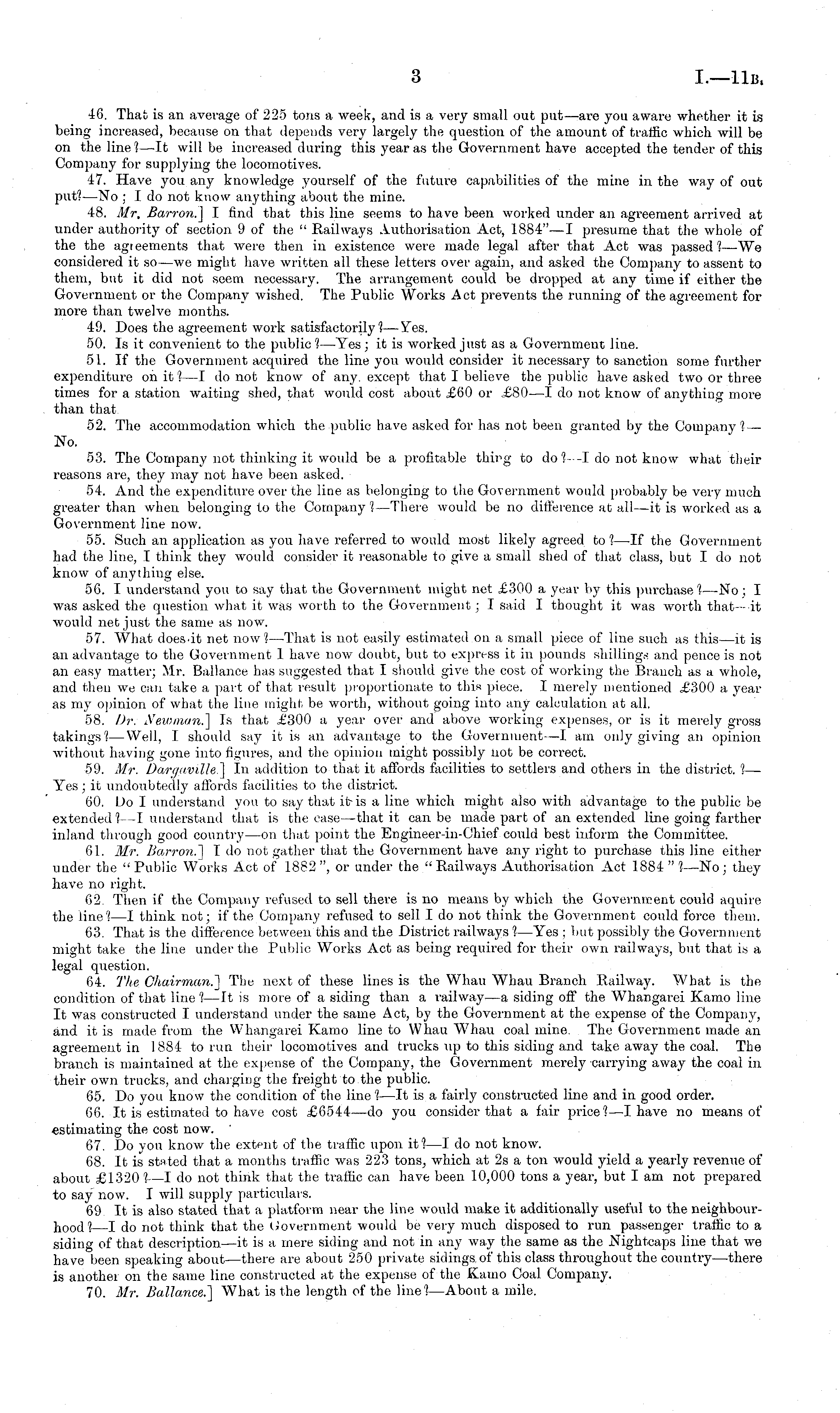 46. That is an average of 225 tons a week, and is a very small out put —are you aware whether it is being increased, because on that depends very largely the question of the amount of traffic which will be on the line ?—lt will be increased during this year as the Government have accepted the tender of this Company for supplying the locomotives. 47. Have you any knowledge yourself of the future capabilities of the mine in the way of out put?—No ; I do not know anything about the mine. 48. Mr. Barron.] I find that this line seems to have been worked under an agreement arrived at under authority of section 9 of the " Railways Authorisation Act, 1884"—I presume that the whole of the the agreements that were then in existence were made legal after that Act was passed ?—We considered it so—we might have written all these letters over again, and asked the Company to assent to them, but it did not seem necessary. The arrangement could be dropped at any time if either the Government or the Company wished. The Public Works Act prevents the running of the agreement for more than twelve months. 49. Does the agreement work satisfactorily?— Yes. 50. Is it convenient to the public?— Yes; it is worked just as a Government line. 51. If the Government acquired the line you would consider it necessary to sanction some further expenditure on it ?—I do not know of any. except that I believe the public have asked two or three times for a station waiting shed, that would cost about £60 or £80—I do not know of anything more than that 52. The accommodation which the public have asked for has not been granted by the Company ? — No. 53. The Company not thinking it would be a profitable thing to do ?---I do not know what their reasons are, they may not have been asked. 54. And the expenditure over the line as belonging to the Government would probably be very much greater than when belonging to the Company ?—There would be no difference at all—it is worked as a Government line now. 55. Such an application as you have referred to would most likely agreed to ?—lf the Government had the line, I think they would consider it reasonable to give a small shed of that class, but I do not know of anything else. 56. I understand you to say that the Government might net £300 a year by this purchase?—No; I was asked the question what it was worth to the Government ; I said I thought it was worth that- it would net just the same as now. 57. What does-it net now?— That is not easily estimated on a small piece of line such as this—it is an advantage to the Government 1 have now doubt, but to express it in pounds shillings and pence is not an easy matter; Mr. Ballance has suggested that I should give the cost of working the Branch as a whole, and then we can take a part of that result proportionate to this piece. I merely mentioned £300 a year as my opinion of what the line might be worth, without going into any calculation at all. 58. Dr. Newman.] Is that £300 a year over and above working expenses, or is it merely gross takings?— Well, I should say it is an advantage to the Government—l am only giving an opinion without having gone into figures, and the opinion might possibly not be correct. 59. Mr. Dargaville'] In addition to that it affords facilities to settlers and others in the district. ?— Yes; it undoubtedly affords facdities to the district. 60. Do I understand you to say that it-is a line which might also with advantage to the public be extended?—l understand that is the case—that it can be made part of an extended line going farther inland through good country—on that point the Engineer-in-Chief could best inform the Committee. 61. Mr. Barron.] I do not gather that the Government have any right to purchase this line either under the " Public Works Act of 1882 ", or under the " Railways Authorisation Act 1884 " ?—No; they have no right. 62. Then if the Company refused to sell there is no means by which the Government could aquire the line?—l think not; if the Company refused to sell Ido not think the Government could force them. 63. That is the difference between this and the District railways ?—Yes ; but possibly the Government might take the line under the Public Works Act as being required for their own railways, but that is a legal question. 64. The Chairman.] The next of these lines is the Whau Whau Branch Railway. What is the condition of that line ?—lt is more of a siding than a railway—a siding off the Whangarei Kamo line It was constructed I understand under the same Act, by the Government at the expense of the Company, and it is made from the Whangarei Kamo line to Whau Whau coal mine. The Government made an agreement in 1884 to run their locomotives and trucks up to this siding and take away the coal. The branch is maintained at the expense of the Company, the Government merely carrying away the coal in their own trucks, and charging the freight to the public. 65. Do you know the condition of the line ?—lt is a fairly constructed line and in good order. 66. It is estimated to have cost £6544 —do you consider that a fair price?—l have no means of estimating the cost now. ' 67. Do you know the extent of the traffic upon it?—l do not know. 68. It is stated that a months traffic was 223 tons, which at 2s a ton would yield a yearly revenue of about £1320 ?—I do not think that the traffic can have been 10,000 tons a year, but lam not prepared to say now. I will supply particulars. 69 It is also stated that a platform near the line would make it additionally useful to the neighbourhood? Ido not think that the Government would be very much disposed to run passenger traffic to a siding of that description—it is a mere siding and not in any way the same as the Nightcaps line that we have been speaking about—there are about 250 private sidings of this class throughout the country—there is another on the same line constructed at the expense of