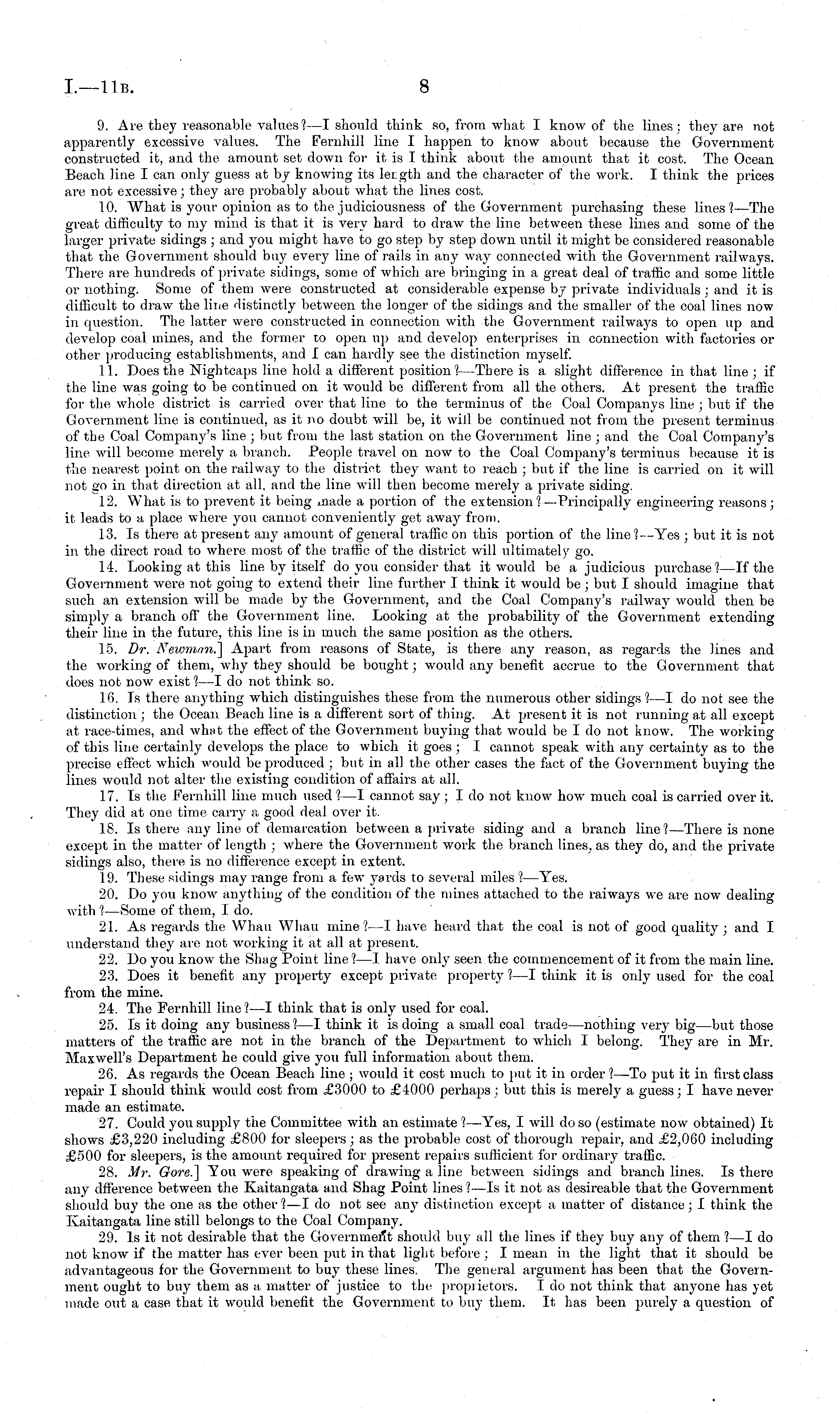 9. Are they reasonable values? —I should think so, from what I know of the lines : they are not apparently excessive values. The Fernhill line I happen to know about because the Government constructed it, and the amount set down for it is I think about the amount that it cost. The Ocean Beach line I can only guess at by knowing its ler.gth and the character of the work. I think the prices are not excessive; they are probably about what the lines cost. 10. What is your opinion as to the judiciousness of the Government purchasing these lines? —The great difficulty to my mind is that it is very hard to draw the line between these lines and some of the larger private sidings ; and you might have to go step by step down until it might be considered reasonable that the Government should buy every line of rails in any way connected with the Government railways. There are hundreds of private sidings, some of which are bringing in a great deal of traffic and some little or nothing. Some of them were constructed at considerable expense by private individuals ; and it is difficult to draw the line distinctly between the longer of the sidings and the smaller of the coal lines now in question. The latter were constructed in connection with the Government railways to open up and develop coal, mines, and the former to open up and develop enterprises in connection with factories or other producing establishments, and I can hardly see the distinction myself. 11. Does the Nightcaps line hold a different position?— There is a slight difference in that line ; if the line was going to be continued on it would be different from all the others. At present the traffic for the whole district is carried over that line to the terminus of the Coal Companys line ; but if the Government line is continued, as it no doubt will be, it will be continued not from the present terminus of the Coal Company's line ; but from the last station on the Government line ; and the Coal Company's line -will become merely a branch. People travel on now to the Coal Company's terminus because it is the nearest point on the railway to the district they want to reach ; but if the line is carried on it will not go in that direction at all, and the line will then become merely a private siding. 12. What is to prevent it being made a portion of the extension?— Principally engineering reasons; it leads to a place where you cannot conveniently' get away from. 13. Is there at present any amount of general traffic on this portion of the line?— Yes ; but it is not in the direct road to where most of the traffic of the district will ultimately go. 14. Looking at this line by itself do you consider that it would be a judicious purchase?—lf the Government were not going to extend their line further I think it would be ; but I should imagine that such an extension will be made by the Government, and the Coal Company's railway would then be simply a branch off the Government line. Looking at the probability of the Government extending their line in the future, this line is in much the same position as the others. 15. Dr. Newman.] Apart from reasons of State, is there any reason, as regards the lines and the working of them, why they should be bought; would any benefit accrue to the Government that does not now exist ?—I do not think so. 16. Is there anything which distinguishes these from the numerous other sidings?—l do not see the distinction ; the Ocean Beach line is a different sort of thing. At present it is not running at all except at race-times, and what the effect of the Government buying that would be Ido not know. The working of this line certainly develops the place to which it goes ; I cannot speak with any certainty as to the precise effect which would be produced ; but in all the other cases the fact of the Government buying the lines would not alter the existing condition of affairs at all. 17. Is the Fernhill line much used ?—I cannot say ;I do not know how much coal is carried over it. They did at one time carry a good deal over it. 18. Is there any line of demarcation between a private siding and a branch line?— There is none except in the matter of length ; where the Government work the branch lines, as they do, and the private sidings also, there is no difference except in extent. 19. These sidings may range from a few yards to several miles ?—Yes. 20. Do you know anything of the condition of the mines attached to the raiways we are now dealing with I —Some of them, I do. 21. As regards the Whau Whau mine?—l have heard that the coal is not of good quality ; and I understand they are not working it at all at present. 22. Do you know the Shag Point line ?—I have only seen the commencement of it from the main line. 23. Does it benefit any property except private property ?—I think it is only used for the coal from the mine. 24. The Fernhill line ?—I think that is only used for coal. 25. Is it doing any business?—l think it is doing a small coal trade—nothing very big—but those matters of the traffic are not in the branch of the Department to which I belong. They are in Mr. Maxwell's Department he could give you full information about them. 26. As regards the Ocean Beach line ; would it cost much to put it in order ?—To put it in first class repair I should think would cost from £3000 to £4000 perhaps; but this is merely a guess; I have never made an estimate. 27. Could you supply the Committee with an estimate ?—Yes, I will do so (estimate now obtained) It shows £3,220 including £800 for sleepers; as the probable cost of thorough repair, and £2,060 including £500 for sleepers, is the amount required for present repairs sufficient for ordinary traffic. 28. Mr. Gore.] You were speaking of drawing a line between sidings and branch lines. Is there any dfference between the Kaitangata and Shag Point lines ?—ls it not as desireable that the Government should buy the one as the other I —l 