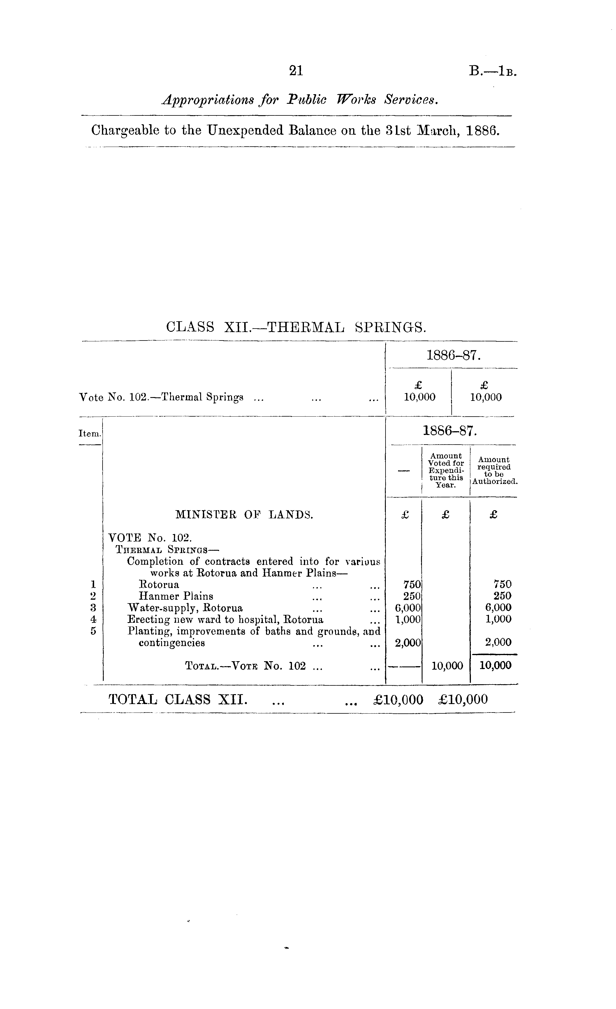 1886-87. Vote No. 102. —Thermal Springs ... £ 10,000 £ 0,000 !tem. 18S6-8 Amount Voted for Expenditure this Year. Amount required to be Authorized. MINISTER OF LANDS. £ £ VOTE No. 102. Thermal Spkengs— Completion of contracts entered into for various works at Eotorua and Hanmer Plains— 1 Kotorua 2 Hanmer Plains 3 Water-supply, Botorua 4 Erecting new ward to hospital, Eotorua 5 Planting, improvements of baths and grounds, aDd contingencies 1 '> :s ■L 5 750 250 0,000 1,000 750 250 6,000 1,000 2,000 2,000 Total.—Vote No. 102 ... 10,000 10,000 TOTAL CLASS XII. £ .0,00 £10, '00