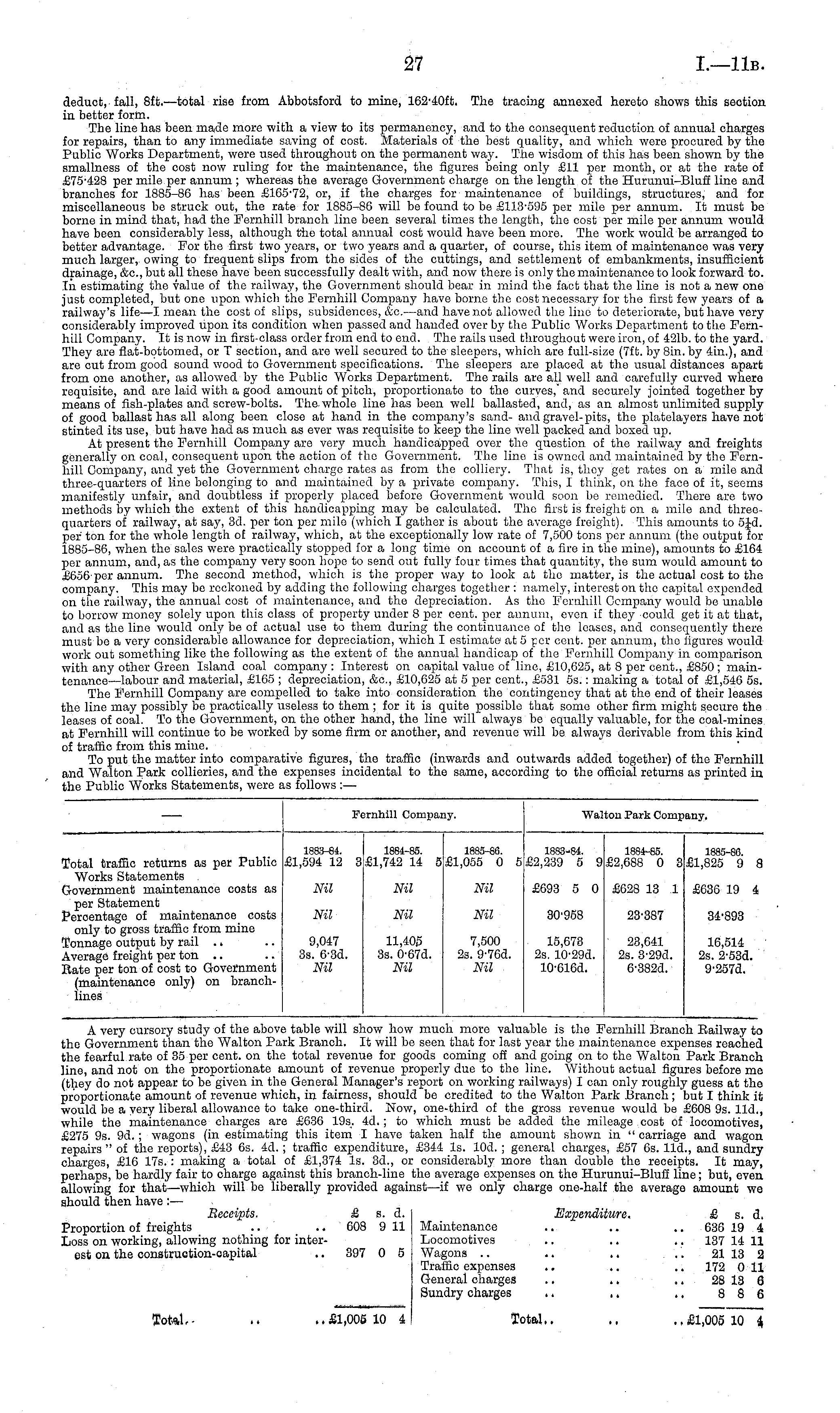 :mhill Compai iy. Wal ;on Park Company. Jotal traffic returns as per Public Works Statements rovernment maintenance costs as per Statement •ercentage of maintenance costs only to gross traffic from mine 'onnage output by rail ., iverage freight per ton late per ton of cost to Government (maintenance only) on branchlines 1883-84. £1,594 12 3 1884-85. £1,742 14 5 1885-86. £1,055 0 5 1883-84. £2,239 5 9 1884-85. £2,688 0 3 1885-86. £1,825 9 8 Nil Nil Nil £693 5 0 £628 13 1 £636 19 4 Nil Nil Nil 30-958 23-387 34-893 9,047 3s. 6-3d. Nil 11,405 3s. 0-67d. Nil 7,500 2s. 9-76d. Nil 15,673 2s. 10-29d. 10'616d. 23,641 2s. 3-29d. 6-382d. 16,514 2s. 2-53d. 9-257d.