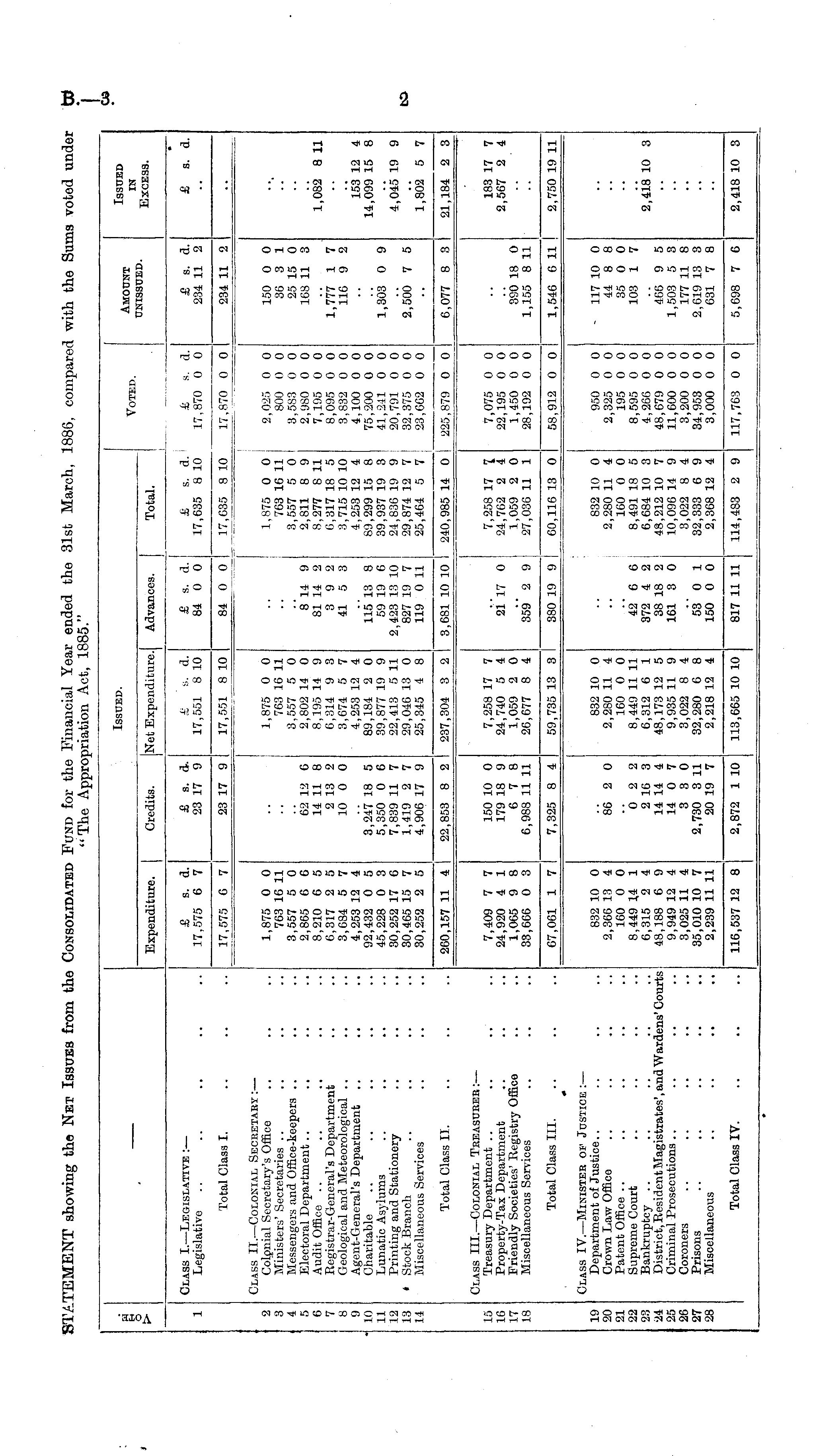 a £1 o > Issued. Voted. Amount unissued. Issued IN Excess. Expenditure. Credits. |Ket Expenditure. Advances. Total. Class I.—Legislative :— Legislative £ s. d. 17,575 6 7 £, s. d,. 23 17 9 £ s. d. 17,551 8 10 £ s. d. 84 0 0 k. s. d. 17,635 8 10 & s. d. 17,870 0 0 £ s. d. 234 11 2 £, s. d. Total Class I. 17,575 G 7 23 17 9 17,551 8 10 84 0 0 17,635 8 10 17,870 0 0 234 11 2 2 3 4 5 6 7 8 9 ID II 13 II Class II. —Colonial Secbetaky :— Colonial Secretary's Office Ministers' Secretaries Messengers and Office-keepers Electoral Department.. .. .. .. Audit Office Registrar-General's Department Geological and Meteorological .. .. Agent-General's Department Charitable Lunatic Asylums Printing and Stationery * Stock Branch Miscellaneous Services 1,875 0 0 763 16 11 3,557 5 0 2,865 6 6 8,210 6 5 0,317 2 5 3,684 5 7 4,253 12 4 92,432 0 5 45,228 0 3 30,252 17 6 30,405 15 7 30,252 2 5 62 12 G 14 11 8 2 13 2 10 0 0 1,875 0 0 763 16 11 3.557 5 0 2,802 14 0 8,195 14 9 6,314 9 3 3,674 5 7 4,253 12 4 89,184 2 0 39,877 19 9 22,413 5 11 29,040 13 0 25,345 4 8 8 14 9 81 14 2 3 9 2 41 5 3 1,875 0 0 763 16 11 3,557 5 0 2,811 8 9 .8,277 8 11 0,317 18 5 3,715 10 10 4,253 12 4 89,299 15 8 39,937 19 3 24,836 19 9 29,874 12 7 25,464 5 7 2,025 0 0 800 0 0 3,583 0 0 2,980 0 0 7,195 0 0 8,095 0 0 3,832 0 0 4,100 0 0 75,200 0 0 41,211 0 0 20,791 0 0 32,375 0 0 23,662 0 0 150 0 0 36 3 1 25 15 0 168 11 3 1,777 1 7 116 9 2 ••• •■ - 1,082 8 11 •• 3,247 18 5 5,350 0 G 7,839 11 7 1,419 2 7 4,900 17 9 115 13 8 59 19 6 2,423 13 10 827 19 7 119 0 11 - 153 12 4 14,099 15 8 1,303 0 9 4,045 19 9 2,500 7 5 1,802 5 7 - Total Class IT. ! I 0,077 8 3 I I 21,184 2 3 260,157 11 4 22,853 8 2 237,304 3 2 3,681 10 10 240,985 14 0 225,879 0 0 15 16 17 18 Class III. —Colonial Tbeasueeb :— Treasury Department Property-Tax Department Friendly Societies' Registry Office Miscellaneous Services 7,409 7 7 24,920 4 1 1,065 9 8 33,666 0 3 150 10 0 179 18 9 6 7 8 6,988 11 11 7,258 17 7 24,740 5 4 1,059 2 0 26,677 8 4 2117 0 7,258 17 7. 24,762 2 4 1,059 2 0 27,036 11 1 7,075 0 0 22,195 0 0 1,450 0 0 28,192 0 0 390 18 0 1,155 8 11 183 17 7 2,5G7 2 4 359' 2 9 Total Class III. 07,061 1 7 7,325 8 4 59,735 13 3 380 19 9 60,116 13 0 58,912 0 0 1,540 G 11 2,750 19 11 19 20 22 •21 25 27 38 Class IV. —Ministeb oe Justice :— Department of Justice.. Crown Law Office Patent Office Supreme Court Bankruptcy District, Resident Magistrates', and Wardens' Courts Criminal Prosecutions Coroners Prisons Miscellaneous 832 10 0 2,366 13 4 160 0 0 8,449 14 1 6,315 2 4 48,188 6 9 9,949 12 4 3,025 11 4 35,010 10 7 2,239 11 11 86 2 0 0 2 2 2 16 3 14 14 4 14 0 7 3 3 0 2,730 3 11 20 19 7 832 10 0 2,2S0 11 4 160 0 0 8,449 11 11 6,312 G 1 48,173 12 5 9,935 11 9 3,022 8 4 32,280 G 8 2,218 12 4 42 6 6 372 4 2 38 18 2 161 3 0 832 30 0 2,280 11 4 160 0 0 8,491 18 5 6,684 10 3 48,212 10 7 10,096 14 9 3,022 8 4 32,333 6 9 2,368 12 4 950 0 0 2,325 0 0 195 0 0 8,595 0 0 4,260 0 0 48,679 0 0 11,000 0 0 3,200 0 0 34,953 0 0 3,000 0 0 117 10 0 44 8 8 35 0 0 103 1 7 400 9 5 1,503 5 3 177 11 8 2,619 13 3 631 7 8 2,418 10 3 53 0 1 150 0 0 Total Class IV. 116,537 12 8 2,872 1 10 113,665 10 10 817 11 11 114,483 2 9 117,703 0 0 5,698 7 6 2,418 10 3
