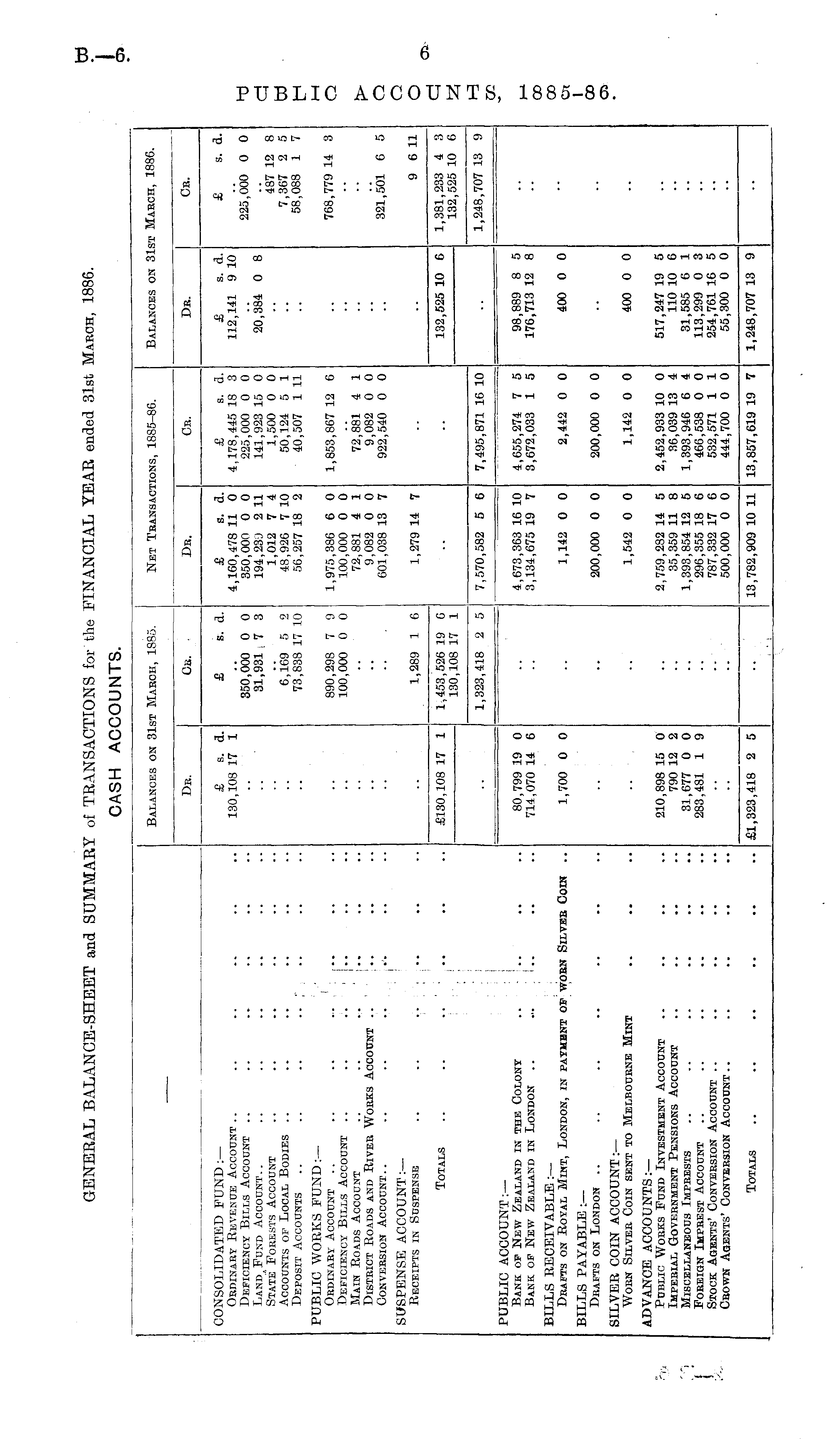 GENERAL BALANCE-SHEET and SUMMARY of TRANSACTIONS for the FINANCIAL YEAR ended 31st March, 1886. CASH ACCOUNTS.