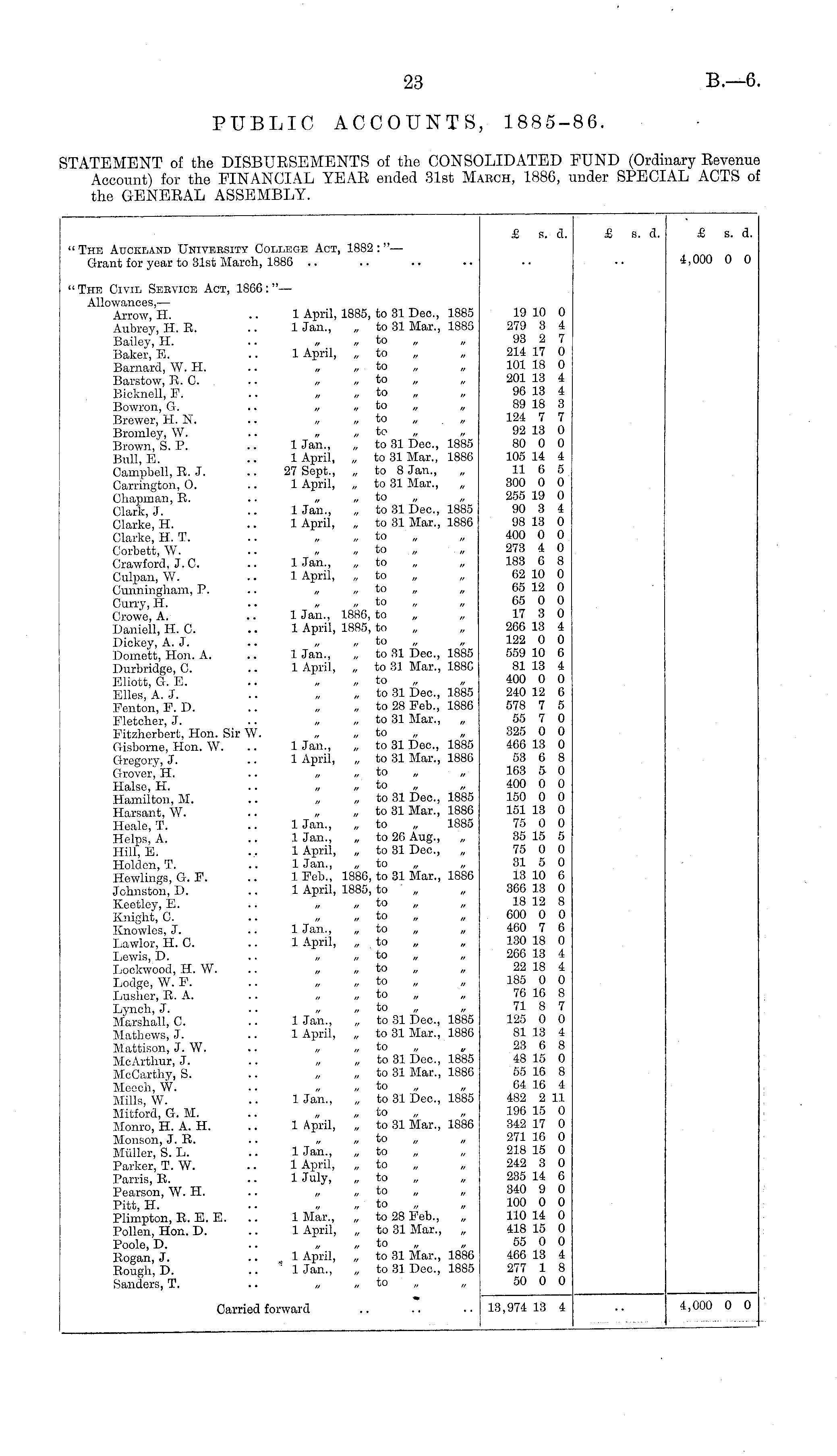 £ s. a. £ s. a. £ s. a. " The Auckland University College Act, 1882 : "— Grant for year to 31st March, 1886 4,000 0 0 "The Civil Service Act, 1866:"— Allowances, — Arrow, H. .. 1 April, 1885, to 31 Dec, 1885 Aubrey, H. R. .. 1 Jan., „ to 31 Mar., 1885 Bailey, H. .. „ „ to Baker, E. .. 1 April, „ to Barnard, W. H. .. „ „ to Barstow, R. 0. . - ,, to Bicknoll, F. .. „ to Bowron, G. .. „ „ to Brewer, H. N. .. „ „ to Bromley, W. .. „ to Brown, S. P. .. 1 Jan., „ to 31 Dec, 1885 Bull, E. .. 1 April, „ to 31 Mar., 1886 Campbell, R. J. .. 27 Sept., „ to 8 Jan., Carrington, 0. .. 1 April, „ to 31 Mar., Chapman, R. .. „ „ to „ Clark, J. .. Uan., „ to 31 Dec, 1885 Clarke, H. .. 1 April, , to 81 Mar., 1886 Clarke, H. T. .. „ , to Corbett, W. .. „ „ to Crawford, J. C. .. 1 Jan., „ to Culpan, W. .. 1 April, „ to Cunningham, P. .. „ ,. to „ „ Curry, H. .. „ „ to Crowe, A. 1 Jan., 1886, to Daniell, H. C. .. 1 April, 1885, to Diekey, A. J. .. „ „ to Domett, Hon. A. .. Uan., „ to 31 Dec, 1885 Durbridge, C. .. 1 April, „ to 31 Mar., 188C Eliott, G. E. .. » to Files, A. J. .. „ to 31 Doc, 1885 Fenton, F. D. .. „ to 28 Feb., 1886 Fletcher, J. .. „ to 31 Mar., „ Fitzherbert, Hon. Sir W. „ „ to Gisborne, Hon. W. .. 1 Jan., „ to 31 Dec, 1885 Gregory, J. .. 1 April, „ to 31 Mar., 1886 Grover, H. .. „ „ to Halse, H. .. „ „ to Hamilton, M. .. „ to 31 Dec, 1885 Harsant, W. .. „ to 31 Mar., 1886 Heale, T. .. 1 Jan., „ to „ 1885 Helps, A. .. Uan., „ to 26 Aug., „ Hill, E. .. 1 April, „ to 31 Dec, Holden, T. .. Uan., „ to Hewlings, G. F. .. 1 Feb., 1886, to 31 Mar., 1886 Johnston, D. .. 1 April, 1885, to Keetley, E. .. „ to Knight, C. .. „ „ to Knowles, J. .. 1 Jan., „ to Lawlor, H. C. .. 1 April, „ to Lewis, D. .. » „ to „ „ Lockwood, H. W. .. „ to Lodge, W. F. -. „ to Lusher, R. A. .. „ „ to Lynch, J. .. „ „ to „ „ Marshall, C. .. Uan., „ to 31 Dec, 1885 Mathews, J. .. 1 April, „ to 31 Mar., 1886 Mattison, J. W. . • „ to McArthur, J. .. „ to 31 Dec, 1885 McCarthy, S. .. „ to 31 Mar., 1886 Mecch, W. .. » to Mills, W. •• Uan., „ to 31 Dec, 1885 Mitford, G. M. .. „ to Monro, H. A. H. .. 1 April, „ to 31 Mar., 1886 Monson, J. R. .. „ „ to Mtiller, S. L. .. 1 Jan., „ to Parker, T. W. .. 1 April, „ to Parris, R. .. 1 July, „ to Pearson, W. H. .. „ „ to Pitt, H. .. , to Plimpton, R. E. E. .. 1 Mar., „ to 28 Feb., Pollen, Hon. D. .. 1 April, „ to 31 Mar., „ Poole, D. .. „ ,, to Rogan, J. ... 1 April, „ to 31 Mar., 1886 Rough, D. .. ~ Uan., „ to 31 Dec, 1885 Sanders, T. .. „ „ to 19 10 0 279 3 4 93 2 7 214 17 0 101 18 0 201 13 4 98 13 4 89 18 3 124 7 7 92 13 0 80 0 0 105 14 4 11 0 5 300 0 0 255 19 0 90 3 4 98 18 0 400 0 0 273 4 0 183 6 8 02 10 0 05 12 0 05 0 0 17 8 0 260 13 4 122 0 0 559 10 0 81 13 4 400 0 0 240 12 6 578 7 5 55 7 0 325 0 0 400 13 0 53 6 8 163 5 0 400 0 0 150 0 0 151 13 0 75 0 0 35 15 5 75 0 0 81 5 0 13 10 6 366 13 0 18 12 8 600 0 0 460 7 6 130 18 0 206 13 4 22 18 4 185 0 0 70 16 8 71 8 7 125 0 0 81 13 4 23 0 8 48 15 0 55 16 8 64 16 4 482 2 11 196 15 0 342 17 0 271 16 0 218 15 0 242 3 0 235 14 0 340 9 0 100 0 0 110 14 0 418 15 0 55 0 0 406 13 4 277 1 8 50 0 0 Carried forward 13,974 13 4 4,000 0 0