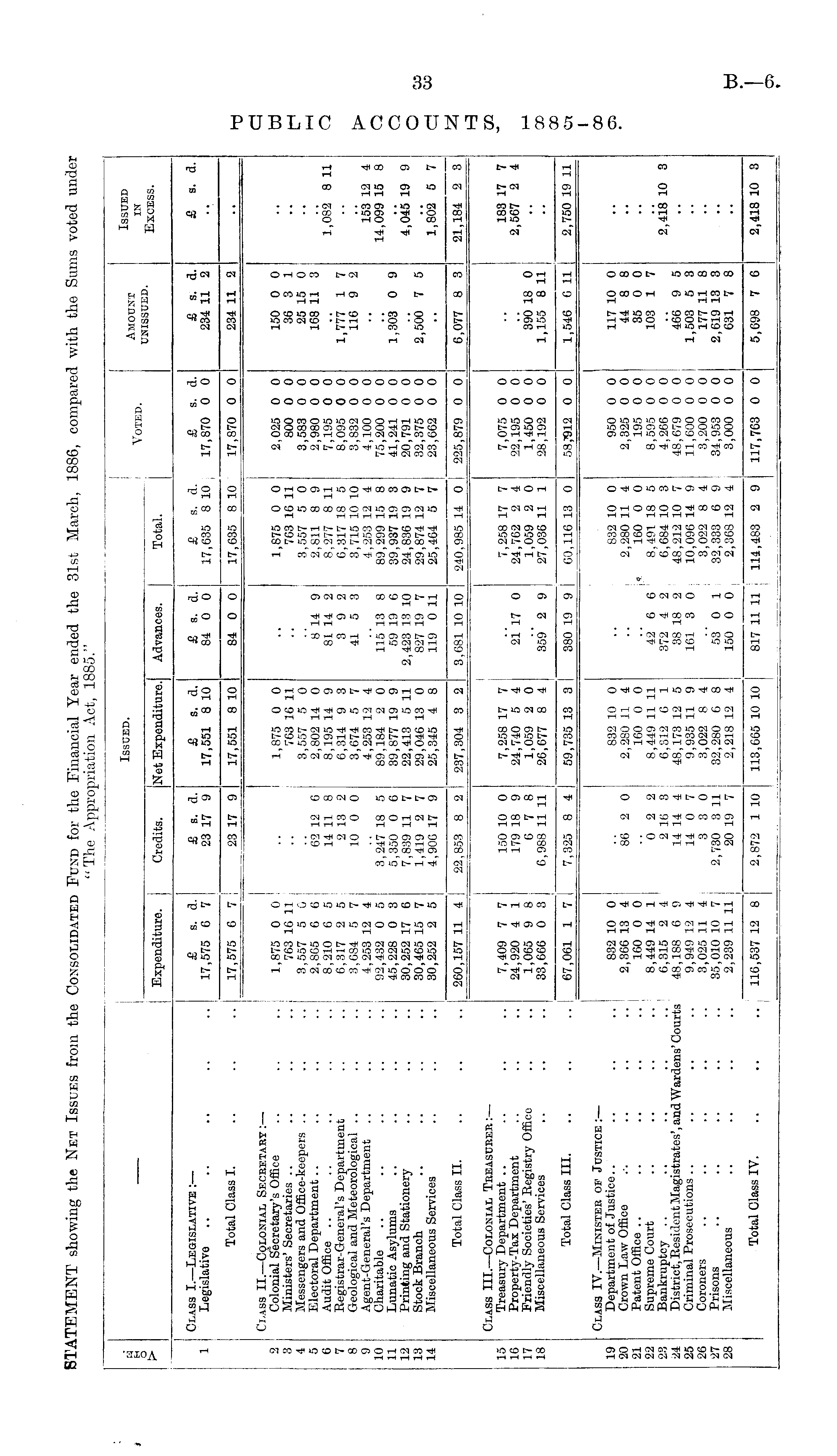 > Issued. Voted. Amount unissued. Issued in Excess. Expenditure. Credits. Net Expenditure. Advances. Total. Class I.—Legislative :— Legislative £ s. d. 17,575 6 7 £ s. d. 23 17 9 £ s. d. 17,551 8 10 £ s. d. 84 0 0 £ s. d. 17,635 8 10 j £ s. d. 17,870 0 0 £ s. a. 234 11 2 £ s. a. Total Class I. .. .. 17,575 6 7 I 17,575 0 7 23 17 9 17,551 8 10 84 0 0 17,635 8 10 17,870 0 0 234 11 2 2 3 4 5 6 7 8 9 10 11 12 13 14 Class II. —Colonial Secretary:— Colonial Secretary's Office Ministers' Secretaries Messengers and Office-keepers Electoral Department Audit Office Registrar-General's Department Geological and Meteorological Agent-General's Department Charitable Lunatic As3 Tlums Printing and Stationery Stock Branch Miscellaneous Services 1,875 0 0 ! 763 16 11 3,557 5 C 2,865 6 6 8,210 6 5 6,317 2 5 3,684 5 7 J 4,253 12 4 j 92,432 0 5 ; 45,228 0 3 30,252 17 6 30.4G5 15 7 30,252 2 5 1,875 0 0 ! 763 16 11 3,557 5 0 2,865 6 6 8,210 6 5 6,317 2 5 3,684 5 7 4,253 12 4 92,432 0 5 45,228 0 3 30,252 17 6 30.4G5 15 7 30,252 2 5 62 12 G 14 11 8 2 13 2 10 0 0 3,247 18 5 5,350 0 6 7,839 11 7 1,419 2 7 4,900 17 9 1,875 0 0 703 16 11 3,557 5 0 2,802 14 0 8,195 14 9 0,314 9 3 3,674 5 7 4,253 12 4 89,184 2 0 39,877 19 9 22,413 5 11 29,046 13 0 25,345 4 8 8 14 9 81 14 2 3 9 2 41 5 3 1,875 0 0 763 16 11 3,557 5 0 2,811 8 9 8,277 8 11 0,317 18 5 3,715 10 10 J,253 12 4 89,299 15 8 39,937 19 3 24,836 19 9 29,874 12 7 25,464 5 7 2,025 0 0 800 0 0 3,583 0 0 2,980 0 0 7,195 0 0 8,095 0 0 3,832 0 0 4,100 0 0 75,200 0 0 41,241 0 0 20,791 0 0 32,375 0 0 23,002 0 0 150 0 0 36 3 1 25 15 0 168 11 3 1,777 1 7 116 9 2 •• 1,082 8 11 115 13 8 59 19 6 2,423 13 10 827 19 7 119 0 11 153 12 4 14,099 15 8 1,303 0 9 4,045 19 9 2,500 7 5 1,802 5 7 Total Class II. 260,157 11 4 | I 21,184 2 3 260,157 11 4 22,853 8 2 237,304 3 2 3,081 10 10 240,985 14 0 225,879 0 0 6,077 8 3 15 16 17 18 Class III. —Colonial Treasurer: — Treasury Department Property-Tax Department Friendly Societies' Registry Office Miscellaneous Services 7,409 7 7 24,920 4 1 1,065 9 8 33,666 0 3 7,409 7 7 24,920 4 1 1,005 9 8 33,666 0 3 150 10 0 179 18 9 0 7 8 6,988 11 11 7,258 17 7 24,740 5 4 1,059 2 0 26,677 8 4 21 17 0 7,258 17 7 24,762 2 4 1,059 2 0 27,036 11 1 7,075 0 0 22,195 0 0 1,450 0 0 28,192 0 0 390 18 0 1,155 8 11 183 17 7 2,567 2 4 359' 2 9 Total Class III. .. .. .. j 67,061 1 7 j 67,061 1 7 7,325 8 4 59,735 13 3 380 19 9 60,116 13 0 53,912 0 0 1,546 G 11 2,750 19 11 19 20 21 22 23 24 25 26 27 28 Class IV. —Minister of Justice :— ■ Department of Justice.. .. .. .. j Crown Law Office .-. .. .. Patent Office .. .. .. .. Supreme Court .. .. .. Bankruptcy .. .. .. .. District, Resident Magistrates', and Wardens' Courts Criminal Prosecutions Coroners Prisons Miscellaneous 832 10 0 2,366 13 4 160 0 0 8,449 14 1 0,315 2 4 48,188 6 9 9,949 12 4 3,025 It 4 35,010 10 7 . 2,239 11 11 j 832 10 0 2,366 13 4 160 0 0 8,449 14 1 0,315 2 4 48,188 6 9 9,949 12 4 3,025 11 4 35,010 10 7 2,239 11 11 86 2 0 0 2 2 2 16 3 14 14 4 14 0 7 3 3 0 2,730 3 11 20 19 7 j 832 10 0 2,280 11 4 1G0 0 0 8,449 11 11 6,312 6 1 48,173 12 5 9,935 11 9 3,022 8 4 32,280 6 8 2,218 12 4 ■■ 42 6 6 372 4 2 38 18 2 16.1 3 0 58 0 1 150 0 0 832 10 0 2,280 11 4 160 0 0 8,491 18 5 6,684 10 3 48,212 10 7 10,096 14 9 3,022 8 4 32,333 6 9 2,368 12 4 950 0 0 2,325 0 0 195 0 0 8,595 0 0 4,200 0 0 48,079 0 0 11,600 0 0 3,200 0 0 34,953 0 0 3,000 0 0 117 10 0 44 8 8 35 0 0 103 1 7 466 9 5 1,503 5 3 177 11 8 2,019 13 3 631 7 8 2,418 10 3 Total Class IV 110,537 12 8 I 110,537 12 8 2,872 1 10 817 11 11 114,483 2 9 2,418 10 3 113,665 10 10 117,763 0 0 5,698 7 6