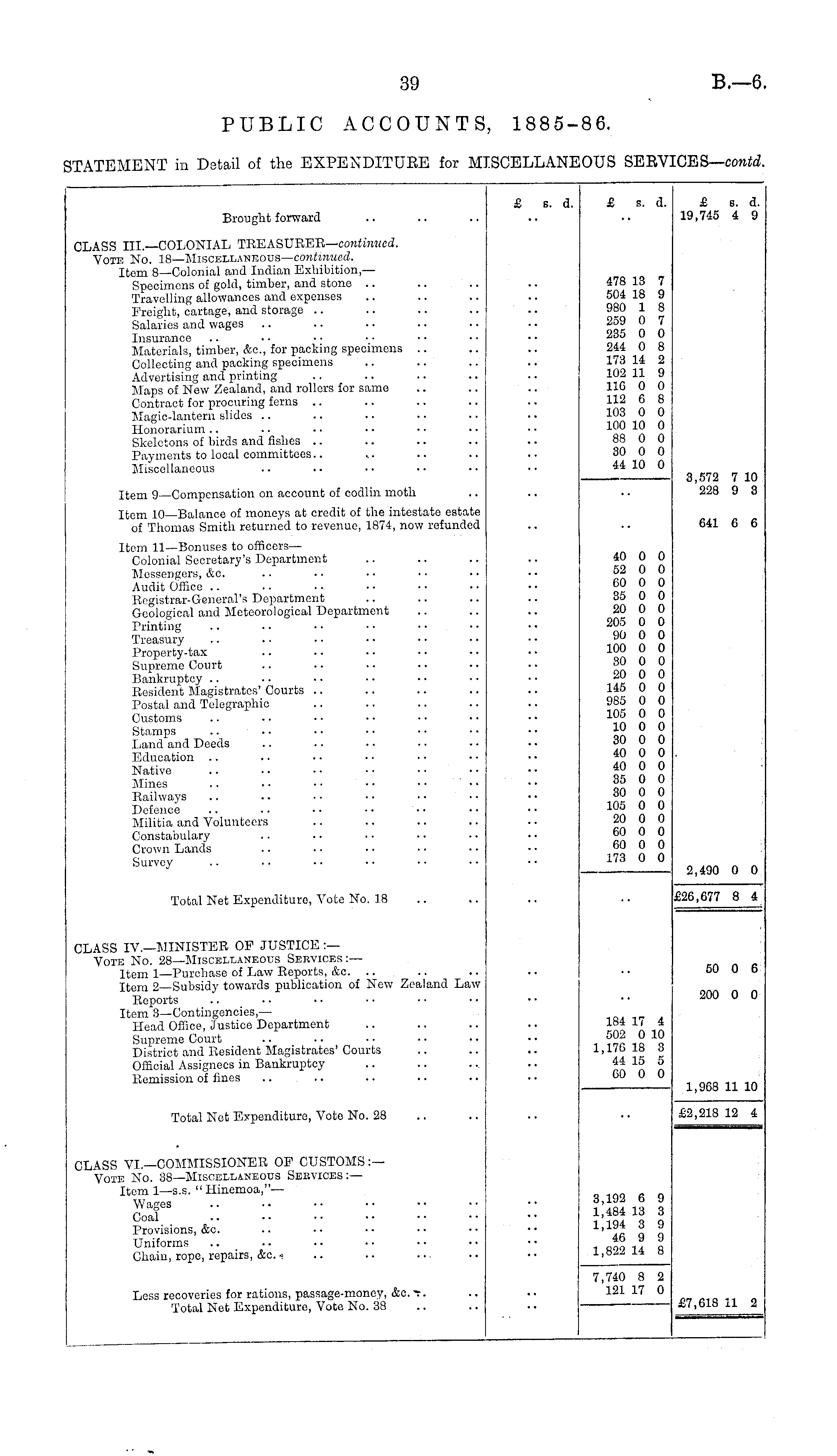 £ s. a. £ s. d. £ s. d. 19,745 4 9 Brought forward CLASS III.—COLONIAL TREASURER— continued. Vote No. 18—Miscellaneous — continued. Item 8—Colonial and Indian Exhibition,— Specimens of gold, timber, and stone Travelling allowances and expenses Freight, cartage, and storage Salaries and wages Insurance Materials, timber, &c, for packing specimens Collecting and packing specimens Advertising and printing Maps of New Zealand, and rollers for same Contract for procuring ferns Magic-lantern slides Honorarium Skeletons of birds and fishes Payments to local committees.. Miscellaneous 478 13 7 504 18 9 980 1 8 259 0 7 235 0 0 244 0 8 173 14 2 102 11 9 110 0 0 112 0 8 103 0 0 100 10 0 88 0 0 30 0 0 44 10 0 Item 9—Compensation on account of codlin moth 3,572 7 10 228 9 3 Item 10—Balance of moneys at creait of the intestate estate of Thomas Smith returnea to revenue, 1874, now refunded 641 6 6 Item 11—Bonuses to officers— Colonial Secretary's Department Messengers, &c. Audit Office Registrar-General's Department Geological and Meteorological Department Printing Treasury Property-tax Supreme Court Bankruptcy Resident Magistrates' Courts Postal and Telegraphic Customs Stamps Land and Deeds Education Native Mines .. .. • • • • ■ ■ Railways Defence Militia and Volunteers Constabulary Crown Lands Survey 40 0 0 52 0 0 00 0 0 35 0 0 20 0 0 205 0 0 90 0 0 100 0 0 30 0 0 20 0 0 145 0 0 985 0 0 105 0 0 10 0 0 30 0 0 40 0 0 40 0 0 35 0 0 30 0 0 105 0 0 20 0 0 GO 0 0 60 0 0 173 0 0 2,490 0 0 Total Net Expenditure, Vote No. 18 £26,677 8 4 CLASS IV.—MINISTER OF JUSTICE :— Vote No. 28—Miscellaneous Services :— Item 1—Purchase of Law Reports, &c Item 2—Subsidy towards publication of New Zealand Law Reports Item 3—Contingencies, — Head Office, Justice Department Supreme Court District and Resident Magistrates' Courts Official Assignees in Bankruptcy Remission of fines 184 17 4 502 0 10 1,170 18 3 44 15 5 00 0 0 50 0 6 200 0 0 1,968 11 10 Total Net Expenaituro, Vote No. 28 £2,218 12 4 CLASS VI.—COMMISSIONER OF CUSTOMS:— Vote No. 38 —Miscellaneous Services :— Item 1—s.s. "Hinemoa," — Wages Coal Provisions, &c. Uniforms Chain, rope, repairs, &c -■ 3,192 6 9 1,484 13 3 1,194 3 9 46 9 9 1,822 14 8 Less recoveries for rations, passage-money, &c. -r. Total Net Expenditure, Vote No. 38 7,740 8 2 121 17 0 £7,618 11 2