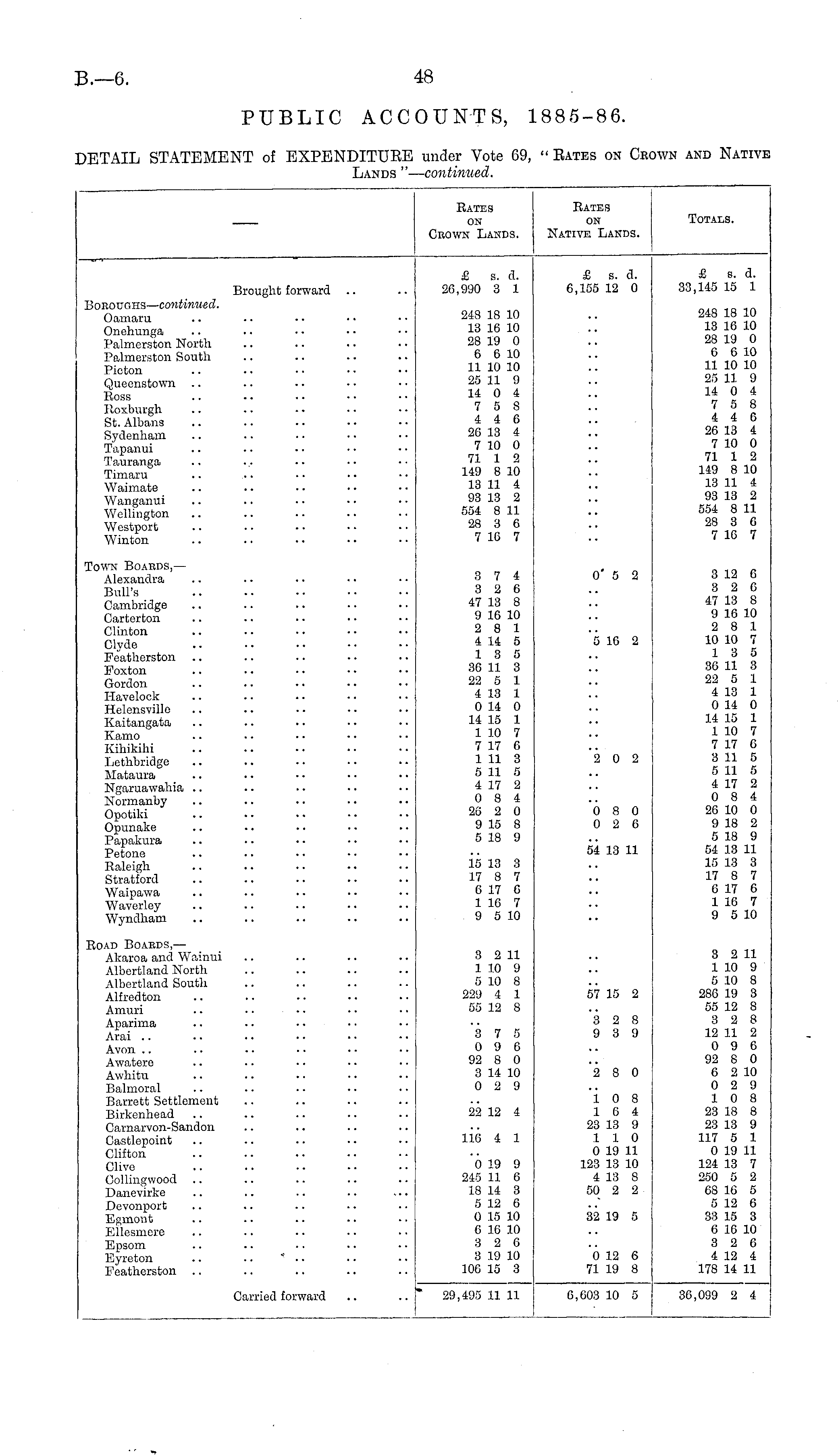 Rates on Crown Lands. Rates ON Native Lands. Totals. £ s. a. 20,990 3 1 £ s. a. 0,155 12 0 £ s. a. 33,145 15 1 Brought forward Boroughs— continued. Oamaru Onehunga Palmerston North Palmorston South Picton Queenstown Ross Roxburgh St. Albans Sydenham Tapanui Tauranga Timaru Waimate Wanganui Wellington Westport Winton 248 18 10 13 10 10 28 19 0 0 0 10 11 10 10 25 11 9 14 0 4 7 5 8 4 4G 26 13 4 7 10 0 71 1 2 149 8 10 13 11 4 93 13 2 554 8 11 28 3 6 7 16 7 248 18 10 13 10 10 28 19 0 G 0 10 11 10 10 25 11 9 14 0 4 7 5 8 4 4 0 20 13 4 7 10 0 71 1 2 149 8 10 13 11 4 93 13 2 554 8 11 28 3 6 7 16 7 Town Boards, — Alexandra Bull's Cambridge Carterton Clinton Clyde Featherston Foxton Gordon Havelock Hclensville Kaitangata Kamo Kihikihi Lethbridge Mataura Ngaruawahia .. Normanby Opotiki Opunake Papakura Petone Raleigh Stratford Waipawa Waverley Wyndham 3 7 4 3 2 6 47 13 8 9 16 10 2 8 1 4 14 5 13 5 36 11 3 22 5 1 4 13 1 0 14 0 14 15 1 1 10 7 7 17 6 1 11 3 5 11 5 4 17 2 0 8 4 20 2 0 9 15 8 5 18 9 0' 5 2 h 10 2 '202 3 12 6 3 2 0 47 13 8 9 16 10 2 8 1 10 10 7 13 5 30 11 3 22 5 1 4 13 1 0 14 0 14 15 1 1 10 7 7 17 0 3 11 5 5 11 5 4 17 2 0 8 4 20 10 0 9 18 2 5 18 9 54 13 11 15 13 3 17 8 7 6 17 6 1 16 7 9 5 10 0 8 0 0 2 0 54 13 11 15 13 3 17 8 7 6 17 6 1 16 7 9 5 10 Road Boards, — Akaroa and Wainui Albcrtland North Albertland South Alfredton Amuri Aparima Arai Avon Awatere Awhitu Balmoral Barrett Settlement Birkenhead Carnarvon-Sandon Castlepoint Clifton Clive Collingwood Danevirke Devonport Egmont Ellesmere Epsom Eyreton Featherston 3 2 11 1 10 9 5 10 8 229 4 1 55 12 8 3 7 5 0 9 6 92 8 0 3 14 10 0 2 9 22 12 4 57 15 2 '3 2 8 9 3 9 '2 8 0 10 8 10 4 23 13 9 110 0 19 11 123 13 10 4 18 8 50 2 2 32 19 5 3 2 11 1 10 9 5 10 8 286 19 3 55 12 8 3 2 8 12 11 2 0 9 0 92 8 0 6 2 10 0 2 9 10 8 23 18 8 23 13 9 117 5 1 0 19 11 124 13 7 250 5 2 68 16 5 5 12 6 33 15 3 6 16 10 3 2 6 4 12 4 178 14 11 110 4 1 0 19 9 245 11 0 18 14 3 5 12 6 0 15 10 6 16 10 3 2 0 3 19 10 100 15 3 6 12 6 71 19 8 Carried forward 29,495 11 11 6,603 10 5 80,099 2 4