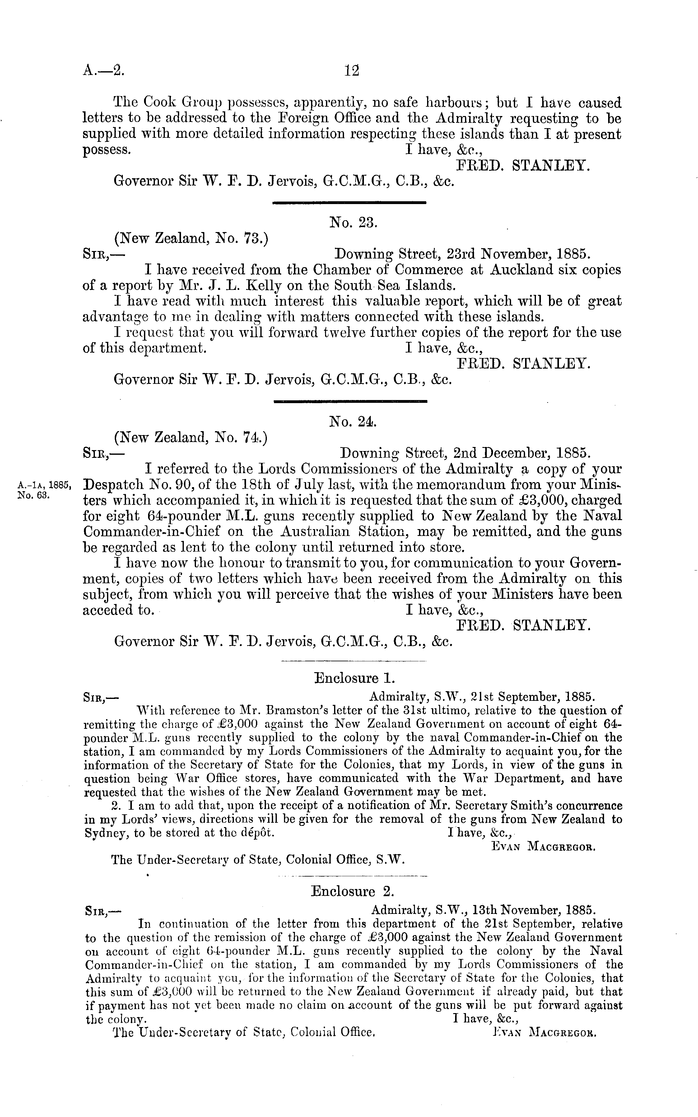 No. 24. (New Zealand, No. 74) Sir, — Downing Street, 2nd December, 1885. I referred to the Lords Commissioners of the Admiralty a copy of your Despatch No. 90, of the 18th of July last, with the memorandum from your Ministers which accompanied it, in which it is requested that the sum of £3,000, charged for eight 64-pounder M.L. guns recently supplied to New Zealand by the Naval Commander-in-Chief on the Australian Station, may be remitted, and the guns be regarded as lent to the colony until returned into store. I have now the honour to transmit to you, for communication to your Government, copies of two letters which have been received from the Admiralty on this subject, from which you will perceive that the wishes of your Ministers have been acceded to. I have, &c, FRED. STANLEY. Governor Sir W. P. D. Jervois, G.C.M.G., C.8., &c.