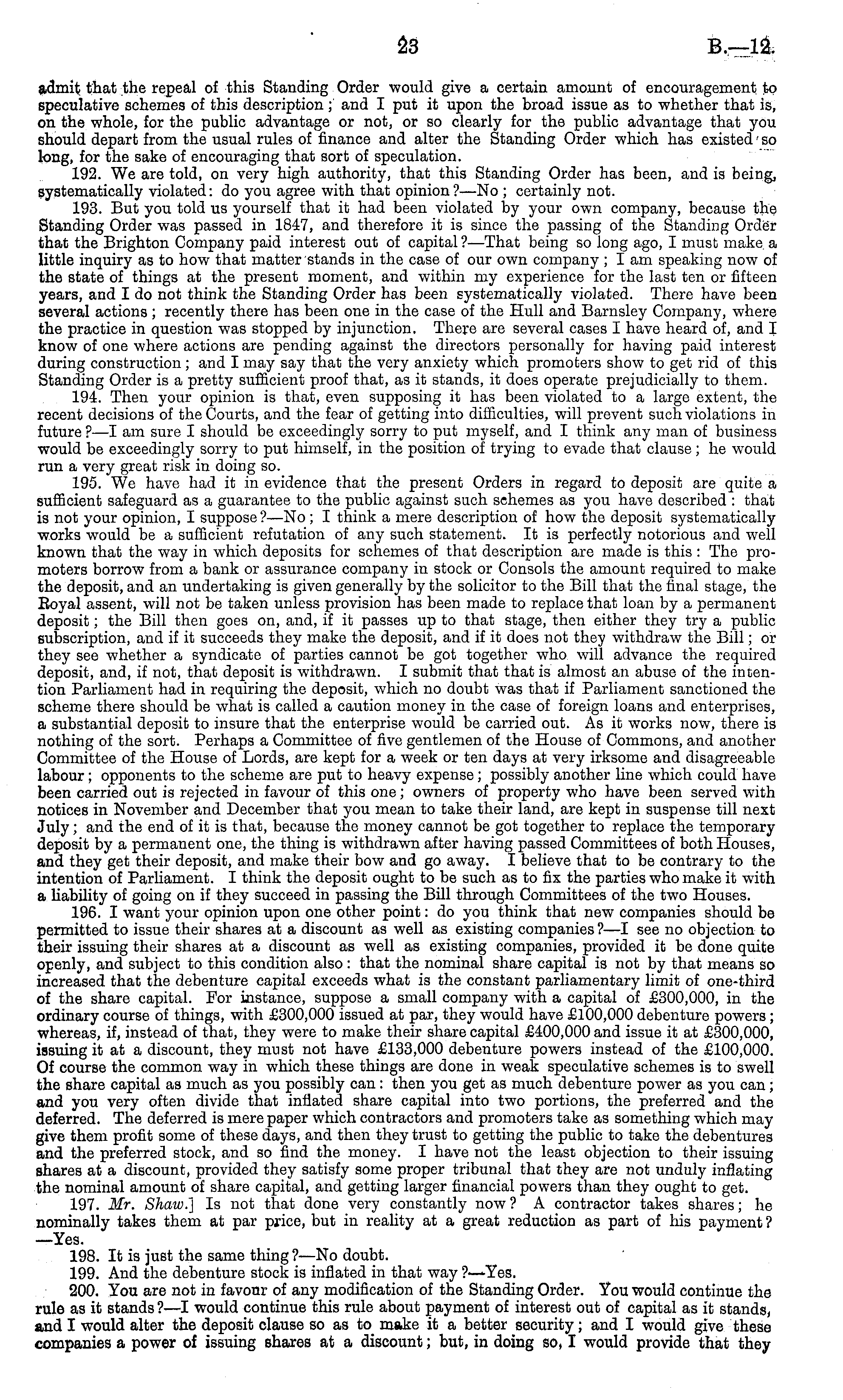 admit that the repeal of this Standing Order would give a certain amount of encouragement to speculative schemes of this description ;' and I put it upon the broad issue as to whether that is, on the whole, for the public advantage or not, or so clearly for the public advantage that you should depart from the usual rules of finance and alter the Standing Order which has existed so long, for the sake of encouraging that sort of speculation. 192. We are told, on very high authority, that this Standing Order has been, and is being, systematically violated: do you agree with that opinion?—No ; certainly not. 193. But you told us yourself that it had been violated by your own company, because the Standing Order was passed in 1847, and therefore it is since the passing of the Standing Order that the Brighton Company paid interest out of capital ?—That being so long ago, I must make a little inquiry as to how that matter stands in the case of our own company ; I am speaking now of the state of things at the present moment, and within my experience for the last ten or fifteen years, and Ido not think the Standing Order has been systematically violated. There have been several actions ; recently there has been one in the case of the Hull and Barnsley Company, where the practice in question was stopped by injunction. There are several cases I have heard of, and I know of one where actions are pending against the directors personally for having paid interest during construction; and I may say that the very anxiety which promoters show to get rid of this Standing Order is a pretty sufficient proof that, as it stands, it does operate prejudicially to them. 194. Then your opinion is that, even supposing it has been violated to a large extent, the recent decisions of the Courts, and the fear of getting into difficulties, will prevent such violations in future ? —I am sure I should be exceedingly sorry to put myself, and I think any man of business would be exceedingly sorry to put himself, in the position of trying to evade that clause ; he would run a very great risk in doing so. 195. We have had it in evidence that the present Orders in regard to deposit are quite a sufficient safeguard as a guarantee to the public against such schemes as you have described : that is not your opinion, I suppose ? —No ; I think a mere description of how the deposit systematically works would be a sufficient refutation of any such statement. It is perfectly notorious and well known that the way in which deposits for schemes of that description are made is this : The promoters borrow from a bank or assurance company in stock or Consols the amount required to make the deposit, and an undertaking is given generally by the solicitor to the Bill that the final stage, the Eoyal assent, will not be taken unless provision has been made to replace that loan by a permanent deposit; the Bill then goes on, and, if it passes up to that stage, then either they try a public subscription, and if it succeeds they make the deposit, and if it does not they withdraw the Bill; or they see whether a syndicate of parties cannot be got together who will advance the required deposit, and, if not, that deposit is withdrawn. I submit that that is almost an abuse of the intention Parliament had in requiring the deposit, which no doubt was that if Parliament sanctioned the scheme there should be what is called a caution money in the case of foreign loans and enterprises, a substantial deposit to insure that the enterprise would be carried out. As it works now, there is nothing of the sort. Perhaps a Committee of five gentlemen of the House of Commons, and another Committee of the House of Lords, are kept for a week or ten days at very irksome and disagreeable labour; opponents to the scheme are put to heavy expense; possibly another line which could have been carried out is rejected in favour of this one; owners of property who have been served with notices in November and December that you mean to take their land, are kept in suspense till next July; and the end of it is that, because the money cannot be got together to replace the temporary deposit by a permanent one, the thing is withdrawn after having passed Committees of both Houses, and they get their deposit, and make their bow and go away. I believe that to be contrary to the intention of Parliament. I think the deposit ought to be such as to fix the parties who make it with a liability of going on if they succeed in passing the Bill through Committees of the two Houses. 196. I want your opinion upon one other point: do you think that new companies should be permitted to issue their shares at a discount as well as existing companies ?—I see no objection to their issuing their shares at a discount as well as existing companies, provided it be done quite openly, and subject to this condition also: that the nominal share capital is not by that means so increased that the debenture capital exceeds what is the constant parliamentary limit of one-third of the share capital. For instance, suppose a small company with a capital of £300,000, in the ordinary course of things, with £300,000 issued at par, they would have £100,000 debenture powers; whereas, if, instead of that, they were to make their share capital £400,000 and issue it at £300,000, issuing it at a discount, they must not have £133,000 debenture powers instead of the £100,000. Of course the common way in which these things are done in weak speculative schemes is to swell the share capital as much as you possibly can : then you get as much debenture power as you can; and you very often divide that inflated share capital into two portions, the preferred and the deferred. The deferred is mere paper which contractors and promoters take as something which may give them profit some of these days, and then they trust to getting the public to take the debentures and the preferred stock, and so find the money. I have not the l