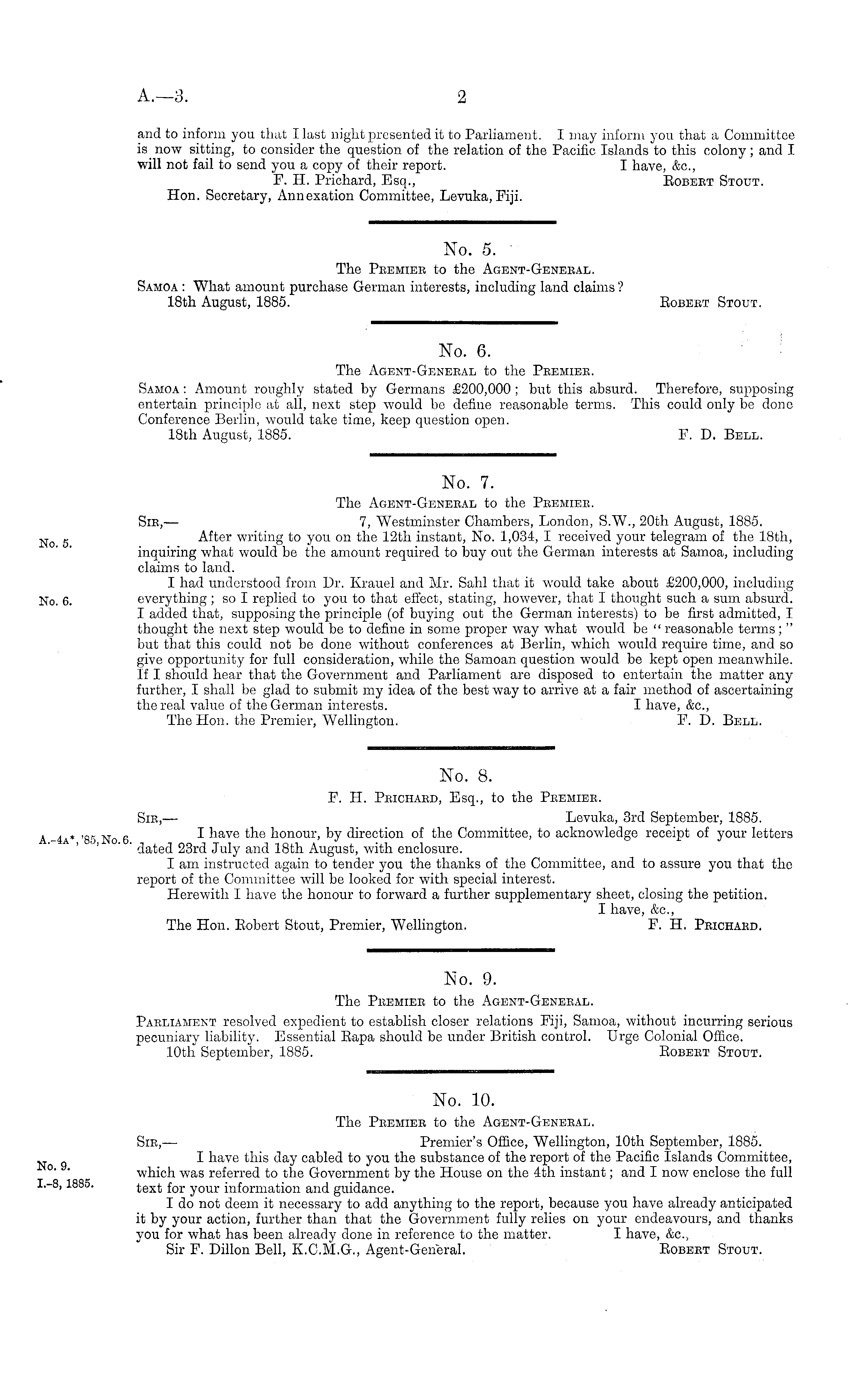 No. 7. The Agent-Geneeal to the Peemiee. Sic,— 7, Westminster Chambers, London, S.W., 20th August, 1885. After writing to you on the 12th instant, No. 1,034, I received your telegram of the 18th, inquiring what would be the amount required to buy out the German interests at Samoa, including claims to land. I had understood from Dr. Krauel and Mr. Sahl that it would take about £200,000, including everything ; so I replied to you to that effect, stating, however, that I thought such a sum absurd. I added that, supposing the principle (of buying out the German interests) to be first admitted, I thought the next step would be to define in some proper way what would be " reasonable terms; " but that this could not be done without conferences at Berlin, which would require time, and so give opportunity for full consideration, while the Samoan question would be kept open meanwhile. If I should hear that the Government and Parliament are disposed to entertain the matter any further, I shall be glad to submit my idea of the best way to arrive at a fair method of ascertaining the real value of the German interests. I have, &c, The Hon. the Premier, Wellington. F. D. Bell.