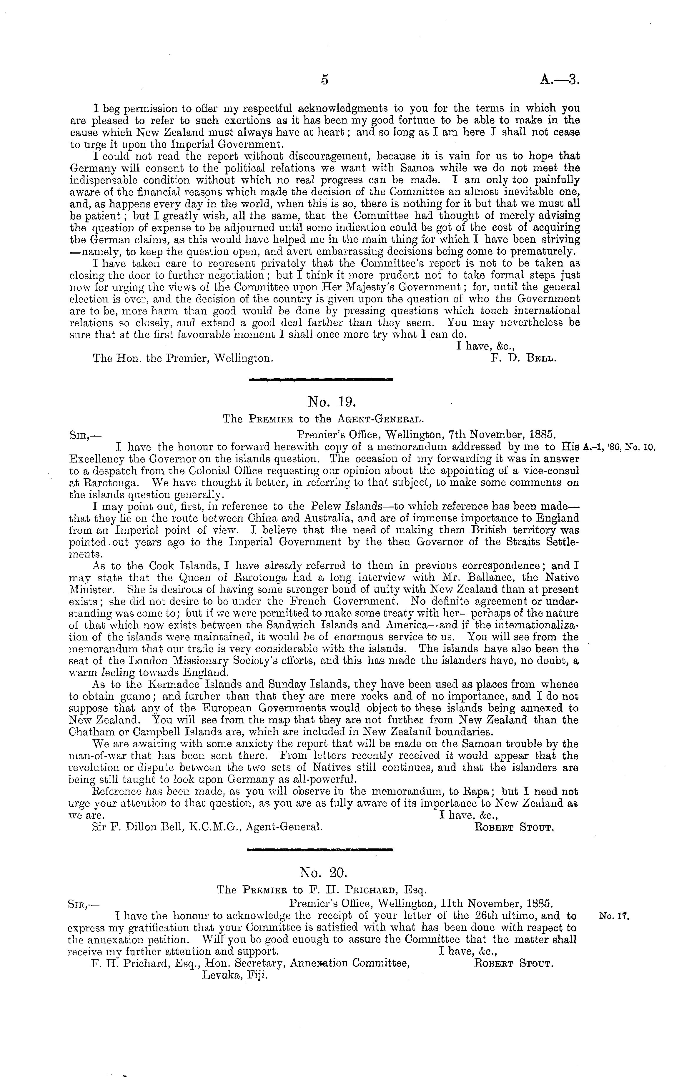 No. 19. The Peemiee to the Agent-General. Sic, — Premier's Office, Wellington, 7th November, 1885. I have the honour to forward herewith copy of a memorandum addressed by me to His Excellency the Governor on the islands question. The occasion of my forwarding it was in answer to a despatch from the Colonial Office requesting our opinion about the appointing of a vice-consul at Earotonga. We have thought it better, in referring to that subject, to make some comments on the islands question generally. I may point out, first, in reference to the Pelew Islands—to which reference has been made— that they lie on the route between China and Australia, and are of immense importance to England from an Imperial point of view. I believe that the need of making them British territory was pointed.out years ago to the Imperial Government by the then Governor of the Straits Settlements. As to the Cook Islands, I have already referred to them in previous correspondence; and I may state that the Queen of Earotonga had a long interview with Mr. Ballance, the Native Minister. She is desirous of having some stronger bond of unity with New Zealand than at present exists; she did not desire to be under the French Government. No definite agreement or understanding was come to; but if we were permitted to make some treaty with her—perhaps of the nature of that which now exists between the Sandwich Islands and America—and if the internationalization of the islands were maintained, it would be of enormous service to us. You will see from the memorandum that our trade is very considerable with the islands. The islands have also been the seat of the London Missionary Society's efforts, and this has made the islanders have, no doubt, a warm feeling towards England. As to the Kermadec Islands and Sunday Islands, they have been used as places from whence to obtain guano; and further than that they are mere rocks and of no importance, and Ido not suppose that any of the European Governments would object to these islands being annexed to New Zealand. You will see from the map that they are not further from New Zealand than the Chatham or Campbell Islands are, which are included in New Zealand boundaries. We are awaiting with some anxiety the report that will be made on the Samoan trouble by the man-of-war that has been sent there. From letters recently received it would appear that the revolution or dispute between the two sets of Natives still continues, and that the islanders are being still taught to look upon Germany as all-powerful. Beference has been made, as you will observe in the memorandum, to Eapa; but I need not urge your attention to that question, as you are as fully aware of its importance to New Zealand as we are. I have, &c, Sir F. Dillon Bell, K.C.M.G., Agent-General. Eobeet Stout.