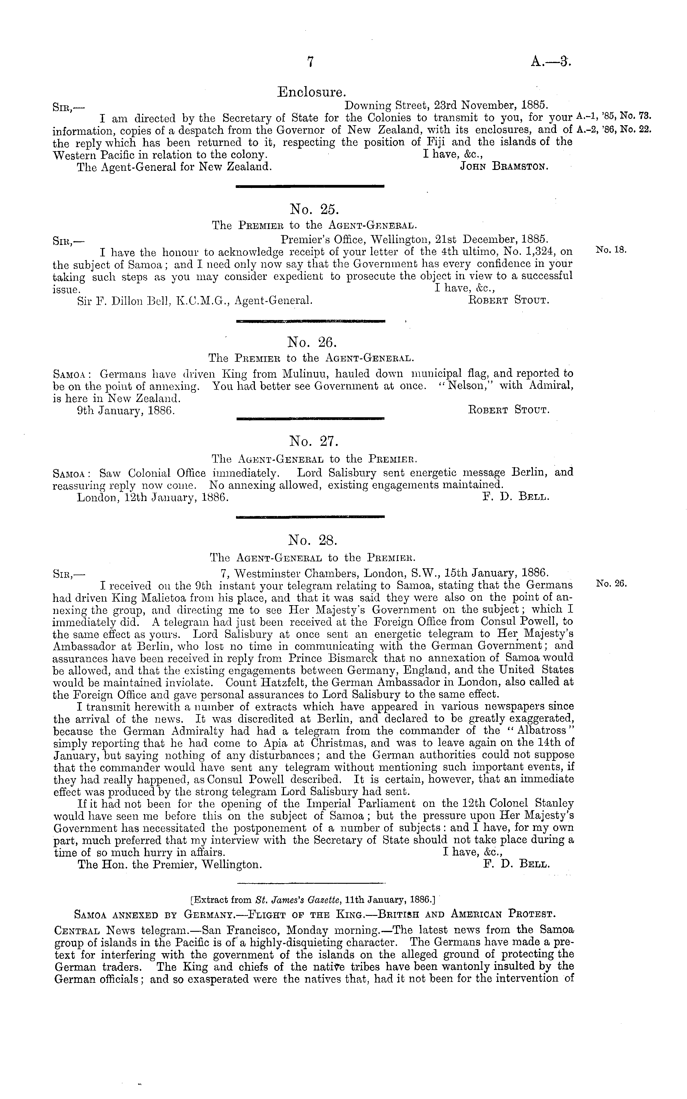 No. 28. The Agent-General to the Premier. Sir, — 7, Westminster Chambers, London, S.W., 15th January, 1886. I received on the 9th instant your telegram relating to Samoa, stating that the Germans had driven King Malietoa from his place, and that it was said they were also on the point of annexing the group, and directing me to see Her Majesty's Government on the subject; which I immediately did. A telegram had just been received at the Foreign Office from Consul Powell, to the same effect as yours. Lord Salisbury at once sent an energetic telegram to Her Majesty's Ambassador at Berlin, who lost no time in communicating with the German Government; and assurances have been received in reply from Prince Bismarck that no annexation of Samoa would be allowed, and that the existing engagements between Germany, England, and the United States would be maintained inviolate. Count Hatzfelt, the German Ambassador in London, also called at the Foreign Office and gave personal assurances to Lord Salisbury to the same effect. I transmit herewith a number of extracts which have appeared in various newspapers since the arrival of the news. It was discredited at Berlin, and declared to be greatly exaggerated, because the German Admiralty had had a telegram from the commander of the "Albatross" simply reporting that he had come to Apia at Christmas, and was to leave again on the 14th of January, but saying nothing of any disturbances; and the German authorities could not suppose that the commander would have sent any telegram without mentioning such important events, if they had really happened, as Consul Powell described. It is certain, however, that an immediate effect was produced by the strong telegram Lord Salisbury had sent. If it had not been for the opening of the Imperial Parliament on the 12th Colonel Stanley would have seen me before this on the subject of Samoa; but the pressure upon Her Majesty's Government has necessitated the postponement of a number of subjects: and I have, for my own part, much preferred that my interview with the Secretary of State should not take place during a time of so much hurry in affairs. I have, &c, The Hon. the Premier, Wellington. F. D. Bell.