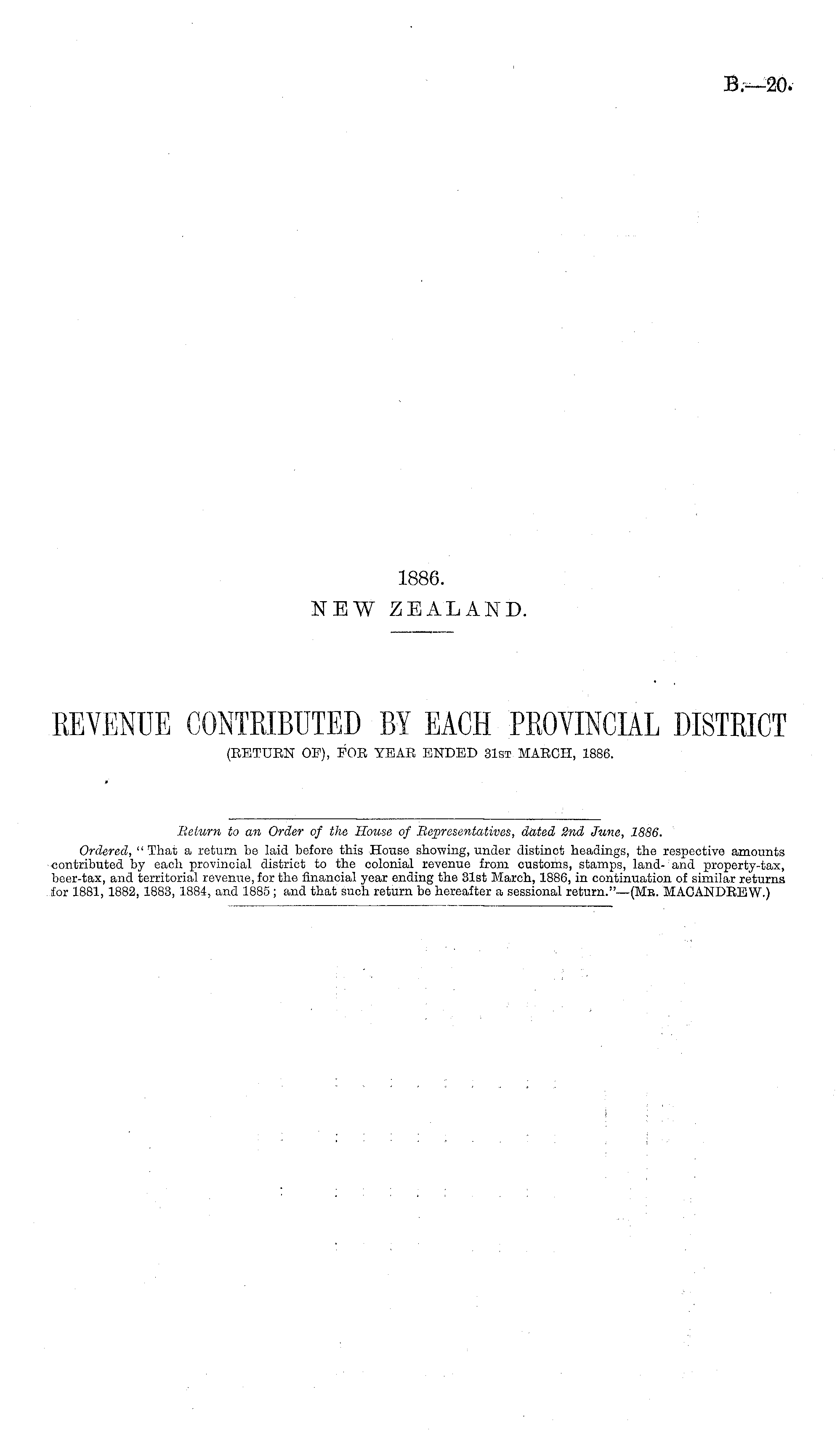 Belurn to an Order of ilia House of Representatives, dated 2nd June, 1886. Ordered, "That a return bo laid before this House showing, under distinct headings, the respective amounts contributed by each provincial district to the colonial revenue from customs, stamps, land- and property-tax, beer-tax, and territorial revenue, for the financial year ending the 31st March, 1886, in continuation of similar returns for 1881, 1882, 1883, 1884, and 1885 ; and that such return be hereafter a sessional return."—(Mb. MACANDREW.)