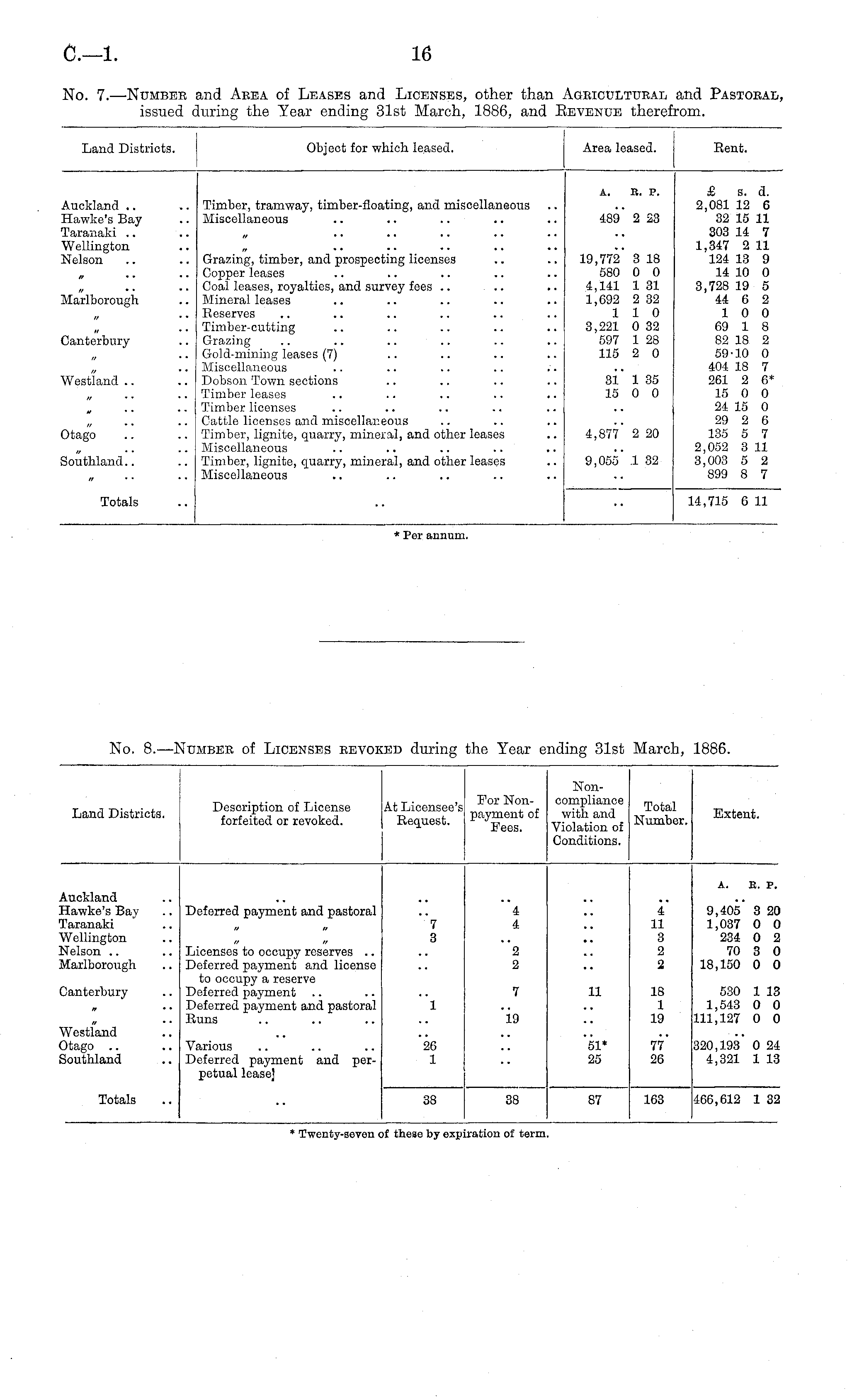 No. 7. —Number and Area of Leases and Licenses, other than Agricultural and Pastoral, issued during the Year ending 31st March, 1886, and Revenue therefrom.