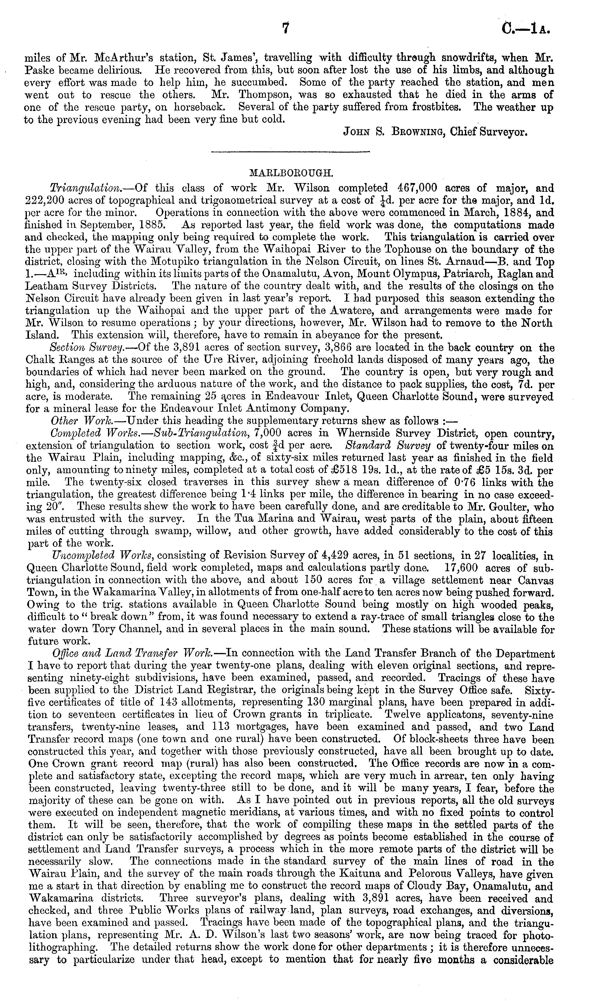 MABLBOROTJGH. Triangulation. —Of this class of work Mr. "Wilson completed 467,000 acres of major, and 222,200 acres of topographical and trigonometrical survey at a cost of -|d. per acre for the major, and Id. per acre for the minor. Operations in connection with the above were commenced in March, 1884, and finished in September, 1885. As reported last year, the field work was done, the computations made and checked, the mapping only being required to complete the work. This triangulation is carried over the upper part of the Wairau Valley, from the Waihopai River to the Tophouse on the boundary of the district, closing with the Motupiko triangulation in the Nelson Circuit, on lines St. Arnaud—B. and Top I.—A IR- including within its limits parts of the Onamalutu, Avon, Mount Olympus, Patriarch, Raglan and Leatham Survey Districts. The nature of the country dealt with, and the results of the closings on the Nelson Circuit have already been given in last year's report. I had purposed this season extending the triangulation up the Waihopai and the upper part of the Awatere, and arrangements were made for Mr. Wilson to resume operations ; by your directions, however, Mr. Wilson had to remove to the North Island. This extension will, therefore, have to remain in abeyance for the present. Section Survey. —Of the 3,891 acres of section survey, 3,866 are located in the back country on the Chalk Ranges at the source of the Ure River, adjoining freehold lands disposed of many years ago, the boundaries of which had never been marked on the ground. The country is open, but very rough and high, and, considering the arduous nature of the work, and the distance to pack supplies, the cost, 7d. per acre, is moderate. The remaining 25 a,cres in Endeavour Inlet, Queen Charlotte Sound, were surveyed for a mineral lease for the Endeavour Inlet Antimony Company. Other Work. —Under this heading the supplementary returns shew as follows :— Completed Works. — Sub-Triangidation, 7,000 acres in Whernside Survey District, open country, extension of triangulation to section work, cost |d per acre. Standard Survey of twenty-four miles on the Wairau Plain, including mapping, &c, of sixty-six miles returned last year as finished in the field only, amounting to ninety miles, completed at a total cost of £518 19s. Id., at the rate of £5 15s. 3d. per mile. The twenty-six closed traverses in this survey shew a mean difference of 0-76 links with the triangulation, the greatest difference being 1-4 links per mile, the difference in bearing in no case exceeding 20". These results shew the work to have been carefully done, and are creditable to Mr. G-oulter, who was entrusted with the survey. In the Tua Marina and Wairau, west parts of the plain, about fifteen miles of cutting through swamp, willow, and other growth, have added considerably to the cost of this part of the work. Uncompleted Works, consisting of Revision Survey of 4,429 acres, in 51 sections, in 27 localities, in Queen Charlotte Sound, field work completed, maps and calculations partly done. 17,600 acres of subtriangulation in connection with the above, and about 150 acres for a village settlement near Canvas Town, in the Wakamarina Valley, in allotments of from one-half acre to ten acres now being pushed forward. Owing to the trig, stations available in Queen Charlotte Sound being mostly on high wooded peaks, difficult to " break down" from, it was found necessary to extend a ray-trace of small triangles close to the water down Tory Channel, and in several places in the main sound. These stations will be available for future work. Office and Land Transfer Work. —ln connection with the Land Transfer Branch of the Department I have to report that during the year twenty-one plans, dealing with eleven original sections, and representing ninety-eight subdivisions, have been examined, passed, and recorded. Tracings of these have been supplied to the District Land Registrar, the originals being kept in the Survey Office safe. Sixtyfive certificates of title of 143 allotments, representing 130 marginal plans, have been prepared in addition to seventeen certificates in lieu of Crown grants in triplicate. Twelve applicatons, seventy-nine transfers, twenty-nine leases, and 113 mortgages, have been examined and passed, and two Land Transfer record maps (one town and one rural) have been constructed. Of block-sheets three have been constructed this year, and together with those previously constructed, have all been brought up to date. One Crown grant record map (rural) has also been constructed. The Office records are now in a complete and satisfactory state, excepting the record maps, which are very much in arrear, ten only having been constructed, leaving twenty-three still to be done, and it will be many years, I fear, before the majority of these can be gone on with. As I have pointed out in previous reports, all the old surveys were executed on independent magnetic meridians, at various times, and with no fixed points to control them. It will be seen, therefore, that the work of compiling these maps in the settled parts of the district can only be satisfactorily accomplished by degrees as points become established in the course of settlement and Land Transfer surveys, a process which in the more remote parts of the district will be necessarily slow. The connections made in the standard survey of the main lines of road in the Wairau Plain, and the survey of the main roads through the Kaituna and Pelorous Valleys, have given me a start in that direction by enabling me to construct the record maps of Cloudy Bay, Onamalutu, and Wakamarina districts. Three surveyor's plans, dealing with 3,891 acres, have been received and checked, and three Public Works plans of railway land, plan surveys, road exchanges, and diversions, have been examined and passed. Tracings have been made of the topographical plans, and the triangulation plans, representing Mr. A. D. W