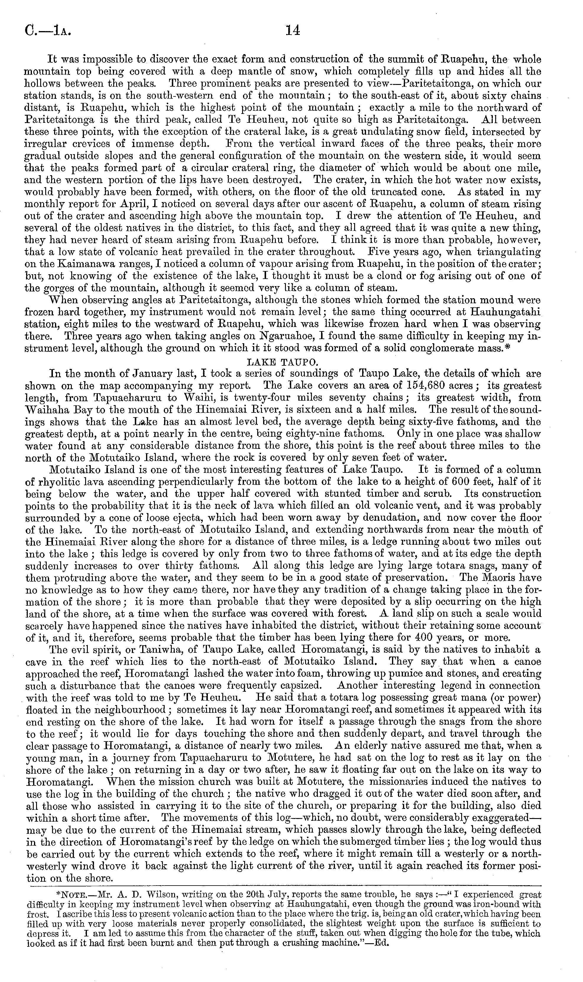 It was impossible to discover the exact form and construction of the summit of Ruapehu, the whole mountain top being covered with a deep mantle of snow, which completely fills up and hides all the hollows between the peaks. Three prominent peaks are presented to view—Paritetaitonga, on which our station stands, is on the south-western end of the mountain ; to the south-east of it, about sixty chains distant, is Ruapehu, which is the highest point of the mountain ; exactly a mile to the northward of Paritetaitonga is the third peak, called Te Heuheu, not quite so high as Paritetaitonga. All between these three points, with the exception of the crateral lake, is a great undulating snow field, intersected by irregular crevices of immense depth. From the vertical inward faces of the three peaks, their more gradual outside slopes and the general configuration of the mountain on the western side, it would seem that the peaks formed part of a circular crateral ring, the diameter of which would be about one mile, and the western portion of the lips have been destroyed. The crater, in which the hot water now exists, would probably have been formed, with others, on the floor of the old truncated cone. As stated in my monthly report for April, I noticed on several days after our ascent of Ruapehu, a column of steam rising out of the crater and ascending high above the mountain top. I drew the attention of Te Heuheu, and several of the oldest natives in the district, to this fact, and they all agreed that it was quite a new thing, they had never heard of steam arising from Ruapehu before. I think it is more than probable, however, that a low state of volcanic heat prevailed in the crater throughout. Five years ago, when triangulating on the Kaimanawa ranges, I noticed a column of vapour arising from Ruapehu, in the position of the crater; but, not knowing of the existence of the lake, I thought it must be a clond or fog arising out of one of the gorges of the mountain, although it seemed very like a column of steam. When observing angles at Paritetaitonga, although the stones which formed the station mound were frozen hard together, my instrument would not remain level; the same thing occurred at Hauhungatahi station, eight miles to the westward of Ruapehu, which was likewise frozen hard when I was observing there. Three years ago when taking angles on Ngaruahoe, I found the same difficulty in keeping my instrument level, although the ground on which it it stood was formed of a solid conglomerate mass.* LAKE TATJPO. In the month of January last, I took a series of soundings of Taupo Lake, the details of which are shown on the map accompanying my report. The Lake covers an area of 154,680 acres; its greatest length, from Tapuaeharuru to Waihi, is twenty-four miles seventy chains; its greatest width, from Waihaha Bay to the mouth of the Hinemaiai River, is sixteen and a half miles. The result of the soundings shows that the Lake has an almost level bed, the average depth being sixty-five fathoms, and the greatest depth, at a point nearly in the centre, being eighty-nine fathoms. Only in one place was shallow water found at any considerable distance from the shore, this point is the reef about three miles to the north of the Motutaiko Island, where the rock is covered by only seven feet of water. Motutaiko Island is one of the most interesting features of Lake Taupo. It is formed of a column of rhyolitic lava ascending perpendicularly from the bottom of the lake to a height of 600 feet, half of it being below the water, and the upper half covered with stunted timber and scrub. Its construction points to the probability that it is the neck of lava which filled an old volcanic vent, and it was probably surrounded by a cone of loose ejecta, which had been worn away by denudation, and now cover the floor of the lake. To the north-east of Motutaiko Island, and extending northwards from near the mouth of the Hinemaiai River along the shore for a distance of three miles, is a ledge running about two miles out into the lake ; this ledge is covered by only from two to three fathoms of water, and at its edge the depth suddenly increases to over thirty fathoms. All along this ledge are lying large totara snags, many of them protruding above the water, and they seem to be in a good state of preservation. The Maoris have no knowledge as to how they came there, nor have they any tradition of a change taking place in the formation of the shore ; it is more than probable that they were deposited by a slip occurring on the high land of the shore, at a time when the surface was covered with forest. A land slip on such a scale would scarcely have happened since the natives have inhabited the district, without their retaining some account of it, and it, therefore, seems probable that the timber has been lying there for 400 years, or more. The evil spirit, or Taniwha, of Taupo Lake, called Horomatangi, is said by the natives to inhabit a cave in the reef which lies to the north-east of Motutaiko Island. They say that when a canoe approached the reef, Horomatangi lashed the water into foam, throwing up pumice and stones, and creating such a disturbance that the canoes were frequently capsized. Another interesting legend in connection with the reef was told to me by Te Heuheu. He said that a totara log possessing great mana (or power) floated in the neighbourhood; sometimes it lay near Horomatangi reef, and sometimes it appeared with its end resting on the shore of the lake. It had worn for itself a passage through the snags from the shore to the reef; it would lie for days toviching the shore and then suddenly depart, and travel through the clear passage to Horomatangi, a distance of nearly two miles. An elderly native assured me that, when a young man, in a journey from Tapuaeharuru to Motutere, he had sat on the log to rest as it lay on the shore of the lake; on returning in a day or two after, he saw it floating far ou