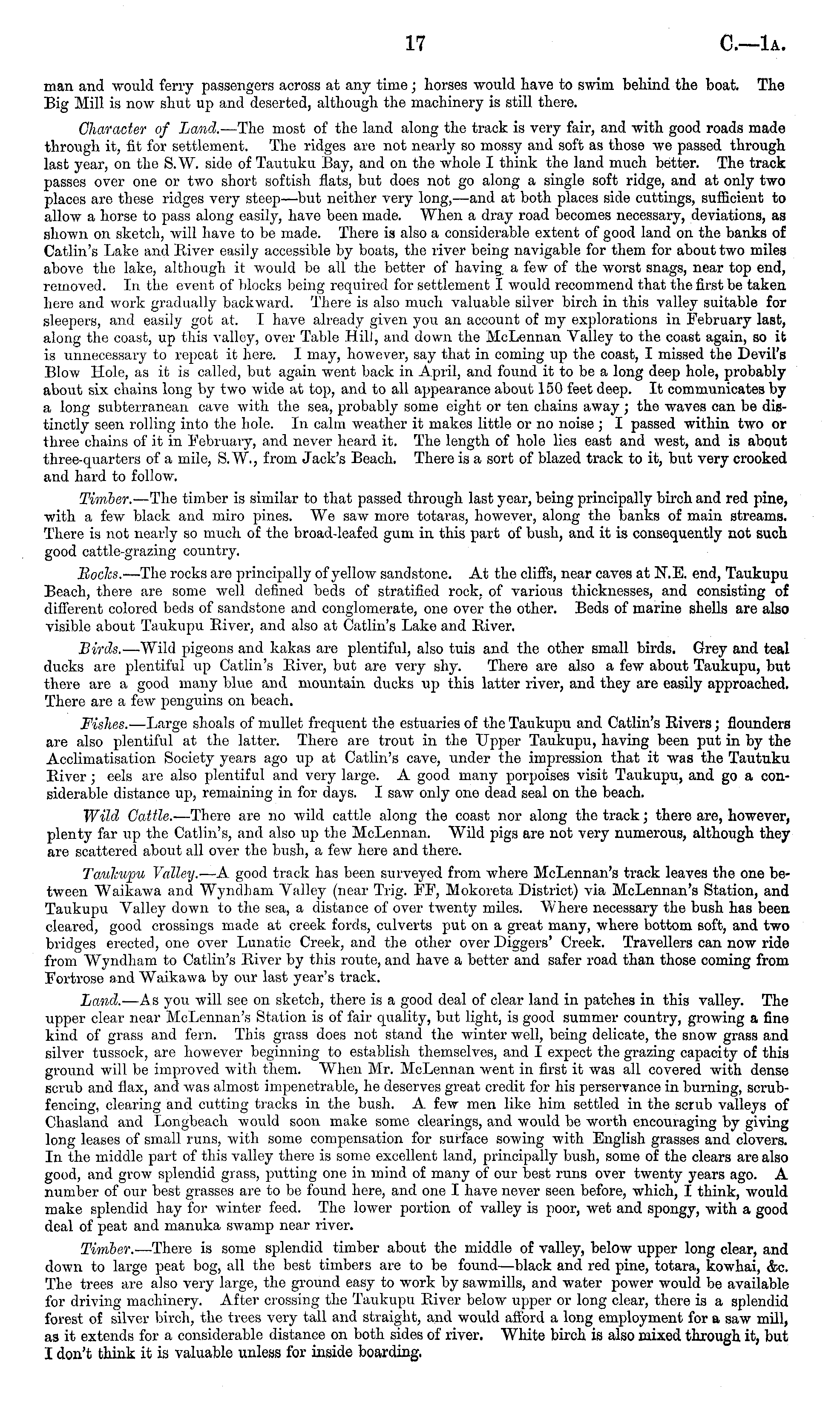 man and would ferry passengers across at any time; horses would have to swim behind the boat. The Big Mill is now shut up and deserted, although the machinery is still there. Character of Land. —The most of the land along the track is very fair, and with good roads made through it, fit for settlement. The ridges are not nearly so mossy and soft as those we passed through last year, on the S.W. side of Tautuku Bay, and on the whole I think the land much better. The track passes over one or two short softish flats, but does not go along a single soft ridge, and at only two places are these ridges very steep—but neither very long,—and at both places side cuttings, sufficient to allow a horse to pass along easily, have been made. When a dray road becomes necessary, deviations, as shown on sketch, will have to be made. There is also a considerable extent of good land on the banks of Catlin's Lake and River easily accessible by boats, the river being navigable for them for about two miles above the lake, although it would be all the better of having, a few of the worst snags, near top end, removed. In the event of blocks being required for settlement I would recommend that the first be taken here and work gradually backward. There is also much valuable silver birch in this valley suitable for sleepers, and easily got at. I have already given you an account of my explorations in February last, along the coast, up this valley, over Table Hill, and down the McLennan Valley to the coast again, so it is unnecessary to repeat it here. I may, however, say that in coming up the coast, I missed the Devil's Blow Hole, as it is called, but again went back in April, and found it to be a long deep hole, probably about six chains long by two wide at top, and to all appearance about 150 feet deep. It communicates by a long subterranean cave with the sea, probably some eight or ten chains away ; the waves can be distinctly seen rolling into the hole. In calm weather it makes little or no noise ; I passed within two or three chains of it in February, and never heard it. The length of hole lies east and west, and is about three-quarters of a mile, S. W., from Jack's Beach. There is a sort of blazed track to it, but very crooked and hard to follow. Timber. —The timber is similar to that passed through last year, being principally birch and red pine, with a few black and miro pines. We saw more totaras, however, along the banks of main streams. There is not nearly so much of the broad-leafed gum in this part of bush, and it is consequently not such good cattle-grazing country. Bochs. —The rocks are principally of yellow sandstone. At the cliffs, near caves at N.E. end, Taukupu Beach, there are some well defined beds of stratified rock, of various thicknesses, and consisting of different colored beds of sandstone and conglomerate, one over the other. Beds of marine shells are also visible about Taukupu River, and also at Catlin's Lake and River. Birds. —Wild pigeons and kakas are plentiful, also tuis and the other small birds. Grey and teal ducks are plentiful up Catlin's River, but are very shy. There are also a few about Taukupu, but there are a good many blue and mountain ducks up this latter river, and they are easily approached. There are a few penguins on beach. Fishes. —Large shoals of mullet freqiient the estuaries of the Taukupu and Catlin's Rivers; flounders are also plentiful at the latter. There are trout in the "Upper Taukupu, having been put in by the Acclimatisation Society years ago up at Catlin's cave, under the impression that it was the Tautuku River ; eels are also plentiful and very large. A good many porpoises visit Taukupu, and go a considerable distance up, remaining in for days. I saw only one dead seal on the beach. Wild Cattle. —There are no wild cattle along the coast nor along the track; there are, however, plenty far up the Catlin's, and also up the McLennan. Wild pigs are not very numerous, although they are scattered about all over the bush, a few here and there. Tauhupu Valley.- —A good track has been surveyed from where McLennan's track leaves the one between Waikawa and Wyndham Valley (near Trig. FF, Mokoreta District) via McLennan's Station, and Taukupu Valley down to the sea, a distance of over twenty miles. Where necessary the bush has been cleared, good crossings made at creek fords, culverts put on a great many, where bottom soft, and two bridges erected, one over Lunatic Creek, and the other over Diggers' Creek. Travellers can now ride from Wyndham to Catlin's River by this route, and have a better and safer road than those coming from Fortrose and Waikawa by our last year's track. Land. —As you will see on sketch, there is a good deal of clear land in patches in this valley. The upper clear near McLennan's Station is of fair quality, but light, is good summer country, growing a fine kind of grass and fern. This grass does not stand the winter well, being delicate, the snow grass and silver tussock, are however beginning to establish themselves, and I expect the grazing capacity of this ground will be improved with them. When Mr. McLennan went in first it was all covered with dense scrub and flax, and was almost impenetrable, he deserves great credit for his perservance in burning, scrubfencing, clearing and cutting tracks in the bush. A few men like him settled in the scrub valleys of Chasland and Longbeach would soon make some clearings, and would be worth encouraging by giving long leases of small runs, with some compensation for surface sowing with English grasses and clovers. In the middle part of this valley there is some excellent land, principally bush, some of the clears are also good, and grow splendid grass, putting one in mind of many of our best runs over twenty years ago. A number of our best grasses are to be found here, and one I have never seen before, which, I think, would make splendid hay for winter feed. The lower portion of valley i
