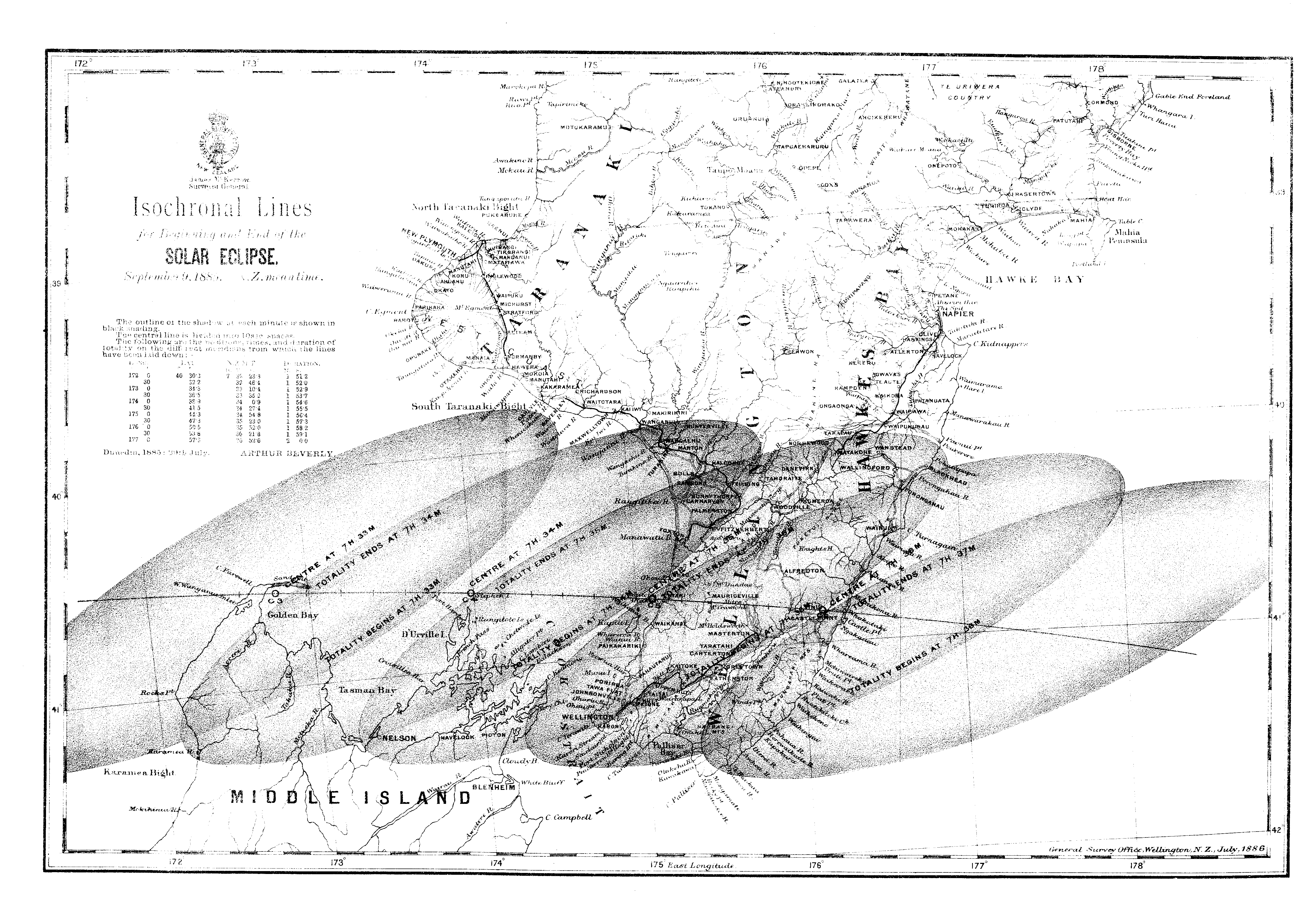 Isochronal Lines for Beginning and End of the SOLAR ECLIPSE, September 9, 1885. N.Z. mean time.
