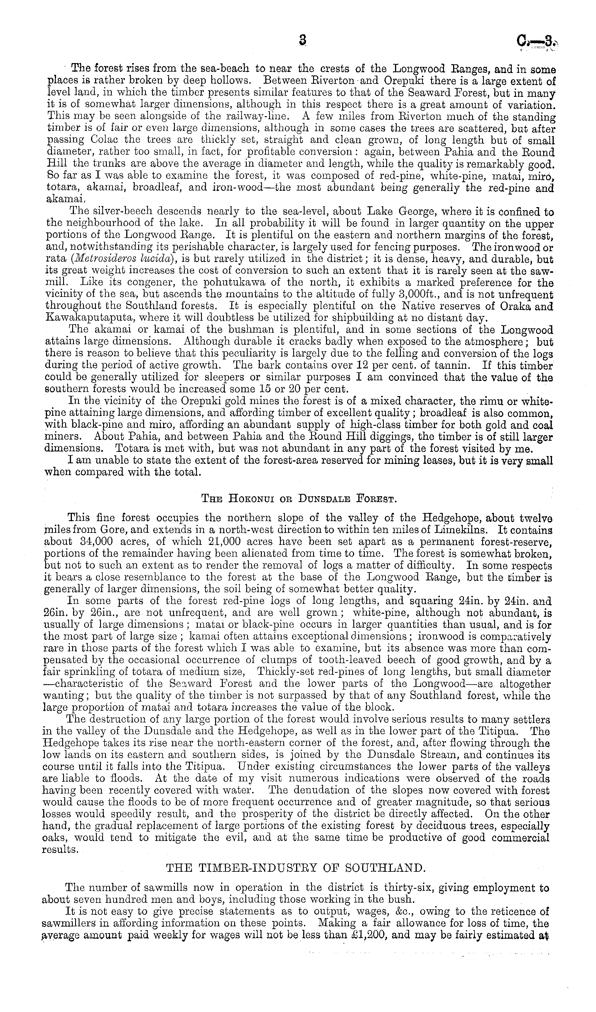 The forest rises from the sea-beach to near the crests of the Longwood Eanges, and in some places is rather broken by deep hollows. Between Biverton and Orepuki there is a large extent of level land, in which the timber presents similar features to that of the Seaward Forest, but in many it is of somewhat larger dimensions, although in this respect there is a great amount of variation. This may be seen alongside of the railway-line. A few miles from Eiverton much of the standing timber is of fair or even large dimensions, although in some cases the trees are scattered, but after passing Colac the trees are thickly set, straight and clean grown, of long length but of small diameter, rather too small, in fact, for profitable conversion: again, between Pahia and the Bound Hill the trunks are above the average in diameter and length, while the quality is remarkably good. So far as I was able to examine the forest, it was composed of red-pine, white-pine, matai, rniro, totara, akamai, broadleaf, and iron-wood —the most abundant being generally the red-pine and akamai, The silver-beech descends nearly to the sea-level, about Lake George, where it is confined to the neighbourhood of the lake. In all probability it will be found in larger quantity on the upper portions of the Longwood Eange. It is plentiful on the eastern and northern margins of the forest, and, notwithstanding its perishable character, is largely used for fencing purposes. The ironwood or rata (Metrosideros lucida), is but rarely utilized in the district; it is dense, heavy, and durable, but its great weight increases the cost of conversion to such an extent that it is rarely seen at the sawmill. Like its congener, the pohutukawa of the north, it exhibits a marked preference for the vicinity of the sea, but ascends the mountains to the altitude of fully 3,000 ft., and is not unfrequent throughout the Southland forests. It is especially plentiful on the Native reserves of Oraka and Kawakaputaputa, where it will doubtless be utilized for shipbuilding at no distant day. The akamai or kamai of the bushman is plentiful, and in some sections of the Longwood attains large dimensions. Although durable it cracks badly when exposed to the atmosphere; but there is reason to believe that this peculiarity is largely due to the felling and conversion of the logs during the period of active growth. The bark contains over 12 per cent, of tannin. If this timber could be generally utilized for sleepers or similar purposes I am convinced that the value of the southern forests would be increased some 15 or 20 per cent. In the vicinity of the Orepuki gold mines the forest is of a mixed character, the rimu or whitepine attaining large dimensions, and affording timber of excellent quality; broadleaf is also common, with black-pine and miro, affording an abundant supply of high-class timber for both gold and coal miners. About Pahia, and between Pahia and the Bound Hill diggings, the timber is of still larger dimensions. Totara is met with, but was not abundant in any part of the forest visited by me. I am unable to state the extent of the forest-area reserved for mining leases, but it is very small when compared with the total. The Hokonui oe Dunsdale Forest. This fine forest occupies the northern slope of the valley of the Hedgehope, about twelve miles from Gore, and extends in a north-west direction to within ten miles of Limekilns. It contains about 34,000 acres, of which 21,000 acres have been set apart as a permanent forest-reserve, portions of the remainder having been alienated from time to time. The forest is somewhat broken, but not to such an extent as to render the removal of logs a matter of difficulty. In some respects it bears a close resemblance to the forest at the base of the Longwood Bange, but the timber is generally of larger dimensions, the soil being of somewhat better quality. In some parts of the forest red-pine logs of long lengths, and squaring 24in. by 24m. and 26in. by 26in., are not unfrequent, and are well grown ; white-pine, although not abundant, is usually of large dimensions ; matai or black-pine occurs in larger quantities than usual, and is for the most part of large size ; kamai often attains exceptional dimensions; ironwood is comparatively rare in those parts of the forest which I was able to examine, but its absence was more than compensated by the occasional occurrence of clumps of tooth-leaved beech of good growth, and by a fair sprinkling of totara of medium size, Thickly-set red-pines of long lengths, but small diameter —characteristic of the Seaward Forest and the lower parts of the Longwood—are altogether wanting; but the quality of the timber is not surpassed by that of any Southland forest, while the large proportion of matai and totara increases the value of the block. The destruction of any large portion of the forest would involve serious results to many settlers in the valley of the Dunsdale and the Hedgehope, as well as in the lower part of the Titipua. The Hedgehope takes its rise near the north-eastern corner of the forest, and, after flowing through the low lands on its eastern and southern sides, is joined by the Dunsdale Stream, and continues its course until it falls into the Titipua. Under existing circumstances the lower parts of the valleys are liable to floods. At the date of my visit numerous indications were observed of the roads having been recently covered with water. The denudation of the slopes now covered with forest would cause the floods to be of more frequent occurrence and of greater magnitude, so that serious losses would speedily result, and the prosperity of the district be directly affected. On the other hand, the gradual replacement of large portions of the existing forest by deciduous trees, especially oaks, would tend to mitigate the evil, and at the same time be productive of good commercial results. THE TIMBEE-INDUSTBY OF SOUTHLAND. The number of sawmills now in 