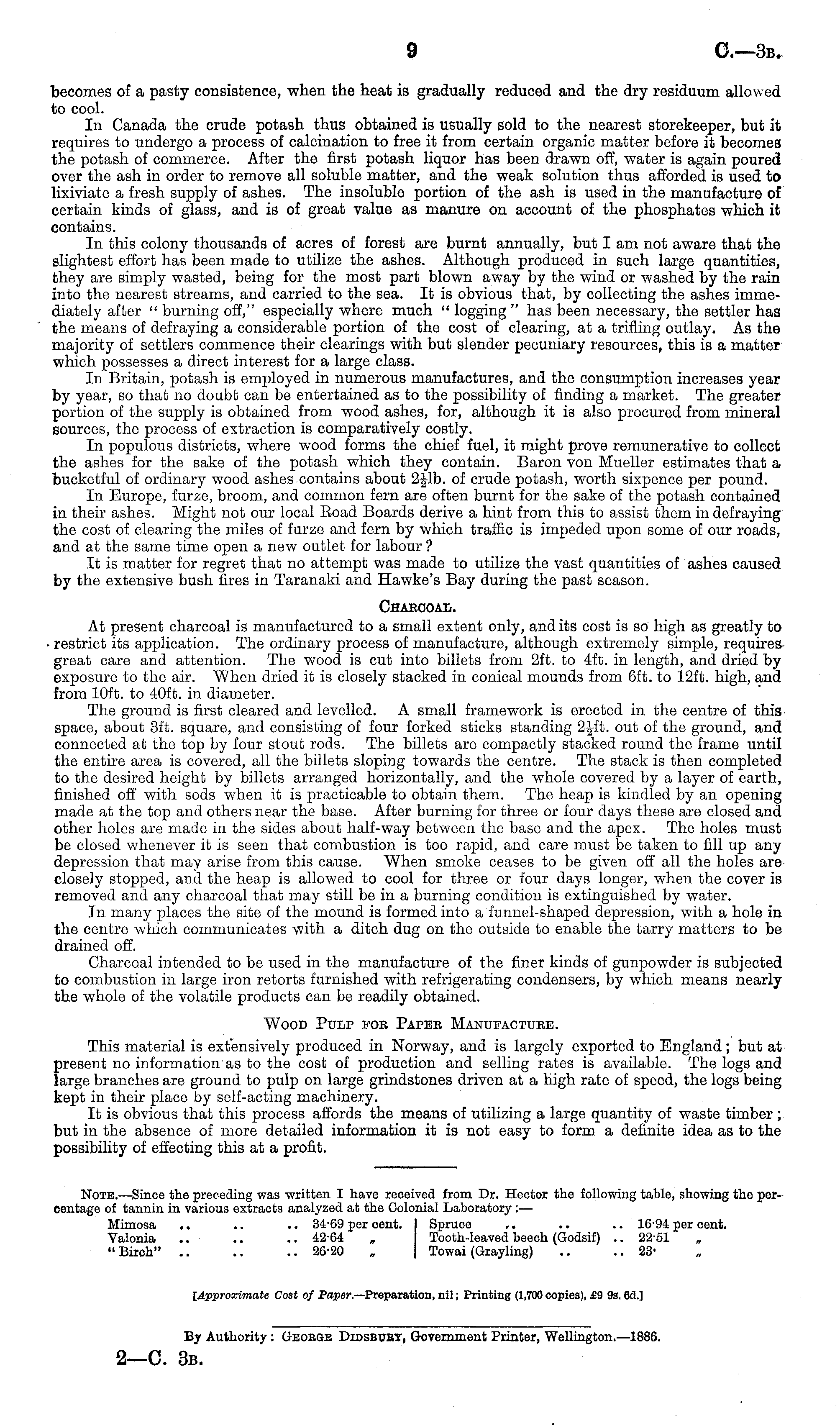 Note. —Since the preceding was written I have received from Dr. Hector the following table, showing the percentage of tannin in various extracts analyzed at the Colonial Laboratory :— Mimosa .. .. .. 34-69 per cent. Spruce .. .. .. 16-94 per cent. Valonia .. .. .. 42-64 „ Tooth-leaved beech (Godsif) .. 22-51 " Birch" .. .. .. 26-20 „ Towai (Grayling) .. .. 23--[Approximate Cost of Paper. —Preparation, nil; Printing (1,700 copies), £9 93.6d.]