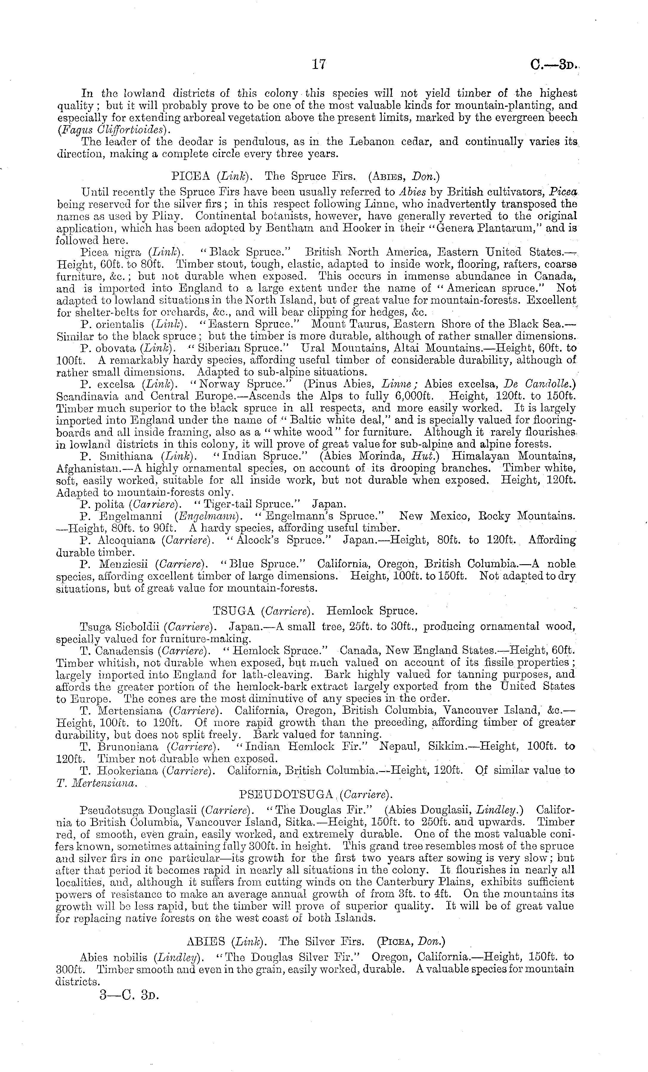 In the lowland districts of this colony this species will not yield timber of the highest quality; but it will probably prove to be one of the most valuable kinds for mountain-planting, and especially for extending arboreal vegetation above the present limits, marked by the evergreen beech (Fagus Oliffortioides) ■ The leader of the deodar is pendulous, as in the Lebanon cedar, and continually varies its direction, making a complete circle every three years. PICEA (Link). The Spruce Firs. (Abies, Don.) Until recently the Spruce Firs have been usually referred to Abies by British cultivators, Picea being reserved for the silver firs ; in this respect following Linne, who inadvertently transposed the names as used by Pliny. Continental botanists, however, have generally reverted to the original application, which has been adopted by Bentham and Hooker in their "Genera Plantarum," and is followed here. Picea nigra (Link). "Black Spruce." British North America, Eastern United States.— Height, 60ft. to 80ft. Timber stout, tough, elastic, adapted to inside work, flooring, rafters, coarse furniture, &c.; but not durable when exposed. This occurs in immense abundance in Canada, and is imported into England to a large extent under the name of " American spruce." Not adapted to lowland situations in the North IsLand, but of great value for mountain-forests. Excellent for shelter-belts for orchards, &c, and will bear clipping for hedges, &c. P. orientalis (Link). "Eastern Spruce." Mount Taurus, Eastern Shore of the Black Sea.—■ Similar to the black spruce.; but the timber is more durable, although of rather smaller dimensions. P. obovata (Link). " Siberian Spruce." Ural Mountains, Altai Mountains.—Height, 60ft. to 100ft. A remarkably hardy species, affording useful timber of considerable durability, although of rather small dimensions. Adapted to sub-alpine situations. P. excelsa (Link). "Norway Spruce." (Pinus Abies, Linne; Abies excelsa, De Candolle.) Scandinavia and Central Europe.—Ascends the Alps to fully 6,000ft. Height, 120ft. to 150ft. Timber much superior to the black spruce in all respects, and more easily worked. It is largely imported into England under the name of " Baltic white deal," and is specially valued for flooringboards and all inside framing, also as a " white wood " for furniture. Although it rarely flourishes in lowland districts in this colony, it will prove of great value for sub-alpine and alpine forests. P. Smithiana (Link). "Indian Spruce." (Abies Morinda, Hut.) Himalayan Mountains, Afghanistan. —A highly ornamental species, on account of its drooping branches. Timber white, soft, easily worked, suitable for all inside work, but not durable when exposed. Height, 120ft. Adapted to mountain-forests only. P. polita (Carriere). " Tiger-tail Spruce." Japan. P. Engelmanni (Engelmann). " Engolmann's Spruce." New Mexico, Rocky Mountains. —Height, 80ft. to 90ft. A hardy species, affording useful timber. P. vVlcoquiana (Carriere). " Alcock's Spruce." Japan.—Height, 80ft. to 120ft. Affording durable timber. P. Menziesii (Carriere). "Blue Spruce." California, Oregon, British Columbia.—A noble species, affording excellent timber of large dimensions. Height, 100ft. to 150ft. Not adapted to dry situations, but of great value for mountain-forests. TSUGA (Carriere). Hemlock Spruce. Tsuga Sioboldii (Carriere). Japan. —A small tree, 25ft. to 30ft., producing ornamental wood, specially valued for furniture-making. T. Canadensis (Carriere). " Hemlock Spruce." Canada, New England States. —Height, 60ft. Timber whitish, not durable when exposed, but much valued on account of its fissile properties ; largely imported into England for lath-cleaving. Bark highly valued for tanning purposes, and affords the greater portion of the hemlock-bark extract largely exported from the United States to Europe. The cones are the most diminutive of any species in the order. T. Mertensiana (Carriere). California, Oregon, British Columbia, Vancouver Island, &c.— Height, 100ft. to 120ft. Of more rapid growth than the preceding, affording timber of greater durability, but does not split freely. Bark valued for tanning. T. Brunoniana (Carriere). "Indian Hemlock Fir." Nepaul, Sikkim.—Height, 100ft. to 120ft. Timber not durable when exposed. T. Hookeriana (Carriere). California, British Columbia.—Height, 120ft. Of similar value to T. Mertensiana. PSEUDOTSUGA (Carriere). Pseudotsuga Douglasii (Carriere). " The Douglas Fir." (Abies Douglasii, Lindley.) California to British Columbia, Vancouver Island, Sitka.—Height, 150ft. to 250ft. and upwards. Timber red, of smooth, even grain, easily worked, and extremely durable. One of the most valuable conifers known, sometimes attaining fully 300ft. in height. This grand tree resembles most of the spruce and silver firs in one particular—its growth for the first two years after sowing is very slow; but after that period it becomes rapid in nearly all situations in the colony. It flourishes in nearly all localities, and, although it suffers from cutting winds on the Canterbury Plains, exhibits sufficient powers of resistance to make an average annual growth of from 3ft. to 4ft. On the mountains its growth will bo less rapid, but the timber will prove of superior quality. It will be of great value for replacing native forests on the west coast of both Islands. ABIES (Link). The Silver Firs. (Picea, Don.) Abies nobilis (Lindley). "The Douglas Silver Fir." Oregon, California.—Height, 150ft. to 300ft. Timber smooth and even in the grain, easily worked, durable. A valuable species for mountain districts. 3—C. 3d.