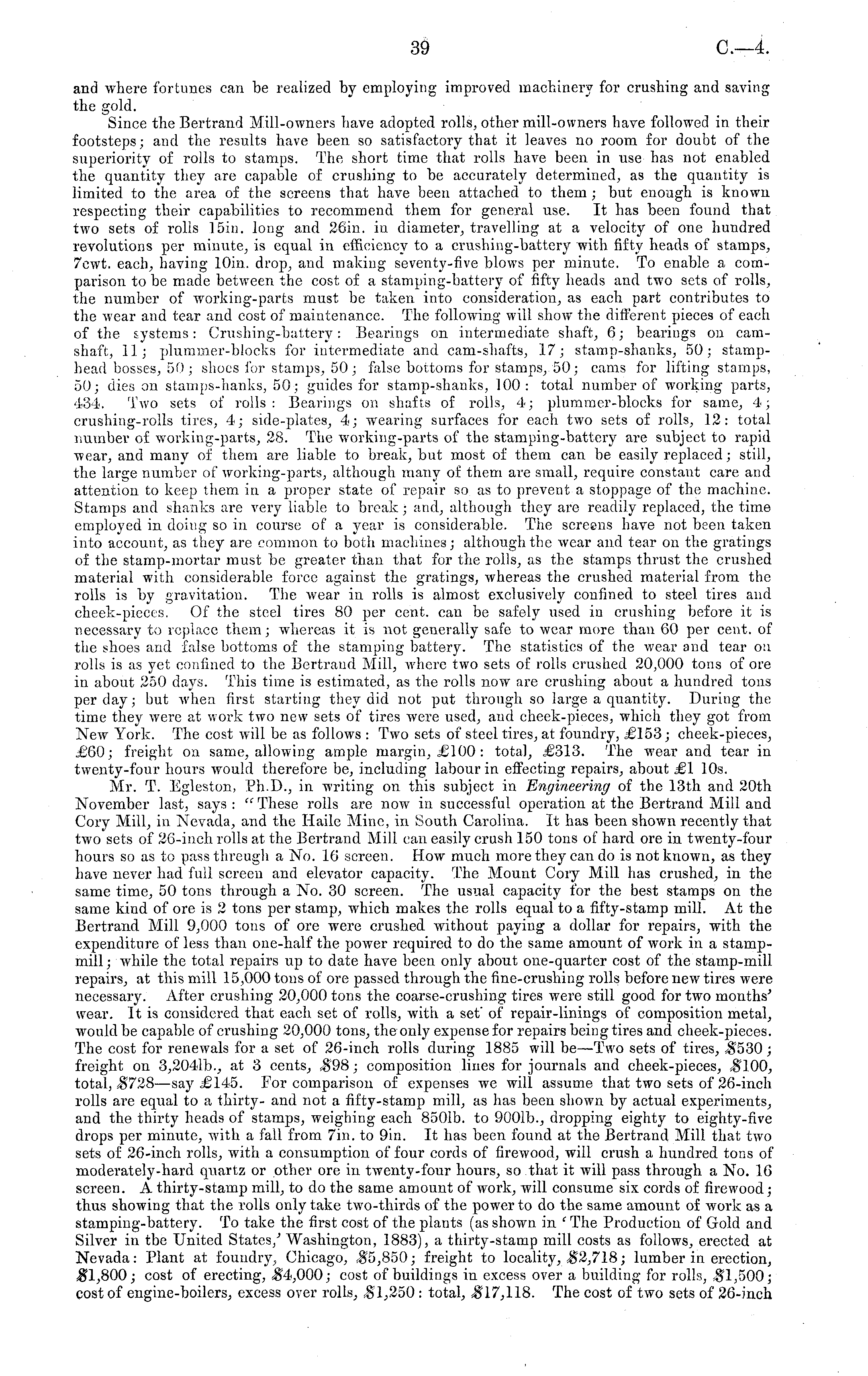 and where fortunes can be realized by employing improved machinery for crushing and saving the gold. Since the Bertrand Mill-owners have adopted rolls, other mill-owners have followed in their footsteps; and the results have been so satisfactory that it leaves no room for doubt of the superiority of rolls to stamps. The short time that rolls have been in use has not enabled the quantity they are capable of crushing to be accurately determined, as the quantity is limited to the area of the screens that have been attached to them ; but enough is known respecting their capabilities to recommend them for general use. It has been found that two sets of rolls 15in. long and 26in. in diameter, travelling at a velocity of one hundred revolutions per minute, is equal in efficiency to a crushing-battery with fifty heads of stamps, 7cwt. each, having lOin. drop, and making seventy-five blows per minute. To enable a comparison to be made between the cost of a stamping-battery r of fifty heads and two sets of rolls, the number of working-parts must be taken into consideration, as each part contributes to the wear and tear and cost of maintenance. The following will show the different pieces of each of the systems: Crushing-battery: Bearings on intermediate shaft, 6; bearings on camshaft, 11; plummer-blocks for intermediate and cam-shafts, 17; stamp-shanks, 50; stamphead bosses, 50 ; shoes for stamps, 50; false bottoms for stamps, 50; cams for lifting stamps, 50; dies on stamps-hanks, 50; guides for stamp-shanks, 100 : total number of working parts, 434. Two sets of rolls: Bearings on shafts of rolls, 4; plummer-blocks for same, 4; crushing-rolls tires, 4; side-plates, 4; wearing surfaces for each two sets of rolls, 12: total number of working-parts, 28. The working-parts of the stamping-battery are subject to rapid wear, and many of them are liable to break, but most of them can be easily replaced; still, the large number of working-parts, although many of them are small, require constant care and attention to keep them in a proper state of repair so as to prevent a stoppage of the machine. Stamps and shanks are very liable to break; and, although they are readily replaced, the time employed in doing so in course of a year is considerable. The screens have not been taken into account, as they are common to both machines; although the wear and tear on the gratings of the stamp-mortar must be greater than that for the rolls, as the stamps thrust the crushed material with considerable force against the gratings, whereas the crushed material from the rolls is by gravitation. The wear in rolls is almost exclusively confined to steel tires and cheek-pieces. Of the steel tires 80 per cent, can be safely used in crushing before it is necessary to replace them; whereas it is not generally safe to wear more than 60 per cent, of the shoes and false bottoms of the stamping battery. The statistics of the wear and tear on rolls is as yet confined to the Bertrand Mill, where two sets of rolls crushed 20,000 tons of ore in about 250 days. This time is estimated, as the rolls now are crushing about a hundred tons, per day; but when first starting they did not put through so large a quantity. During the time they were at work two new sets of tires were used, and cheek-pieces, which they got from New York. The cost will be as follows : Two sets of steel tires, at foundry, £153; cheek-pieces, £60; freight on same, allowing ample margin, £100 : total, £313. The wear and tear in twenty-four hours would therefore be, including labour in effecting repairs, about £1 10s. Mr. T. Egleston, Ph.D., in writing on this subject in Engineering of the 13th and 20th November last, says: "These rolls are now in successful operation at the Bertrand Mill and Cory Mill, in Nevada, and the Haile Mine, in South Carolina. It has been shown recently that two sets of 26-inch rolls at the Bertrand Mill can easily crush 150 tons of hard ore in twenty-four hours so as to pass through a No. 16 screen. How much more they can do is not known, as they have never had full screen and elevator capacity. The Mount Cory Mill has crushed, in the same time, 50 tons through a No. 30 screen. The usual capacity for the best stamps on the same kind of ore is 2 tons per stamp, which makes the rolls equal to a fifty-stamp mill. At the Bertrand Mill 9,000 tons of ore were crushed without paying a dollar for repairs, with the expenditure of less than one-half the power required to do the same amount of work in a stampmill; while the total repairs up to date have been only about one-quarter cost of the stamp-mill repairs, at this mill 15,000 tons of ore passed through the fine-crushing rolls before new tires were necessary. After crushing 20,000 tons the coarse-crushing tires were still good for two months' wear. It is considered that each set of rolls, with a set' of repair-linings of composition metal, would be capable of crushing 20,000 tons, the only expense for repairs being tires and cheek-pieces. The cost for renewals for a set of 26-inch rolls during 1885 will be—Two sets of tires, $530 ; freight on 3,2041b., at 3 cents, $98; composition lines for journals and cheek-pieces, $100, total, $728 —say £145. For comparison of expenses we will assume that two sets of 26-inch rolls are equal to a thirty- and not a fifty-stamp mill, as has been shown by actual experiments, and the thirty heads of stamps, weighing each 8501b. to 9001b., dropping eighty to eighty-five drops per minute, with a fall from 7in. to 9in. It has been found at the Bertrand Mill that two sets of 26-inch rolls, with a consumption of four cords of firewood, will crush a hundred tons of moderately-hard quartz or other ore in twenty-four hours, so that it will pass through a No. 16 screen. A thirty-stamp mill, to do the same amount of work, will consume six cords of firewood; thus showing that the rolls only take two-thirds of the power to do the same amount of work as a stamping-battery.
