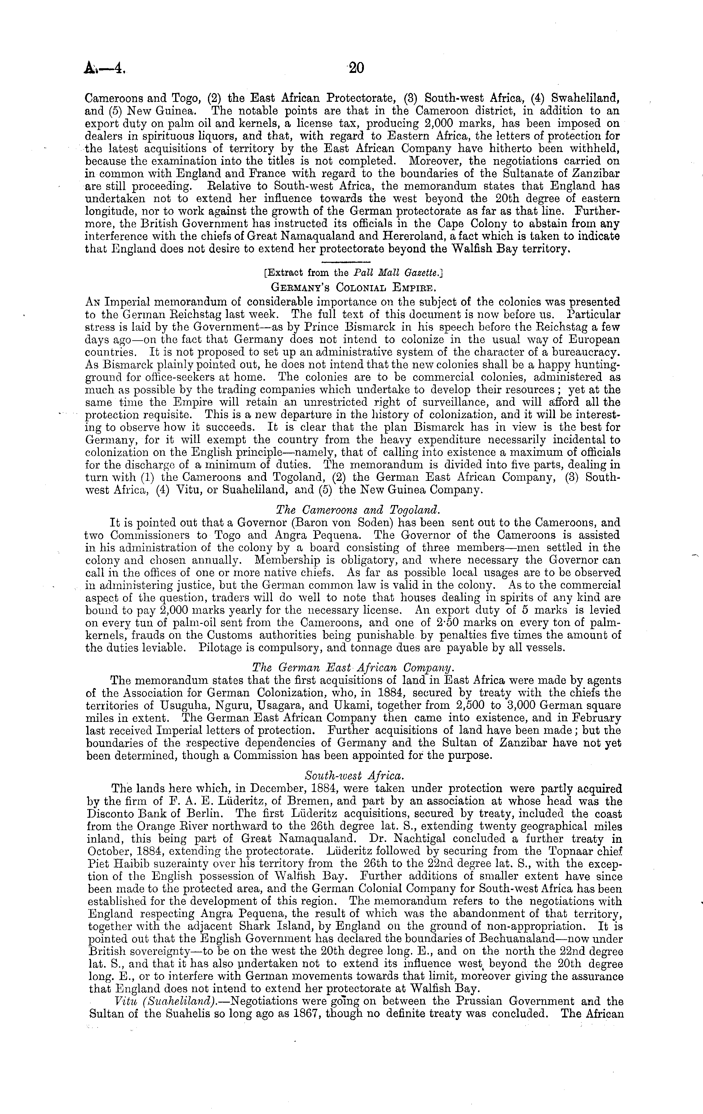 Cameroons and Togo, (2) the Bast African Protectorate, (3) South-west Africa, (4) Swaheliland, and (5) New Guinea. The notable points are that in the Cameroon district, in addition to an export duty on palm oil and kernels, a license tax, producing 2,000 marks, has been imposed on dealers in spirituous liquors, and that, with regard to Eastern Africa, the letters of protection for the latest acquisitions of territory by the East African Company have hitherto been withheld, because the examination into the titles is not completed. Moreover, the negotiations carried on in common with England and France with regard to the boundaries of the Sultanate of Zanzibar are still proceeding. Eelative to South-west Africa, the memorandum states that England has undertaken not to extend her influence towards the west beyond the 20th degree of eastern longitude, nor to work against the growth of the German protectorate as far as that line. Furthermore, the British Government has instructed its officials in the Cape Colony to abstain from any interference with the chiefs of Great Namaqualand and Hereroland, a fact which is taken to indicate that England does not desire to extend her protectorate beyond the Walfish Bay territory.