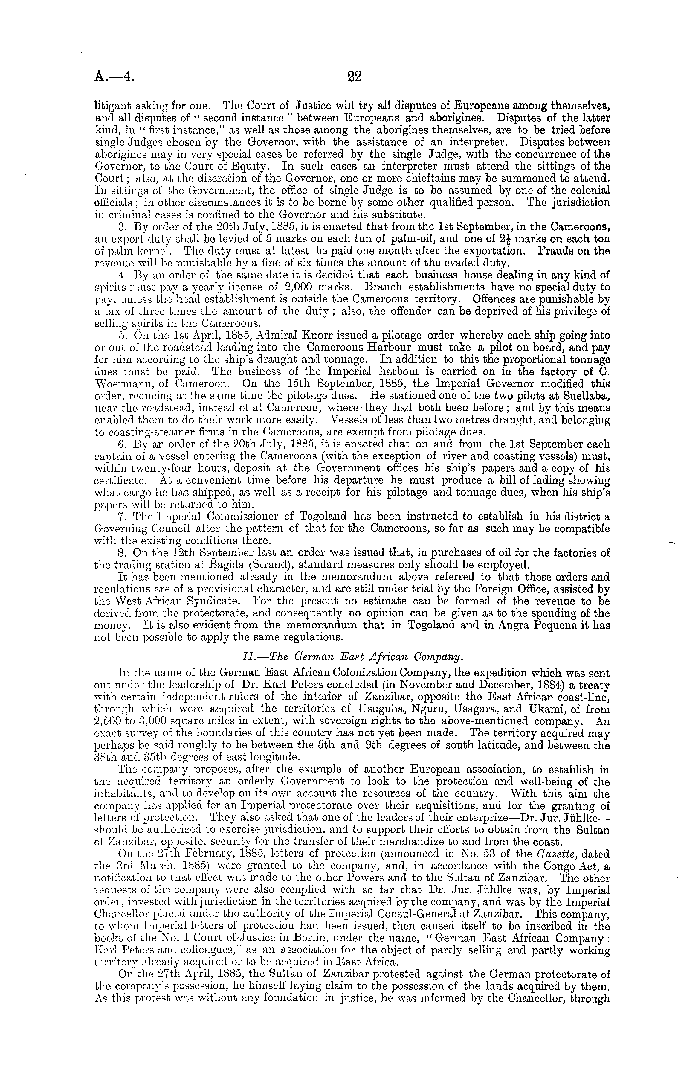 litigant asking for one. The Court of Justice will try all disputes of Europeans among themselves, and all disputes of " second instance " between Europeans and aborigines. Disputes of the latter kind, in " first instance," as well as those among the aborigines themselves, are to be tried before single Judges chosen by the Governor, with the assistance of an interpreter. Disputes between aborigines may in very special cases be referred by the single Judge, with the concurrence of the Governor, to the Court of Equity. In such cases an interpreter must attend the sittings of the Court; also, at the discretion of the Governor, one or more chieftains may be summoned to attend. In sittings of the Government, the office of single Judge is to be assumed by one of the colonial officials ; in other circumstances it is to be borne by some other qualified person. The jurisdiction in criminal cases is confined to the Governor and his substitute. 3. By order of the 20th July, 1885, it is enacted that from the Ist September, in the Cameroons, an export duty shall be levied of 5 marks on each tun of palm-oil, and one of 2f marks on each ton of palm-kernel. The duty must at latest bo paid one month after the exportation. Frauds on the revenue will be punishable by a fine of six times the amount of the evaded duty. 4. By an order of the same date it is decided that each business house dealing in any kind of spirits must pay a yearly license of 2,000 marks. Branch establishments have no special duty to pay, unless the head establishment is outside the Cameroons territory. Offences are punishable by a tax of three times the amount of the duty ; also, the offender can be deprived of his privilege of selling spirits in the Cameroons. 5. On the Ist April, 1885, Admiral Knorr issued a pilotage order whereby each ship going into or out of the roadstead leading into the Cameroons Harbour must take a pilot on board, and pay for him according to the ship's draught and tonnage. In addition to this the proportional tonnage dues must be paid. The business of the Imperial harbour is carried on in the factory of C. Woermann, of Cameroon. On the 15th September, 1885, the Imperial Governor modified this order, reducing at the same time the pilotage dues. He stationed one of the two pilots at Suellaba, near the roadstead, instead of at Cameroon, where they had both been before ; and by this means enabled them to do their work more easily. Vessels of less than two metres draught, and belonging to coasting-steamer firms in the Cameroons, are exempt from pilotage dues. 6. By an order of the 20th July, 1885, it is enacted that on and from the Ist September each captain of a vessel entering the Cameroons (with the exception of river and coasting vessels) must, within twenty-four hours, deposit at the Government offices his ship's papers and a copy of his certificate. At a convenient time before his departure he must produce a bill of lading showing what cargo he has shipped, as well as a receipt for his pilotage and tonnage dues, when his ship's papers will be returned to him. 7. The Imperial Commissioner of Togoland has been instructed to establish in his district a Governing Council after the pattern of that for the Cameroons, so far as such may be compatible with the existing conditions there. 8. On the 12th September last an order was issued that, in purchases of oil for the factories of the trading station at Bagida (Strand), standard measures only should be employed. It has been mentioned already in the memorandum above referred to that these orders and regulations are of a provisional character, and are still under trial by the Foreign Office, assisted by the West African Syndicate. For the present no estimate can be formed of the revenue to be derived from the protectorate, and consequently no opinion can be given as to the spending of the money. It is also evident from the memorandum that in Togoland and in Angra Pequena it has not been possible to apply the same regulations. ll. — The German East African Company. In the name of the German East African Colonization Company, the expedition which was sent out under the leadership of Dr. Karl Peters concluded (in November and December, 1884) a treaty with certain independent rulers of the interior of Zanzibar, opposite the East African coast-line, through which were acquired the territories of Usuguha, Nguru, Usagara, and Ukami, of from 2,500 to 3,000 square miles in extent, with sovereign rights to the above-mentioned company. An exact survey of the boundaries of this country has not yet been made. The territory acquired may perhaps be said roughly to be between the sth and 9th degrees of south latitude, and between the 38th and 35th degrees of east longitude. The company proposes, after the example of another European association, to establish in the acquired territory an orderly Government to look to the protection and well-being of the inhabitants, and to develop on its own account the resources of the country. With this aim the company has applied for an Imperial protectorate over their acquisitions, and for the granting of letters of protection. They also asked that one of the leaders of their enterprize—Dr. Jur. Jiihlke— should be authorized to exercise jurisdiction, and to support their efforts to obtain from the Sultan of Zanzibar, opposite, security for the transfer of their merchandize to and from the coast. On tho 27th February, 1885, letters of protection (announced in No. 53 of the Gazette, dated the 3rd March, 1885) were granted to the company, and, in accordance with the Congo Act, a notification to that effect was made to the other Powers and to the Sultan of Zanzibar, The other requests of the company were also complied with so far that Dr. Jur. Jiihlke was, by Imperial order, invested with jurisdiction in the territories acquired by the company, and was by the Imperial Chancellor placed under the authority of the Imperial Consul-General at Zanzib