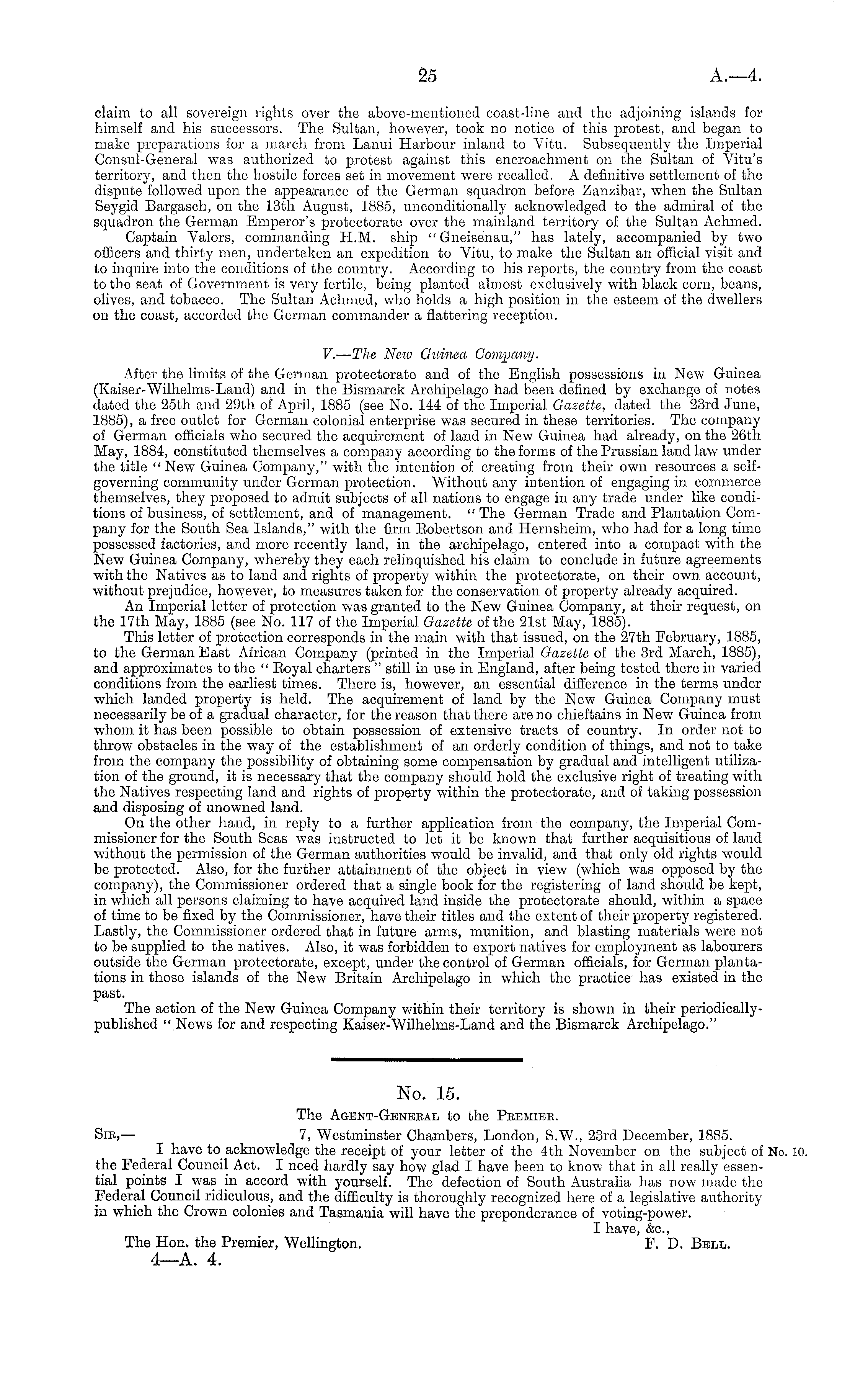 claim to all sovereign rights over the above-mentioned coast-line and the adjoining islands for himself and his successors. The Sultan, however, took no notice of this protest, and began to make preparations for a march from Lanui Harbour inland to Vitu. Subsequently the Imperial Consul-General was authorized to protest against this encroachment on the Sultan of Vitu's territory, and then the hostile forces set in movement were recalled. A definitive settlement of the dispute followed upon the appearance of the German squadron before Zanzibar, when the Sultan Seygid Bargasch, on the 13th August, 1885, unconditionally acknowledged to the admiral of the squadron the German Emperor's protectorate over the mainland territory of the Sultan Achmed. Captain Valors, commanding H.M. ship " Gneisenau," has lately, accompanied by two officers and thirty men, undertaken an expedition to Vitu, to make the Sultan an official visit and to inquire into the conditions of the country. According to his reports, the country from the coast to tho seat of Government is very fertile, being planted almost exclusively with black corn, beans, olives, and tobacco. Tho Sultan Achmed, who holds a high position in the esteem of the dwellers on the coast, accorded the German commander a flattering reception. V. — The Ncio Guinea Company. After the limits of the German protectorate and of the English possessions in New Guinea (Kaiser-Wilhehns-Land) and in the Bismarck Archipelago had been defined by exchange of notes dated the 25th and 29th of April, 1885 (see No. 144 of the Imperial Gazette, dated the 23rd June, 1885), a free outlet for German colonial enterprise was secured in these territories. The company of German officials who secured the acquirement of land in New Guinea had already, on the 26th May, 1884, constituted themselves a company according to the forms of the Prussian land law under the title "New Guinea Company," with the intention of creating from their own resources a selfgoverning community under German protection. Without any intention of engaging in commerce themselves, they proposed to admit subjects of all nations to engage in any trade under like conditions of business, of settlement, and of management. " The German Trade and Plantation Company for the South Sea Islands," with the firm Eobertson and Hernsheim, who had for a long time possessed factories, and more recently land, in the archipelago, entered into a compact with the New Guinea Company, whereby they each relinquished his claim to conclude in future agreements with the Natives as to land and rights of property within the protectorate, on their own account, without prejudice, however, to measures taken for the conservation of property already acquired. An Imperial letter of protection was granted to the New Guinea Company, at their request, on the 17th May, 1885 (see No. 117 of the Imperial Gazette of the 21st May, 1885). This letter of protection corresponds in the main with that issued, on the 27th February, 1885, to the German East African Company (printed in the Imperial Gazette of the 3rd March, 1885), and approximates to the " Eoyal charters " still in use in England, after being tested there in varied conditions from the earliest times. There is, however, an essential difference in the terms under which landed property is held. The acquirement of land by the New Guinea Company must necessarily be of a gradual character, for the reason that there are no chieftains in New Guinea from whom it has been possible to obtain possession of extensive tracts of country. In order not to throw obstacles in the way of the establishment of an orderly condition of things, and not to take from the company the possibility of obtaining some compensation by gradual and intelligent utilization of the ground, it is necessary that the company should hold the exclusive right of treating with the Natives respecting land and rights of property within the protectorate, and of taking possession and disposing of unowned land. On the other hand, in reply to a further application from the company, the Imperial Commissioner for the South Seas was instructed to let it be known that further acquisitions of land without the permission of the German authorities would be invalid, and that only old rights would be protected. Also, for the further attainment of the object in view (which was opposed by the company), the Commissioner ordered that a single book for the registering of land should be kept, in which all persons claiming to have acquired land inside the protectorate should, within a space of time to be fixed by the Commissioner, have their titles and the extent of their property registered. Lastly, the Commissioner ordered that in future arms, munition, and blasting materials were not to be supplied to the natives. Also, it was forbidden to export natives for employment as labourers outside the German protectorate, except, under the control of German officials, for German plantations in those islands of the New Britain Archipelago in which the practice' has existed in the past. The action of the New Guinea Company within their territory is shown in their periodicallypublished " News for and respecting Kaiser-Wilhelms-Land and the Bismarck Archipelago."