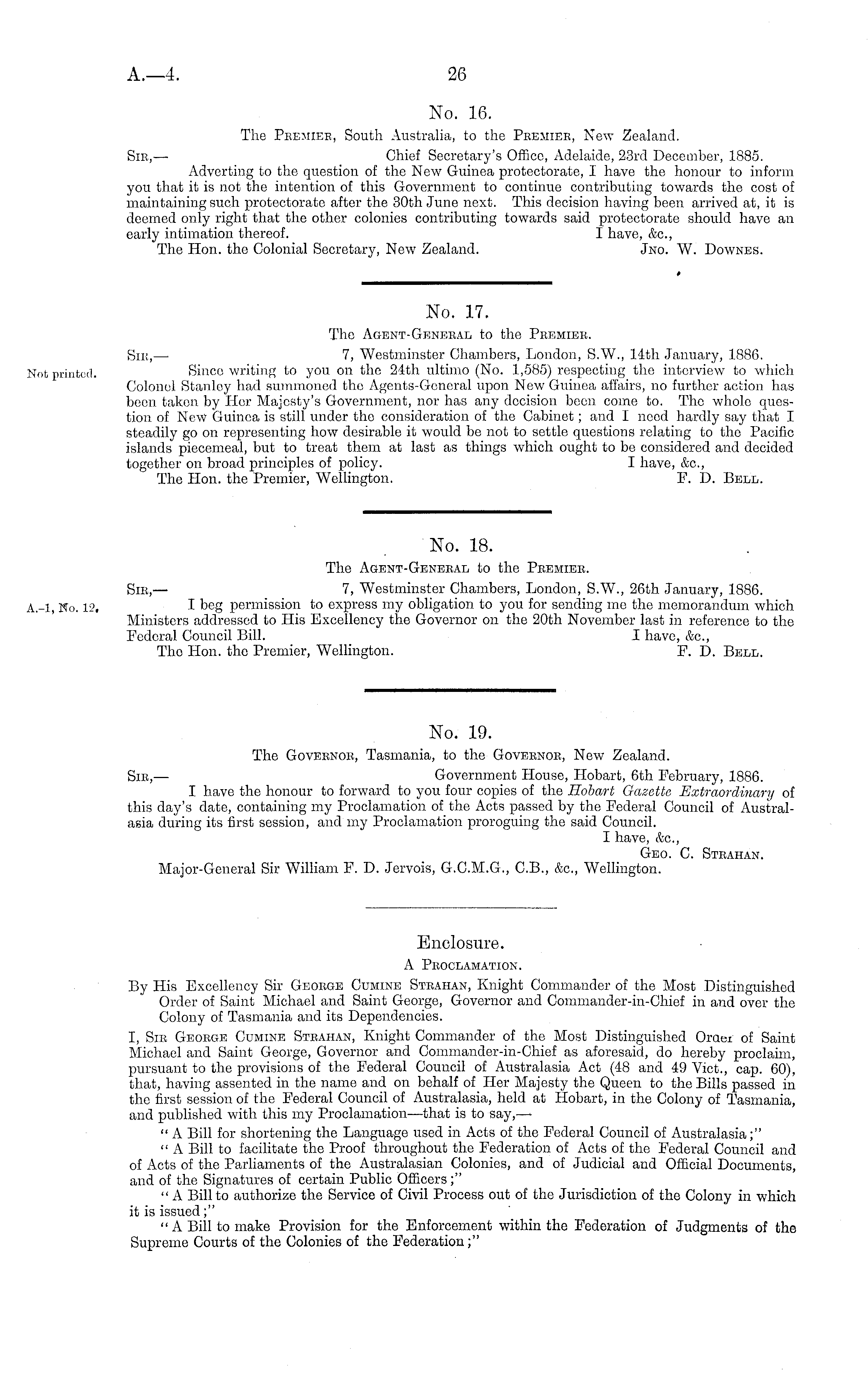 No. 19. The Governor, Tasmania, to the Governor, New Zealand. Sir, — Government House, Hobart, 6th February, 1886. I have the honour to forward to you four copies of the Hobart Gazette Extraordinary of this day's date, containing my Proclamation of the Acts passed by the Federal Council of Australasia during its first session, and my Proclamation proroguing the said Council. I have, &c, Geo. C. Strahan. Major-General Sir William F. D. Jervois, G.C.M.G., C.8., &c, Wellington.