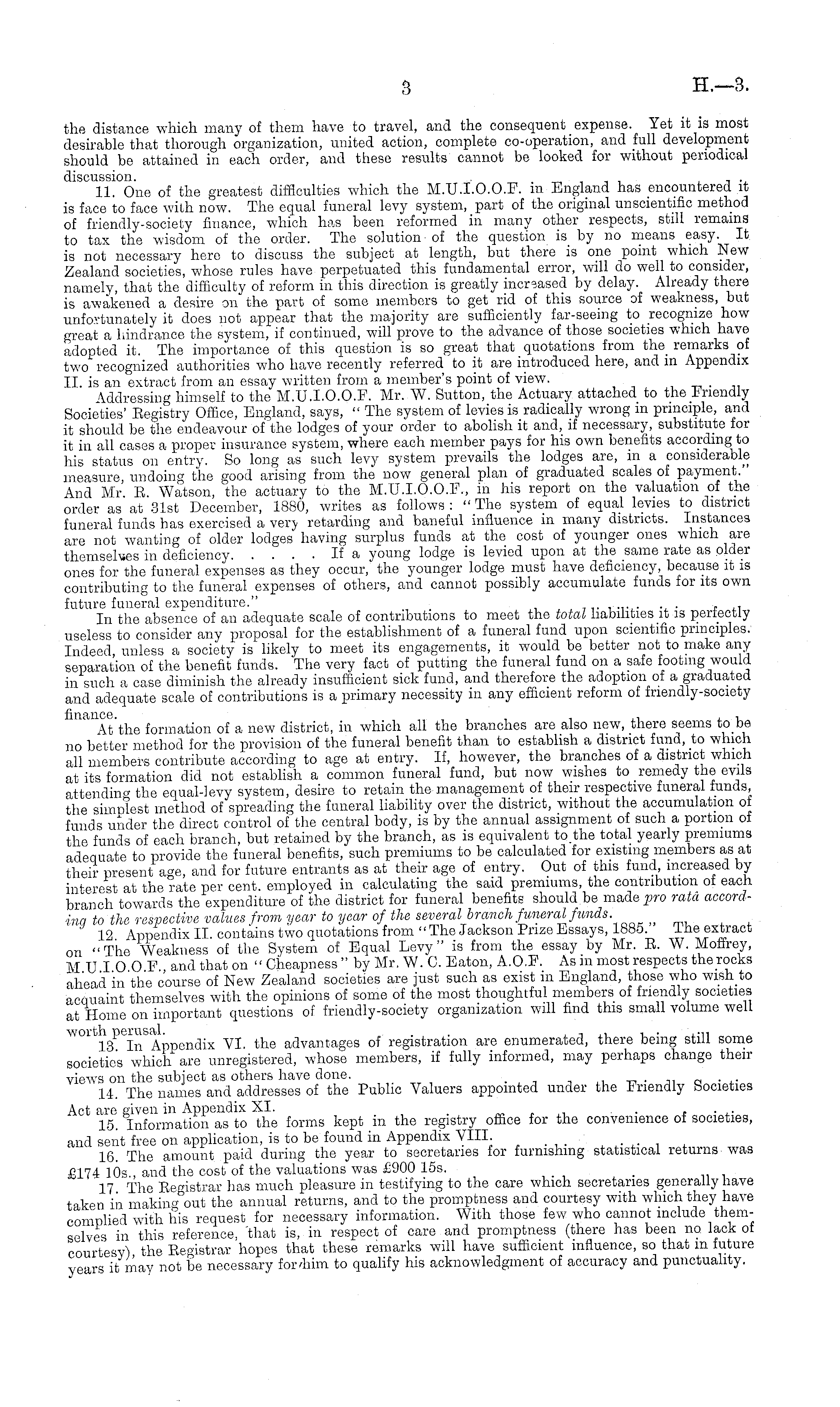 the distance which many of them have to travel, and the consequent expense. Yet it is most desirable that thorough organization, united action, complete co-operation, and full development should be attained in each order, and these results cannot be looked for without periodical discussion. , , . . 11. One of the greatest difficulties which the M.U.1.0.0.F. in England has encountered it is face to face with now. The equal funeral levy system, part of the original unscientific method of friendly-society finance, which has been reformed in many other respects, still remains to tax the wisdom of the order. The solution of the question is by no means easy. It is not necessary here to discuss the subject at length, but there is one point which New Zealand societies, whose rules have perpetuated this fundamental error, will do well to consider, namely, that the difficulty of reform in this direction is greatly increased by delay. Already there is awakened a desire on the part of some members to get rid of this source of weakness, but unfortunately it does not appear that the majority are sufficiently far-seeing to recognize how great a hindrance the system, if continued, will prove to the advance of those societies which have adopted it. The importance of this question is so great that quotations from the_ remarks of two recognized authorities who have recently referred to it are introduced here, and in Appendix II is an extract from an essay written from a member's point of view. Addressing himself to the M.U.1.0.0.F. Mr. W. Button, the Actuary attached to the Friendly Societies' Registry Office, England, says, " The system of levies is radically wrong in principle, and it should be the endeavour of the lodges of your order to abolish it and, if necessary, substitute for it in all cases a proper insurance system, where each member pays for his own benefits according to his status on entry. So long as such levy system prevails the lodges are, in a considerable measure, undoing the good arising from the now general plan of graduated scales of payment. And Mr E Watson, the actuary to the M.U.1.0.0.F., in his report on the valuation of the order as at 31st December, 1880, writes as follows: "The system of equal levies to district funeral funds has exercised a very retarding and baneful influence in many districts. Instances are not wanting of older lodges having surplus funds at the cost of younger ones which are themselves in deficiency If a young lodge is levied upon at the same rate as older ones for the funeral expenses as they occur, the younger lodge must have deficiency, because it is contributing to the funeral expenses of others, and cannot possibly accumulate funds for its own future funeral expenditure." ~.,.,.,. .^ . . ~ In the absence of an adequate scale of contributions to meet the total liabilities it is perfectly useless to consider any proposal for the establishment of a funeral fund upon scientific principles. Indeed unless a society is likely to meet its engagements, it would be better not to make any separation of the benefit funds. The very fact of putting the funeral fund on a safe footing would in such a case diminish the already insufficient sick fund, and therefore the adoption of a graduated and adequate scale of contributions is a primary necessity in any efficient reform of friendly-society Till 1 TIPP At'the formation of a new district, in which all the branches are also new, there seems to be no better method for the provision of the funeral benefit than to establish a district fund, to which all members contribute according to age at entry. If, however, the branches of a district which at its formation did not establish a common funeral fund, but now wishes to remedy the evils attending the equal-levy system, desire to retain the management of their respective funeral funds, the simplest method of spreading the funeral liability over the district, without the accumulation of funds under the direct control of the central body, is by the annual assignment of such a portion of the funds of each branch, but retained by the branch, as is equivalent to the total yearly premiums adequate to provide the funeral benefits, such premiums to be calculated for existing members as at their present age, and for future entrants as at their age of entry. Out of this fund increased by interest at the rate per cent, employed in calculating the said premiums, the contribution of each branch towards the expenditure of the district for funeral benefits should be made pro raid according to the respective values from year to year of the several branch funeral funds 12 Appendix 11. contains two quotations from "The Jackson Prize Essays, 1885. Ihe extract on "The Weakness of the System of Equal Levy" is from the essay by Mr. E. W. Monrey, MUI 0O F and that on " Cheapness "by Mr. W. C. Eaton, A.O.F. As in most respects the rocks ahead in the course of New Zealand societies are just such as exist in England, those who wish to acquaint themselves with the opinions of some of the most thoughtful members of friendly societies at Home on important questions of friendly-society organization will find this small volume well worth perusal. . ~ , . ~,, 13 In Appendix VI. the advantages of registration are enumerated, there being still some societies which are unregistered, whose members, if fully informed, may perhaps change their views on the subject as others have done. _ . . 14. The names and addresses of the Public Valuers appointed under the Friendly Societies Act are given in Appendix XI. . . . . 15. Information as to the forms kept in the registry office for the convenience of societies, and sent free on application, is to be found in Appendix VIII. 16. The amount paid during the year to secretaries for furnishing statistical returns was £174 10s and the cost of the valuations was £900 15s. 17 The Eegistrar has much pleasure in testifying to the care which secretaries generally have taken in