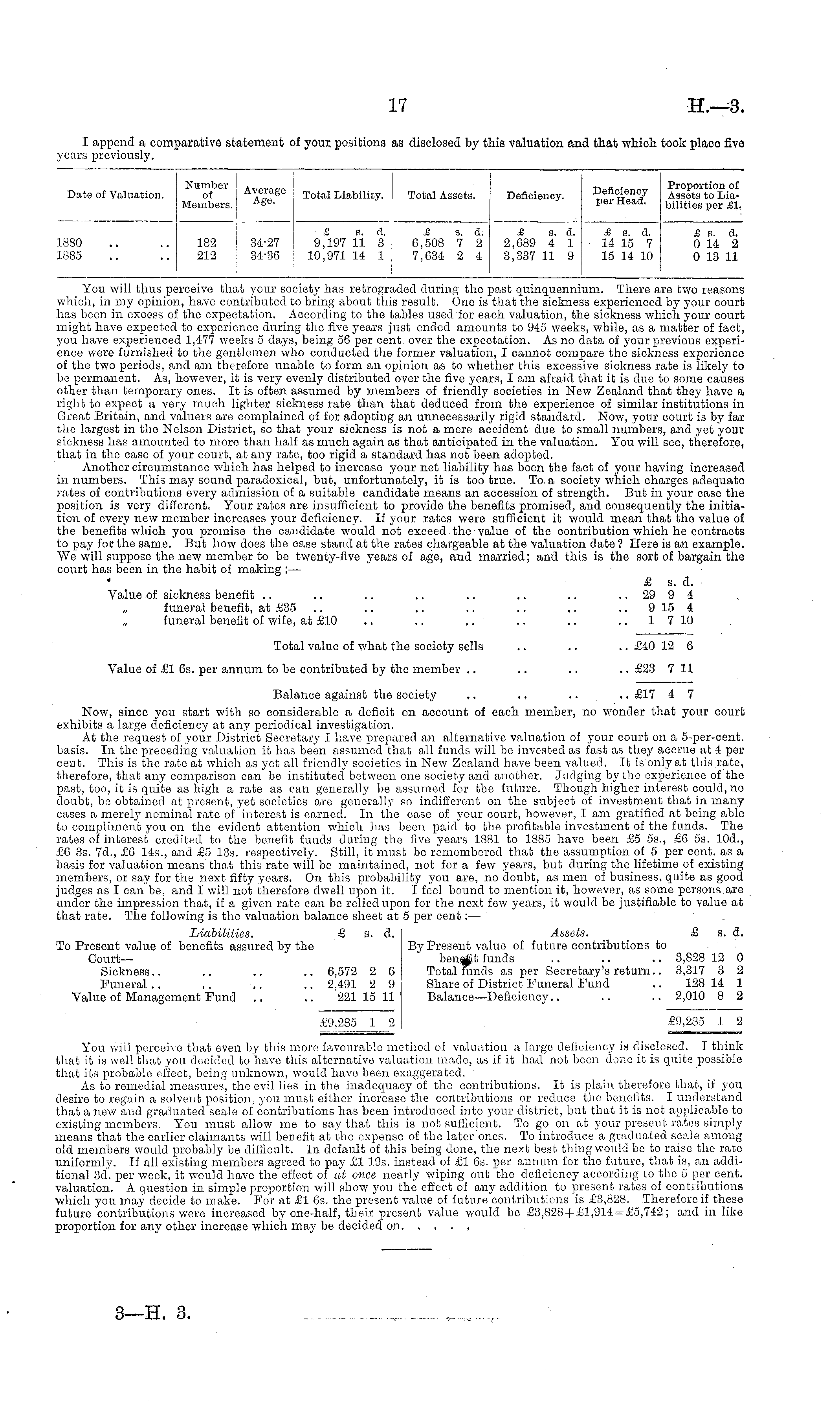 You will thus perceive that your society has retrograded during the past quinquennium. There are two reasons which, in my opinion, have contributed to bring about this result. Ono is that the sickness experienced by your court has been in excess of the expectation. According to the tables used for each valuation, the sickness which your court might have expected to experience during the five years just ended amounts to 945 weeks, while, as a matter of fact, you have experienced 1,477 weeks 5 days, being 56 per cent, over the expectation. As no data of your previous experience were furnished to the gentlemen who conducted the former valuation, I cannot compare the sickness experience of the two periods, and am therefore unable to form an opinion as to whether this excessive sickness rate is likely to be permanent. As, however, it is very evenly distributed over the five years, lam afraid that it is due to some causes other than temporary ones. It is often assumed by members of friendly societies in New Zealand that they have a right to expect a very much lighter sickness rate than that deduced from the experience of similar institutions in Great Britain, and valuers are complained of for adopting an unnecessarily rigid standard. Now, your court is by far the largest in the Nelson District, so that your sickness is not a mere accident due to small numbers, and yet your sickness has amounted to more than half as much again as that anticipated in the valuation. You will see, therefore, that in the case of your court, at any rate, too rigid a standard has not been adopted. Another circumstance which has helped to increase your net liability has been the fact of your having increased in numbers. This may sound paradoxical, but, unfortunately, it is too true. To a society which charges adequate rates of contributions every admission of a suitable candidate means an accession of strength. But in your case the position is very different, Your rates are insufficient to provide the benefits promised, and consequently the initiation of every new member increases your deficiency. If your rates were sufficient it would mean that the value of the benefits which you promise the candidate would not exceed the value of the contribution which he contracts to pay for the same. But how does the case stand at the rates chargeable at the valuation date ? Here is an example. We will suppose the new member to be twenty-five years of age, and married; and this is the sort of bargain the court has been in the habit of making : — £ s. a. Value of sickness benefit .. .. .. .. .. .. .. 29 9 4 funeral benefit, at £35 .. .. .. .. .. .. 915 4 „ funeral benefit of wife, at £10 ■. .. .. .. .. 1 7 10 Total value of what the society sells .. .. .. £40 12 G Value of £1 6s. per annum to be contributed by the member .. .. .. .. £23 7 11 Balance against the society .. .. .. .. £17 4 7 Now, since you start with so considerable a deficit on account of each member, no wonder that your court exhibits a large deficiency at any periodical investigation. At the request of your District Secretary I have prepared an alternative valuation of your court on a 5-per-cent. basis. In the preceding valuation it has been assumed that all funds will be invested as fast as they accrue at 4 per cent. This is the rate at which a.s yet all friendly societies in New Zealand have been valued. It is only at this rate, therefore, that any comparison can bo instituted botweon one society and another. Judging by the experience of the past, too, it is quite as high a rate as can generally bo assumed for the future. Though higher interest could, no doubt, be obtained at present, yet societies are generally so indifferent on the subject of investment that in many cases a merely nominal rate of interest is earned. In the case of your court, however, lam gratified at being able to compliment you on the evident attention which has been paid to the profitable investment of the funds. The rates of interest credited to the benefit funds during the five years 1881 to 1885 have been £5 55., £G ss. 10d., £6 3s. 7d., £G 145., and £5 13s. respectively. Still, it must be remembered that the assumption of 5 per cent, as a basis for valuation means that this rate will be maintainod, not for a few years, but during the lifetime of existing members, or say for the next fifty years. On this probability you are, no doubt, as men of business, quite as good judges as I can be, and I will not therefore dwell upon it. I feel bound to mention it, however, as some persons are under the impression that, if a given rate can be relied upon for the next few years, it would bo justifiable to value at that rate. The following is the valuation balance sheet at 5 per cent: — Liabilities. £ s. d. Assets. £ s. d. To Present value of benefits assured by tho By Present value of future contributions to Court— ben^t funds .. .. .. 3,828 12 0 Sickness.. .. .. .. 0,572 2 G Total funds as per Secretary's return.. 3,317 3 2 Funeral.. .. .. .. 2,491 2 9 Share of District Funeral Fund .. 128 14 1 Value of Management Fund .. .. 22115 11 Balance—Deficiency.. .. .. 2,010 8 2 £9,285 1 2 £9,285 1 2 You wiil perceive that even by this more favourable method of valuation a large deficiency is disclosed. I think that it is well that you decided to have this alternative valuation made, as if it had not been done it is quite possible that its probable effect, being unknown, would have been exaggerated. As to remedial measures, the evil lies in the inadequacy of the contributions. It is plain therefore that, if you desire to regain a solvent position, you must either increase the contributions or reduce the benefits. I understand that a new and graduated scale of contributions has been introduced into your district, but that it is not applicable to existing members. You must allow me to say that this is not sufficient. To go on at your present rates simply means that tho earlier claim
