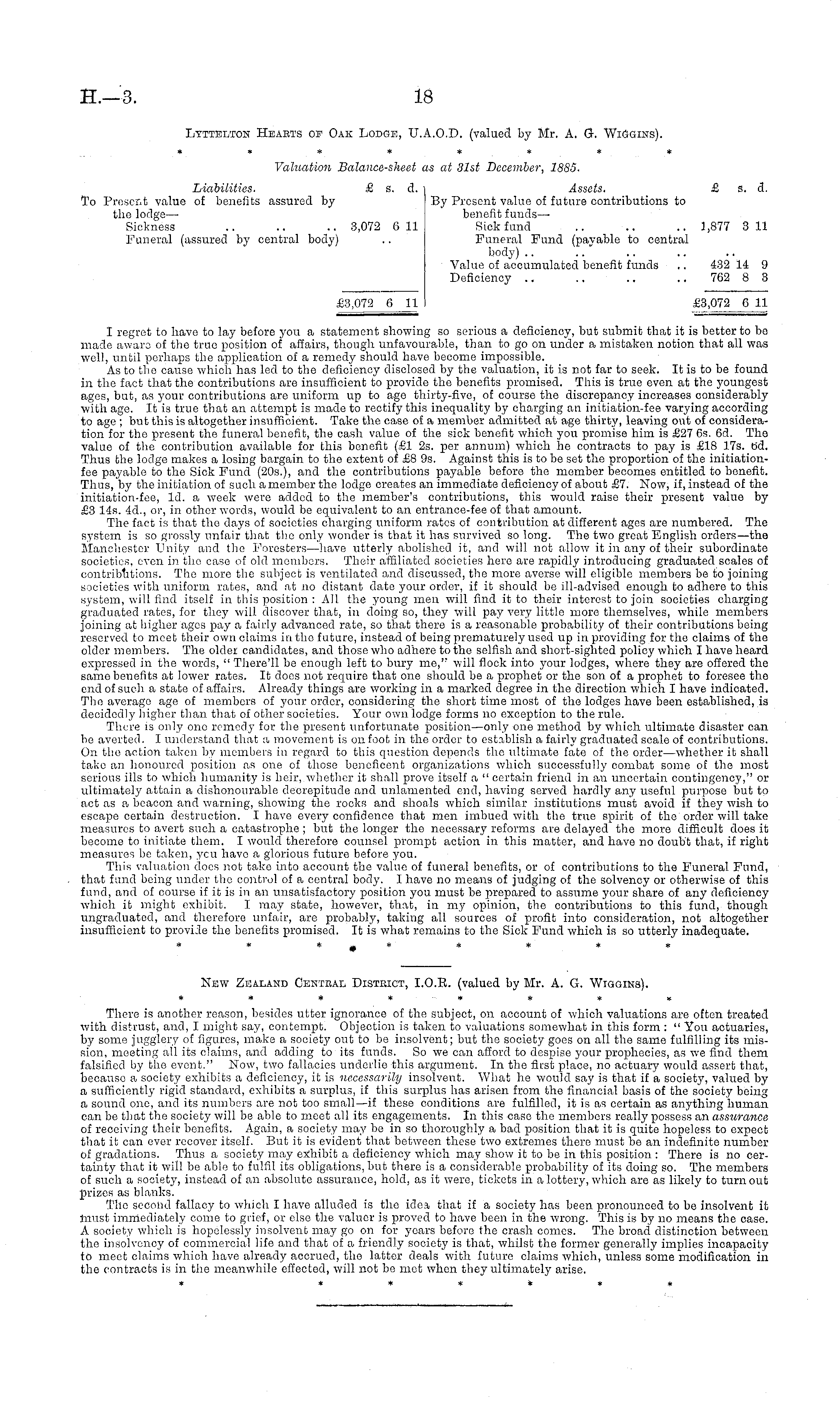 Lyttelton Heaets of Oak Lodge, TJ.A.O.D. (valued by Mr. A. G-. Wiggins). ******** Valuation Balance-sheet as at 31st December, 18S5. Liabilities. £ s. d. Assets. £ s. d. To Present value of benefits assured by By Present value of future contributions to tho lodge— benefit funds— Sickness .. .. .. 3,072 Gil Sick fund .. .. .. 1,877 311 Funeral (assured by central body) .. Funeral Fund (payable to central body) Value of accumulated benefit funds .. 432 14 9 Deficiency .. .. .. .. 762 8 3 £3,072 6 11 £3,072 6 11 I regret to have to lay before you a statement showing so serious a deficiency, but submit that it is better to be made awaro of the true position of affairs, though unfavourable, than to go on under a mistaken notion that all was well, until perhaps the application of a remedy should have become impossible. As to the cause which has led to the deficiency disclosed by the valuation, it is not far to seek. It is to be found in the fact that the contributions are insufficient to provide the benefits promised. This is true even at tho youngest ages, but, as your contributions are uniform up to age thirty-five, of course tho discrepancy increases considerably with ago. It is true that an attempt is made to rectify this inequality by charging an initiation-fee varying according to age ; but this is altogether insufficient. Take tho case of a member admitted at age thirty, leaving out of consideration for tho present the funeral benefit, the cash value of the sick benefit which you promise him is £27 6s. 6d. The value of the contribution available for this benefit (£1 2s. per annum) which he contracts to pay is £18 17s. b'd. Thus the lodge makes a losing bargain to the extent of £8 9s. Against this is to be set the proportion of tho initiationfee payable to the Sick Fund (205.), and the contributions payable before the member becomes entitled to benefit. Thus, by the initiation of such a member the lodge creates an immediate deficiency of about £7. Now, if, instead of the initiation-fee, Id. a week were added to tho member's contributions, this would raise their present value by £3 14s. 4d., or, in other words, would be equivalent to an entrance-fee of that amount. The fact is that the days of societies charging uniform rates of contribution at different ages are numbered. The system is so grossly unfair that the only wonder is that it has survived so long. The two great English orders—the Manchester Unity and the Foresters—have utterly abolished it, and will not allow it in any of their subordinate societies, even in the case of old members. Their affiliated societies hero are rapidly introducing graduated scales of contributions. The more tho subject is ventilated and discussed, the more averse will eligible members be to joining societies with uniform rates, and at no distant date your order, if it should be ill-advised enough to adhere to this system, will find itself in this position : All the young men will find it to their interest to join societies charging graduated rates, for they will discover that, in doing so, they will pay very little more themselves, while members joining at higher ages pay a fairly advanced rate, so that there is a reasonable probability of their contributions being reserved to meet their own claims in the future, instead of being prematurely used up in providing for the claims of the older members. The older candidates, and those who adhere to tho selfish and short-sighted policy which I have heard expressed in the words, " There'll be enough left to bury me," will flock into your lodges, where they are offered the same benefits at lower rates. It does not require that one should bo a prophet or tho son of a prophet to foresee the end of such a state of affairs. Already things are working in a marked degree in the direction which I have indicated. The average age of members of your order, considering the short time most of tho lodges have been established, is decidedly higher than that of other societies. Your own lodge forms no exception to the rule. There is only one remedy for the present unfortunate position—only one method by which ultimate disaster can be averted. I understand that a movement is on foot in the order to establish a fairly graduated scale of contributions. On the action taken by members in regard to this question depends the ultimate fate of the order—whether it shall take an honoured position as one of those beneficent organizations which successfully combat some of tho most serious ills to which humanity is heir, whether it shall prove itself a " certain friend in an uncertain contingency," or ultimately attain a dishonourable decrepitude and unlamented end, having served hardly any useful purpose but to act as a beacon and warning, showing the rocks and shoals which similar institutions must avoid if they wish to escape certain destruction. I have every confidence that men imbued with the true spirit of the order will take measures to avert such a catastrophe ; but the longer the necessary reforms are delayed the more difficult does it become to initiate them. I would therefore counsel prompt action in this matter, and have no doubt that, if right measures be taken, ycu have a glorious future before you. This valuation does not take into account the value of funeral benefits, or of contributions to the Funeral Fund, that fund being under the control of a central body. I have no means of judging of the solvency or otherwise of this fund, and of course if it is in an unsatisfactory position you must be prepared to assume your share of any deficiency which it might exhibit. I may state, however, that, in my opinion, the contributions to this fund, though ungraduated, and therefore unfair, are probably, taking all sources of profit into consideration, not altogether insufficient to provide the benefits promised. It is what remains to the Sick Fund which is so utterly inadequate. ********