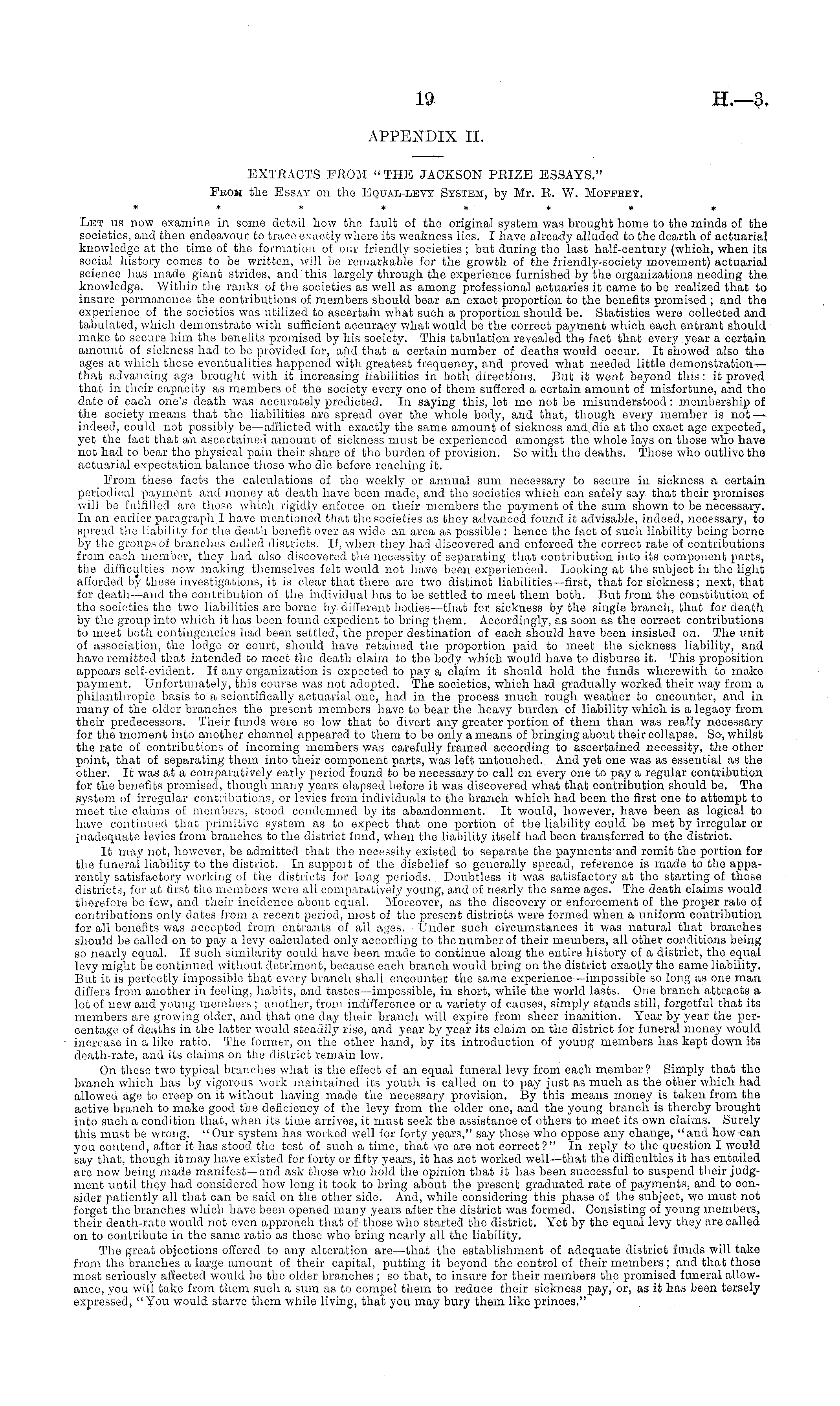 EXTRACTS PROM "THE JACKSON PRIZE ESSAYS." From the Essay on tlio Equal-levy System, by Mr. R. W. Moffbey. ******** Let us now examine in some detail bow the fault of the original system was brought home to the minds of the societies, and then endeavour to trace exactly where its weakness lies. I have already alluded to the dearth of actuarial knowledge at the time of the formation of our friendly societies; but during the last half-century (which, when its social history comes to be written, will be remarkable for the growth of the friendly-society movement) actuarial science has mado giant strides, and this largely through the experience furnished by the organizations needing the knowledge. Within the ranks of the societies as well as among professional actuaries it came to be realized that to insure permanence the contributions of members should bear an exact proportion to the benefits promised ; and the experience of the societies was utilized to ascertain what such a proportion should be. Statistics were collected and tabulated, which demonstrate with sufficient accuracy what would be the correct payment which each entrant should make to secure him the benefits promised by his society. This tabulation revealed the fact that every year a certain amount of sickness had to bo provided for, and that a certain number of deaths would occur. It showed also the ages at which those eventualities happened with greatest frequency, and proved what needed little demonstration— that advancing aga brought with it increasing liabilities in both directions. But it wont beyond tins :it proved that in their capacity as members of the society every one of them suffered a certain amount of misfortune, and the date of each one's death was accurately predicted. In saying this, let me not be misunderstood : membership of the society means that the liabilities arc spread over the whole body, and that, though every member is not—indeed, could not possibly be—afflicted with exactly the same amount of sickness and. die at the exact age expected, yet the fact that an ascertained amount of sickness must be experienced amongst the whole lays on those who have not had to bear the physical pain their share of the burden of provision. So with the deaths. Those who outlive the actuarial expectation balance those who die before reaching it. From these facts the calculations of the weekly or annual sum necessary to secure in sickness a certain periodical payment and money at death have been made, and the societies which can safely say that their promises will be fulfilled are those which rigidly enforce on their members the payment of the sum shown to be necessary. In an earlier paragraph I have mentioned that the societies as they advanced found it advisable, indeed, necessary, to spread the liability for the death benefit over as wide an area as possible : hence the fact of such liability being borne by the groups of branches called districts. If, when they had discovered and enforced the correct rate of contributions from each member, they had also discovered the necessity of separating that contribution into its component parts, the difficulties now making themselves felt would not have been experienced. Looking at the subject in the light afforded by these investigations, it is clear that there are two distinct liabilities—first, that for sickness; next, that for death —and the contribution of the individual has to be settled to meet them both. But from the constitution of the societies the two liabilities are borne by different bodies—that for sickness by the single branch, that for death by the group into which it has been found expedient to bring them. Accordingly, as soon as the correct contributions to meet both contingencies had been settled, the proper destination of each should have been insisted on. The unit of association, the lodge or court, should have retained tho proportion paid to meet the sickness liability, and have remitted that intended to meet the death claim to the body which would have to disburse it. This proposition appears self-evident. If any organization is expected to pay a claim it should hold the funds wherewith to make payment. Unfortunately, this course was not adopted. The societies, which had gradually worked their way from a philanthropic basis to a scientifically actuarial one, had in the process much rough weather to encounter, and in many of the older branches the present members have to bear the heavy burden of liability which is a legacy from their predecessors. Their funds were so low that to divert any greater portion of them than was really necessary for the moment into another channel appeared to them to be only a means of bringing about their collapse. So, whilst the rate of contributions of incoming members was carefully framed according to ascertained necessity, the other point, that of separating them into their component parts, was left untouched. And yet one was as essential as the other. It was at a comparatively early period found to be necessary to call on every one to pay a regular contribution for the benefits promised, though many years elapsed before it was discovered what that contribution should be. The system of irregular contributions, or levies from individuals to the branch which had been the first one to attempt to meet the claims of members, stood condemned by its abandonment. It would, however, have been as logical to have continued that primitive system as to expect that one portion of the liability could be met by irregular or inadequate levies from branches to the district fund, when the liability itself had been transferred to the district. It may not, however, bo admitted that the necessity existed to separate tho payments and remit the portion for the funeral liability to the district. In support of the disbelief so generally spread, reference is mado to the apparently satisfactory working of the districts for long periods. Doubtles