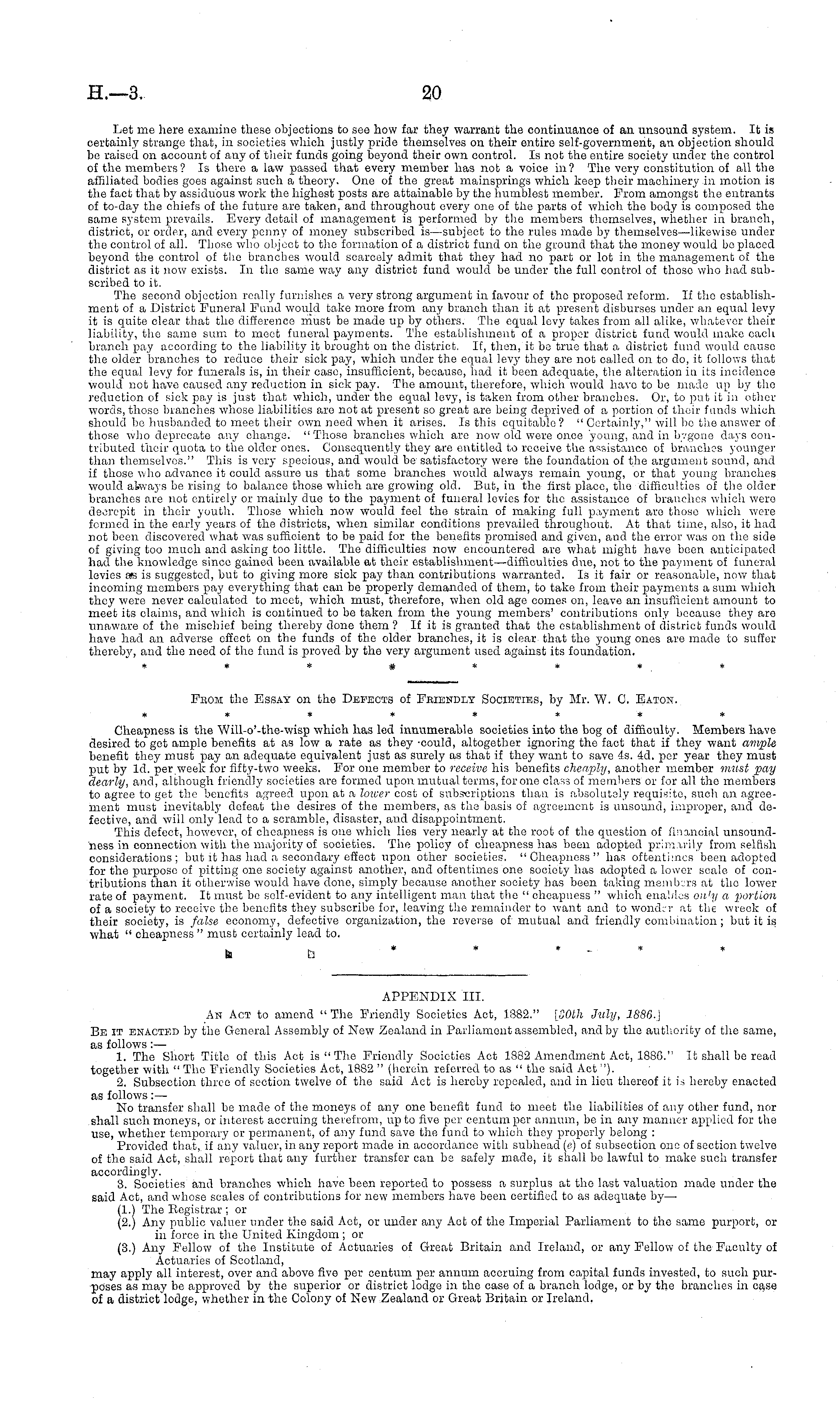 APPENDIX 111. An Act to amend "The Friendly Societies Act, 1882." [30th July, 188$.] Be it enacted by the General Assembly of New Zealand in Parliament assembled, and by the authority of the same, as follows: — 1. The Short Title of this Act is " The Friendly Societies Act 1882 Amendment Act, 1886." It shall be read together with " The Friendly Societies Act, 1882 " (herein referred to as " the said Act "). 2. Subsection three of section twelve or the said Act is hereby repealed, and in lieu thereof ii is hereby enacted as follows: — No transfer shall bo made of the moneys of any one benefit fund to meet the liabilities of any other fund, nor shall such moneys, or interest accruing therefrom, up to five per centum per annum, be in any manner applied for the use, whether temporary or permanent, of any fund save the fund to which they properly belong : Provided that, if any valuer, in any report made in accordance witli subhead (c) of subsection one of section twelve of the said Act, shall report that any further transfer can be safely made, it shall bo lawful to make such transfer accordingly. 3. Societies and branches which have been reported to possess a surplus at the last valuation made under the said Act, and whose scales of contributions for new members have been certified to as adequate by— (1.) The Registrar ; or (2.) Any public valuer under the said Act, or under any Act of the Imperial Parliament to the same purport, or in force in the United Kingdom ; or (3.) Any Fellow of the Institute of Actuaries of Great Britain and Ireland, or any Fellow of the Faculty o£ Actuaries of Scotland, may apply all interest, over and above five per centum per annum accruing from capital funds invested, to such purposes as may be approved by the superior or district lodge in the case of a branch lodge, or by the branches in case of a district lodge, whether in the Colony of New Zealand or Great Britain or Ireland.