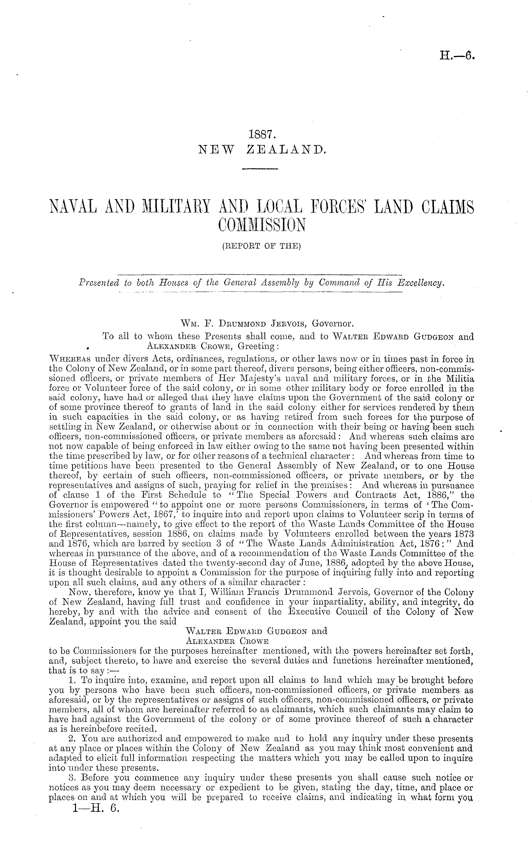 Wm. F. Dbummond Jebvois, Governor. To all to whom these Presents shall come, and to Waltee Edwaed Gudgeon and , Alexandee Cbowe, Greeting: Whereas under divers Acts, ordinances, regulations, or other laws now or in times past in force in the Colony of New Zealand, or in some part thereof, divers persons, being either officers, non-commis-sioned officers, or private members of Her Majesty's naval and military forces, or in the Militia force or Volunteer force of the said colony, or in some other military body or force enrolled in the said colony, have had or alleged that they have claims upon the Government of the said colony or of some province thereof to grants of land in the said colony either for services rendered by them in such capacities in the said colony, or as having retired from such forces for the purpose of settling in New Zealand, or otherwise about or in connection with their being or having been such officers, non-commissioned officers, or private members as aforesaid : And whereas such claims are not now capable of being enforced in law either owing to the same not having been presented within the time prescribed by law, or for other reasons of a technical character : And whereas from time to time petitions have been presented to the General Assembly of New Zealand, or to one House thereof, by certain of such officers, non-commissioned officers, or private members, or by the representatives and assigns of such, praying for relief in the premises : And whereas in pursuance of clause 1 of the First Schedule to "The Special Powers and Contracts Act, 1886," the Governor is empowered "to appoint one or more persons Commissioners, in terms of ' The Commissioners' Powers Act, 1867,' to inquire into and report upon claims to Volunteer scrip in terms of the first column—namely, to give effect to the report of the Waste Lands Committee of the House of Eepresentatives, session 1886, on claims made by A^olunteers enrolled between the years 1873 and 1876, which are barred by section 3 of " The Waste Lands Administration Act, 1876: " And whereas in pursuance of the above, and of a recommendation of the Waste Lands Committee of the House of Eepresentatives dated the twenty-second day of June, 1886 ; adopted by the above House, it is thought desirable to appoint a Commission for the purpose of inquiring fully into and reporting upon all such claims, and any others of a similar character : Now, therefore, know ye that I, William Francis Drummond Jervois, Governor of the Colony of New Zealand, having full trust and confidence in your impartiality, ability, and integrity, do hereby, by and with the advice and consent of the Executive Council of the Colony of New Zealand, appoint you the said Waltee Edwabd Gudgeon and Alexandeb Ceowe to be Commissioners for the purposes hereinafter mentioned, with the powers hereinafter set forth, and, subject thereto, to have and exercise the several duties and functions hereinafter mentioned, that is to say :—■ 1. To inquire into, examine, and report upon all claims to land which may be brought before you by persons who have been such officers, non-commissioned officers, or private members as aforesaid, or by the representatives or assigns of such officers, non-commissioned officers, or private members, all of whom are hereinafter referred to as claimants, which such claimants may claim to have had against the Government of the colony or of some province thereof of such a character as is hereinbefore recited. 2. You are authorized and empowered to make and to hold any inquiry under these presents at any place or places within the Colony of New Zealand as you may think most convenient and adapted to elicit full information respecting the matters which you may be called upon to inquire into under these presents. 3. Before you commence any inquiry under these presents you shall cause such notice or notices as you may deem necessary or expedient to be given, stating the day, time, and place or places on and at which you will be prepared to receive claims, and indicating in what form you