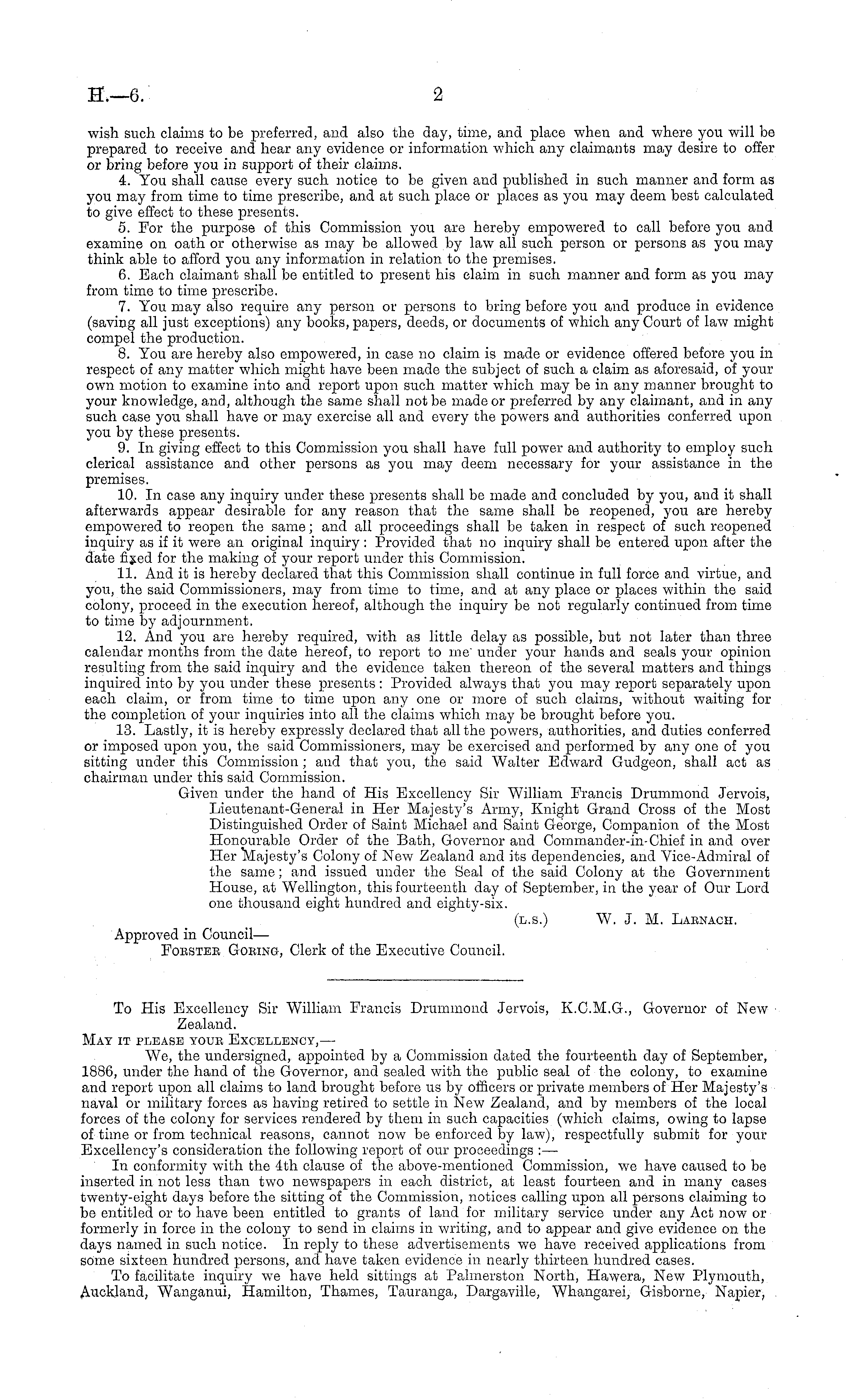 wish such claims to be preferred, and also the day, time, and place when and where you will be prepared to receive and hear any evidence or information which any claimants may desire to offer or bring before you in support of their claims. 4. You shall cause every such notice to be given and published in such manner and form as you may from time to time prescribe, and at such place or places as you may deem best calculated to give effect to these presents. 5. For the purpose of this Commission you are hereby empowered to call before you and examine on oath or otherwise as may be allowed by law all such person or persons as you may think able to afford you any information in relation to the premises. 6. Each claimant shall be entitled to present his claim in such manner and form as you may from time to time prescribe. 7. You may also require any person or persons to bring before you and produce in evidence (saving all just exceptions) any books, papers, deeds, or documents of which any Court of law might compel the production. 8. You are hereby also empowered, in case no claim is made or evidence offered before you in respect of any matter which might have been made the subject of such a claim as aforesaid, of your own motion to examine into and report upon such matter which may be in any manner brought to your knowledge, and, although the same shall not be made or preferred by any claimant, and in any such case you shall have or may exercise all and every the powers and authorities conferred upon you by these presents. 9. In giving effect to this Commission you shall have full power and authority to employ such clerical assistance and other persons as you may deem necessary for your assistance in the premises. 10. In case any inquiry under these presents shall be made and concluded by you, and it shall afterwards appear desirable for any reason that the same shall be reopened, you are hereby empowered to reopen the same; and all proceedings shall be taken in respect of such reopened inquiry as if it were an original inquiry : Provided that no inquiry shall be entered upon after the date fixed for the making of your report under this Commission. 11. And it is hereby declared that this Commission shall continue in full force and virtue, and you, the said Commissioners, may from time to time, and at any place or places within the said colony, proceed in the execution hereof, although the inquiry be not regularly continued from time to time by adjournment. 12. And you are hereby required, with as little delay as possible, but not later than three calendar months from the date hereof, to report to me' under your hands and seals your opinion resulting from the said inquiry and the evidence taken thereon of the several matters and things inquired into by you under these presents : Provided always that you may report separately upon each claim, or from time to time upon any one or more of such claims, without waiting for the completion of your inquiries into all the claims which may be brought before you. 13. Lastly, it is hereby expressly declared that all the powers, authorities, and duties conferred or imposed upon you, the said Commissioners, may be exercised and performed by any one of you sitting under this Commission ; and that you, the said Walter Edward Gudgeon, shall act as chairman under this said Commission. Given under the hand of His Excellency Sir William Francis Drummond Jervois, Lieutenant-General in Her Majesty's Army, Knight Grand Cross of the Most Distinguished Order of Saint Michael and Saint George, Companion of the Most Honourable Order of the Bath, Governor and Commander-in-Chief in and over Her Majesty's Colony of New Zealand and its dependencies, and Vice-Admiral of the same; and issued under the Seal of the said Colony at the Government House, at Wellington, this fourteenth day of September, in the year of Our Lord one thousand eight hundred and eighty-six. (1.5.) W. J. M. Laenach. Approved in Council—Foestek Gobing, Clerk of the Executive Council.