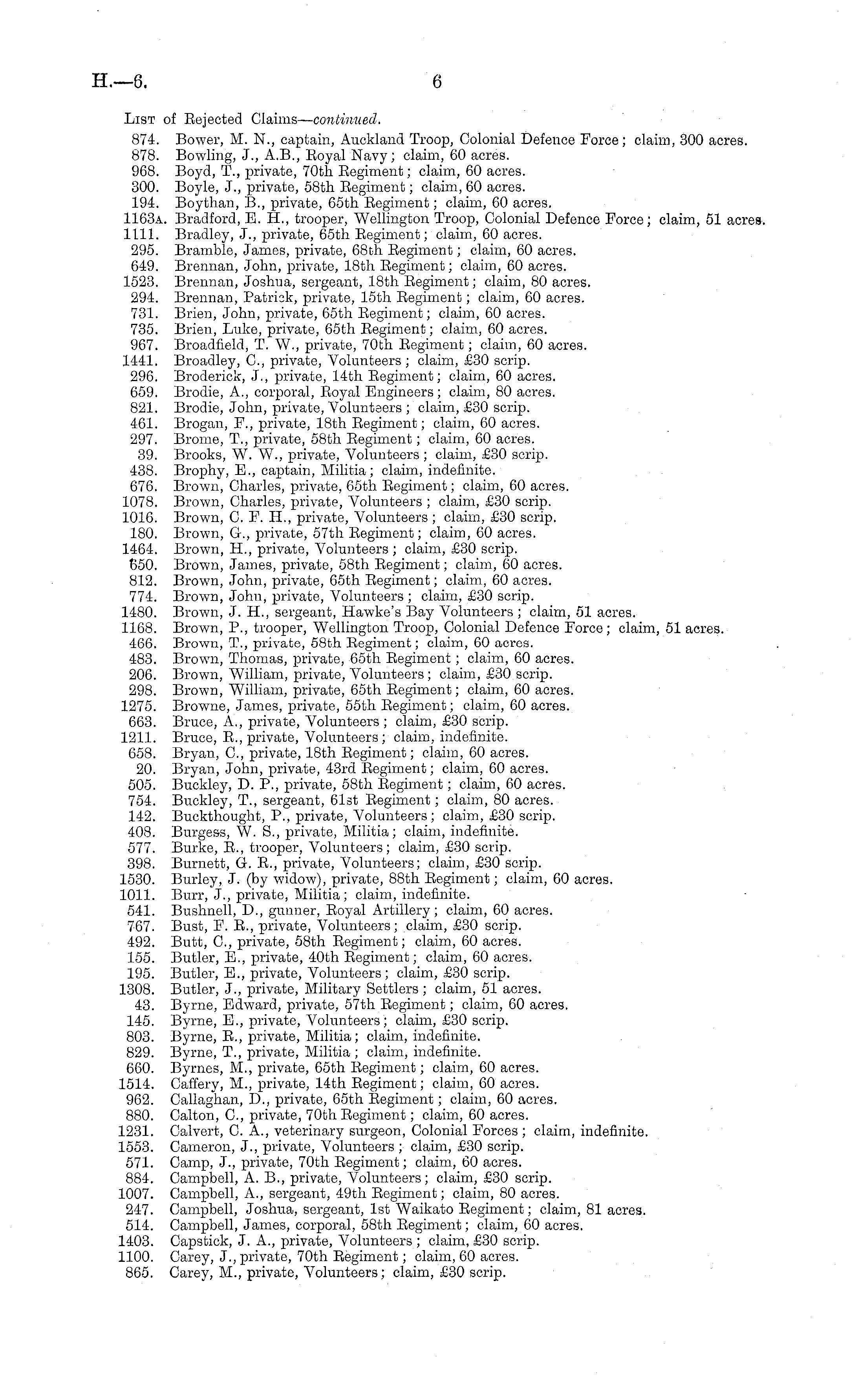 List of Bejected Claims— continued. 874. Bower, M. N., captain, Auckland Troop, Colonial Defence Force; claim, 300 acres. 878. Bowling, J., A.8., Eoyal Navy; claim, 60 acres. 968. Boyd, T., private, 70th Regiment; claim, 60 acres. 300. Boyle, J., private, 58th Regiment; claim, 60 acres. 194. Boythan, 8., private, 65th Regiment; claim, 60 acres. 1163 a. Bradford, E. H., trooper, Wellington Troop, Colonial Defence Force; claim, 51 acres. 1111. Bradley, J., private, 65th Regiment; claim, 60 acres. 295. Bramble, James, private, 68th Regiment; claim, 60 acres. 649. Brennan, John, private, 18th Regiment; claim, 60 acres. 1523. Brennan, Joshua, sergeant, 18th Regiment; claim, 80 acres. 294. Brennan, Patrick, private, 15th Regiment; claim, 60 acres. 731. Brien, John, private, 65th Regiment; claim, 60 acres. 735. Brien, Luke, private, 65th Regiment; claim, 60 acres. 967. Broadfield, T. W., private, 70th Regiment; claim, 60 acres. 1441. Broadley, C, private, Volunteers ; claim, £30 scrip. 296. Broderick, J., private, 14th Regiment; claim, 60 acres. 659. Brodie, A., corporal, Royal Engineers ; claim, 80 acres. 821. Brodie, John, private, Volunteers ; claim, £30 scrip. 461. Brogan, F., private, 18th Regiment; claim, 60 acres. 297. Brome, T., private, 58th Regiment; claim, 60 acres. 39. Brooks, W. W., private, Volunteers ; claim, £30 scrip. 438. Brophy, E., captain, Militia; claim, indefinite. 676. Brown, Charles, private, 65th Regiment; claim, 60 acres. 1078. Brown, Charles, private, Volunteers ; claim, £30 scrip. 1016. Brown, 0. F. H., private, Volunteers ; claim, £30 scrip. 180. Brown, G., private, 57th Regiment; claim, 60 acres. 1464. Brown, H., private, Volunteers ; claim, £30 scrip. (350. Brown, James, private, 58th Regiment; claim, 60 acres. 812. Brown, John, private, 65th Regiment; claim, 60 acres. 774. Brown, John, private, Volunteers ; claim, £30 scrip. 1480. Brown, J. H., sergeant, Hawke's Bay Volunteers ; claim, 51 acres. 1168. Brown, P., trooper, Wellington Troop, Colonial Defence Force; claim, 51 acres. 466. Brown, T., private, 58th Regiment; claim, 60 acres. 483. Brown, Thomas, private, 65th Regiment ; claim, 60 acres. 206. Brown, William, private, Volunteers ; claim, £30 scrip. 298. Brown, William, private, 65th Regiment; claim, 60 acres. 1275. Browne, James, private, 55th Regiment; claim, 60 acres. 663. Bruce, A., private, Volunteers ; claim, £30 scrip. 1211. Bruce, R., private, Volunteers ; claim, indefinite. 658. Bryan, C, private, 18th Regiment; claim, 60 acres. 20. Bryan, John, private, 43rd Regiment; claim, 60 acres. 505. Buckley, D. P., private, 58th Regiment; claim, 60 acres. 754. Buckley, T., sergeant, 61st Regiment; claim, 80 acres. 142. Buckthought, P., private, Volunteers; claim, £30 scrip. 408. Burgess, W. S., private, Militia; claim, indefinite. 577. Burke, R., trooper, Volunteers; claim, £30 scrip. 398. Burnett, G. R., private, Volunteers; claim, £30 scrip. 1530. Burley, J. (by widow), private, 88th Regiment; claim, 60 acres. 1011. Burr, J., private, Militia; claim, indefinite. 541. Bushnell, D., gunner, Royal Artillery; claim, 60 acres. 767. Bust, F. R., private, Volunteers; claim, £30 scrip. 492. Butt, C, private, 58th Regiment; claim, 60 acres. 155. Butler, E., private, 40th Regiment; claim, 60 acres. 195. Butler, E., private, Volunteers ; claim, £30 scrip. 1308. Butler, J., private, Military Settlers ; claim, 51 acres. 43. Byrne, Edward, private, 57th Regiment; claim, 60 acres. 145. Byrne, E., private, Volunteers; claim, £30 scrip. 803. Byrne, R., private, Militia; claim, indefinite. 829. Byrne, T., private, Militia ; claim, indefinite. 660. Byrnes, M., private, 65th Regiment; claim, 60 acres. 1514. Caffery, M., private, 14th Regiment; claim, 60 acres. 962. Callaghan, D., private, 65th Regiment; claim, 60 acres. 880. Calton, C, private, 70th Regiment; claim, 60 acres. 1231. Calvert, C. A., veterinary surgeon, Colonial Forces ; claim, indefinite. 1553. Cameron, J., private, Volunteers ; claim, £30 scrip. 571. Camp, J., private, 70th Regiment; claim, 60 acres. 884. Campbell, A. 8., private, Volunteers; claim, £30 scrip. 1007. Campbell, A., sergeant, 49th Regiment; claim, 80 acres. 247. Campbell, Joshua, sergeant, Ist Waikato Regiment; claim, 81 acres. 514. Campbell, James, corporal, 58th Regiment; claim, 60 acres. 1403. Capstick, J. A., private, Volunteers ; claim, £30 scrip. 1100. Carey, J., private, 70th Regiment; claim, 60 acres. 865. Carey, M., private, Volunteers; claim, £30 scrip.
