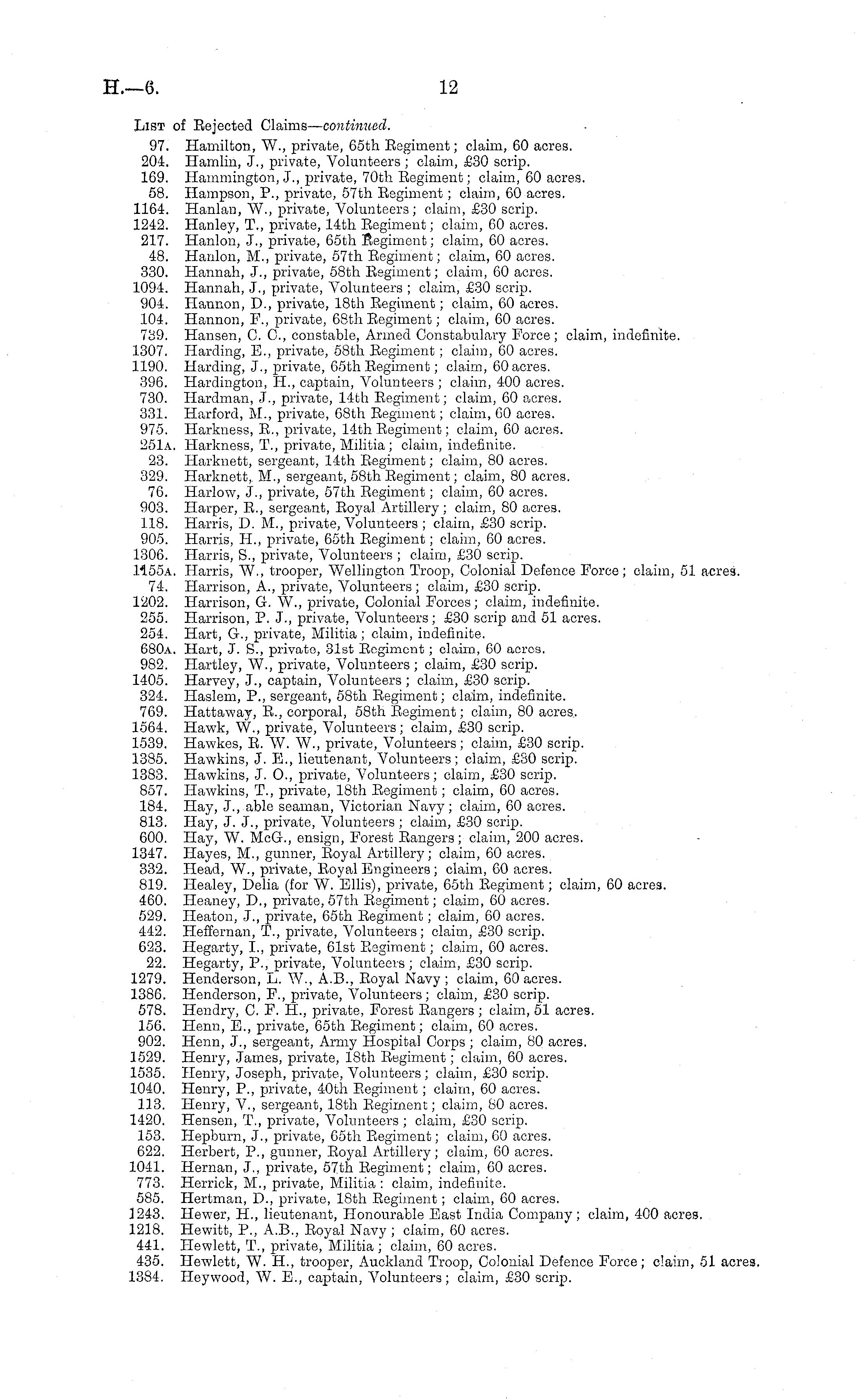 List of Eejected Claims — continued. 97. Hamilton, W., private, 65th Regiment ; claim, 60 acres. 204. Hamlin, J., private, Volunteers ; claim, £30 scrip. 169. Hammington, J., private, 70th Begiment; claim, 60 acres. 58. Hampson, P., private, 57th Eegiment; claim, 60 acres. 1164. Hanlan, W., private, Volunteers; claim, £30 scrip. 1242. Hanley, T., private, 14th Eegiment; claim, 60 acres. 217. Hanlon, J., private, 65th Eegimont; claim, 60 acres. 48. Hanlon, M., private, 57th Eegiment; claim, 60 acres. 330. Hannah, J., private, 58th Eegiment; claim, 60 acres. 1094. Hannah, J., private, Volunteers ; claim, £30 scrip. 904. Hannon, D., private, 18th Eegiment; claim, 60 acres. 104. Hannon, F., private, 68th Eegiment; claim, 60 acres. 739. Hansen, 0. C, constable, Armed Constabulary Force; claim, indefinite. 1307. Harding, E., private, 58th Eegiment ; claim, 60 acres. 1190. Harding, J., private, 65th Eegiment; cla.im, 60 acres. 396. Hardington, H., captain, Volunteers ; claim, 400 acres. 730. Hardman, J., private, 14th Eegiment; claim, 60 acres. 331. Harford, M., private, 68th Eegiment; claim, GO acres. 975. Harkness, E., private, 14th Eegiment; claim, 60 acres. 251 a. Harkness, T., private, Militia ; claim, indefinite. 23. Harknett, sergeant, 14th Eegiment; claim, 80 acres. 329. Harknett, M., sergeant, 58th Eegiment; claim, 80 acres. 76. Haiiow, J., private, 57th Eegiment; claim, 60 acres. 903. Harper, E., sergeant, Eoyal Artillery; claim, 80 acres. 118. Harris, D. M., private, Volunteers ; claim, £30 scrip. 905. Harris, H., private, 65th Eegiment; claim, 60 acres. 1306. Harris, S., private, Volunteers ; claim, £30 scrip. 1455 a. Harris, W., trooper, Wellington Troop, Colonial Defence Force; claim, 51 acres. 74. Harrison, A., private, Volunteers; claim, £30 scrip. 1202. Harrison, G. W., private, Colonial Forces; claim, indefinite. 255. Harrison, P. J., private, Volunteers; £30 scrip and 51 acres. 254. Hart, G., private, Militia ; claim, indefinite. 680 a. Hart, J. S., private, 31st Regiment ; claim, 60 acres. 982. Hartley, W., private, Volunteers ; claim, £30 scrip. 1405. Harvey, J., captain, Volunteers ; claim, £30 scrip. 324. Haslem, P., sergeant, 58th Eegiment; claim, indefinite. 769. Hattaway, E., corporal, 58th Eegiment; claim, 80 acres. 1564. Hawk, W., private, Volunteers; claim, £30 scrip. 1539. Hawkes, E. W. W., private, Volunteers; claim, £30 scrip. 1385. Hawkins, J. E., lieutenant, Volunteers; claim, £30 scrip. 1383. Hawkins, J. 0., private, Volunteers; claim, £30 scrip. 857. Hawkins, T., private, 18th Eegiment; claim, 60 acres. 184. Hay, J., able seaman, Victorian Navy; claim, 60 acres. 813. Hay, J. J., private, Volunteers ; claim, £30 scrip. 600. Hay, W. McG., ensign, Forest Eangers; claim, 200 acres. 1347. Hayes, M., gunner, Eoyal Artillery; claim, 60 acres. 332. Head, W., private, Eoyal Engineers; claim, 60 acres. 819. Healey, Delia (for W. Ellis), private, 65th Eegiment; claim, 60 acres. 460. Heaney, D., private, 57th Eegiment; claim, 60 acres. 529. Heatou, J., private, 65th Eegiment; claim, 60 acres. 442. Heffernan, T., private, Volunteers; claim, £30 scrip. 623. Hegarty, 1., private, 61st Eegiment; claim, 60 acres. 22. Hegarty, P., private, Volunteers ; claim, £30 scrip. 1279. Henderson, L. W., A.8., Eoyal Navy; claim, 60 acres. 1386. Henderson, F., private, Volunteers; claim, £30 scrip. 578. Hendry, C. F. H., private, Forest Eangers ; claim, 51 acres. 156. Henn, E., private, 65th Eegiment; claim, 60 acres. 902. Henn, J., sergeant, Army Hospital Corps ; claim, 80 acres. 1529. Henry, James, private, 18th Eegiment; claim, 60 acres. 1535. Henry, Joseph, private, Volunteers; claim, £30 scrip. 1040. Henry, P., private, 40th Eegiment; claim, 60 acres. 113. Henry, V., sergeant, 18th Eegiment; claim, 80 acres. 1420. Hensen, T., private, Volunteers ; claim, £30 scrip. 153. Hepburn, J., private, 65th Eegiment; claim, 60 acres. 622. Herbert, P., gunner, Eoyal Artillery; claim, 60 acres. 1041. Hernan, J., private, 57th Eegiment; claim, 60 acres. 773. Herrick, M., private, Militia : claim, indefinite. 585. Hertman, D., private, 18th Eegiment; claim, 60 acres. 1243. Hewer, H., lieutenant, Honourable East India Company ; claim, 400 acres. 1218. Hewitt, P., A.8., Eoyal Navy ; claim, 60 acres. 441. Hewlett, T., private, Militia; claim, 60 acres. 435. Hewlett, W. H., trooper, Auckland Troop, Colonial Defence Force; claim, 51 acres. 1384. Heywood, W. E., captain, Volunteers; claim, £30 scrip.