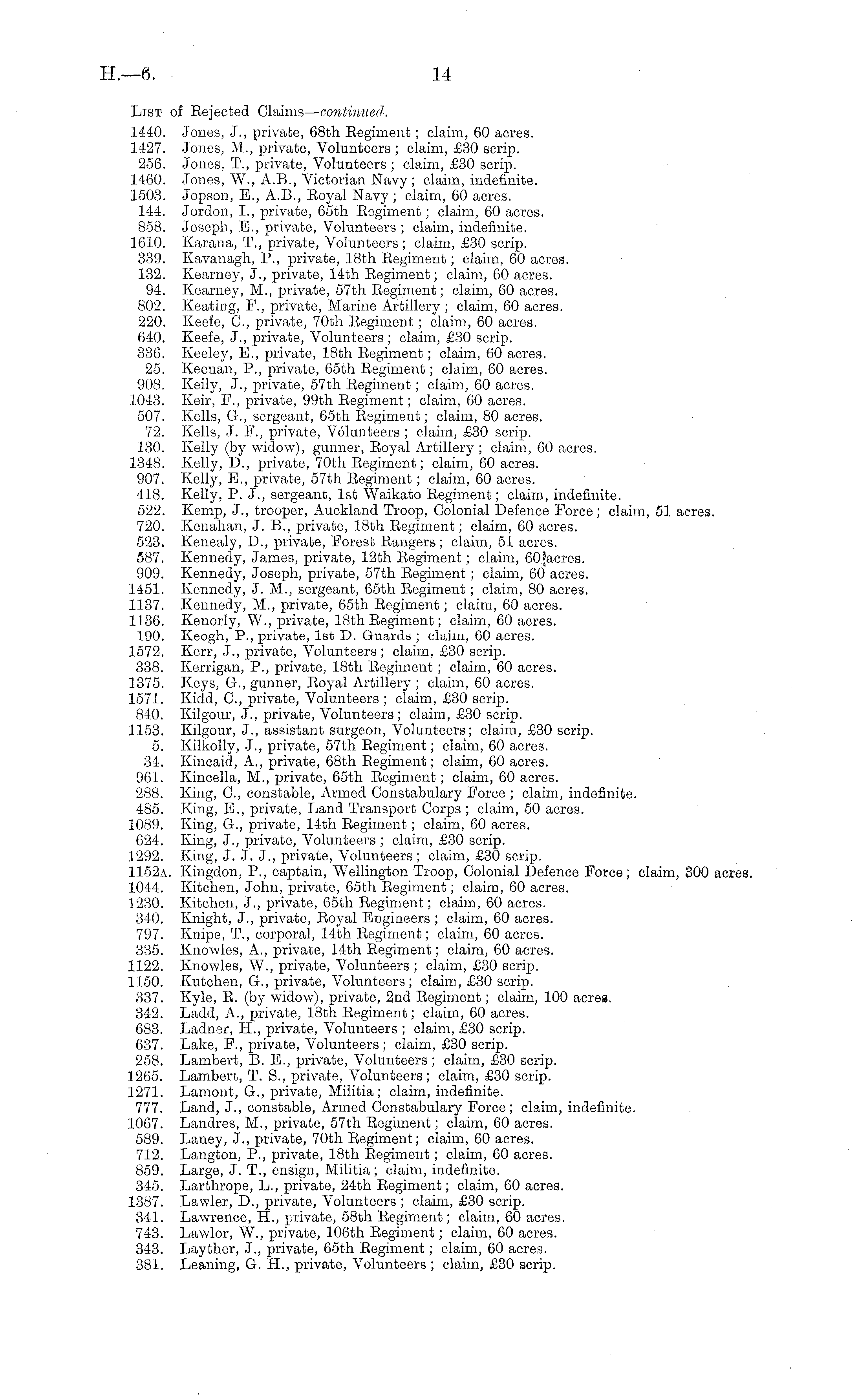 List of Eejeeted Claims— continued. 1440. Jones, J., private, 68th Regiment; claim, 60 acres. 1427. Jones, M., private, Volunteers ; claim, £30 scrip. 256. Jones. T., private, Volunteers ; claim, £30 scrip. 1460. Jones, W., A.8., Victorian Navy; claim, indefinite. 1503. Jopson, E., A.8., Eoyal Navy; claim, 60 acres. 144. Jordon, 1., private, 65th Eegiment; claim, 60 acres. 858. Joseph, E., private, Volunteers ; claim, indefinite. 1610. Karana, T., private, Volunteers ; claim, £30 scrip. 339. Kavanagh, P., private, 18th Regiment; claim, 60 acres. 132. Kearney, J., private, 14th Regiment; claim, 60 acres. 94. Kearney, M., private, 57th Regiment; claim, 60 acres. 802. Keating, F., private, Marine Artillery ; claim, 60 acres. 220. Keefe, C, private, 70th Regiment; claim, 60 acres. 640. Keefe, J., private, Volunteers ; claim., £30 scrip. 336. Keeley, E., private, 18th Regiment; claim, 60 acres. 25. Keenan, P., private, 65th Regiment; claim, 60 acres. 908. Keily, J., private, 57th Regiment; claim, 60 acres. 1043. Keir, F., private, 99th Regiment; claim, 60 acres. 507. Kells, G., sergeant, 65th Regiment; claim, 80 acres. 72. Kells, J. F., private, Volunteers ; claim, £30 scrip. 130. Kelly (by widow), gunner, Royal Artillery; claim, 60 acres. 1348. Kelly, D., private, 70th Regiment; claim, 60 acres. 907. Kelly, E., private, 57th Regiment; claim, 60 acres. 418. Kelly, P. J., sergeant, Ist Waikato Regiment; claim, indefinite. 522. Kemp, J., trooper, Auckland Troop, Colonial Defence Force; claim, 51 acres. 720. Kenahan, J. 8., private, 18th Regiment; claim, 60 acres. 523. Kenealy, D., private, Forest Rangers ; claim, 51 acres. 587. Kennedy, James, private, 12th Eegiment; claim, 60facres. 909. Kennedy, Joseph, private, 57th Regiment; claim, 60 acres. 1451. Kennedy, J. M., sergeant, 65th Regiment; claim, 80 acres. 1137. Kennedy, M., private, 65th Regiment; claim, 60 acres. 1136. Kenorly, W., private, 18th Regiment; claim, 60 acres. 190. Kcogh, P., private, Ist D. Guards ; claim, 60 acres. 1572. Kerr, J., private, Volunteers ; claim, £30 scrip. 338. Kerrigan, P., private, 18th Regiment; claim, 60 acres. 1375. Keys, G., gunner, Royal Artillery ; claim, 60 acres. 1571. Kidd, C., private, Volunteers ; claim, £30 scrip. 840. Kilgour, J., private, Volunteers; claim, £30 scrip. 1153. Kilgour, J., assistant surgeon, Volunteers; claim, £30 scrip. 5. Kilkolly, J., private, 57th Regiment; claim, 60 acres. 34. Kincaid, A., private, 68th Regiment; claim, 60 acres. 961. Kincella, M., private, 65th Regiment; claim, 60 acres. 288. King, C, constable, Armed Constabulary Force ; claim, indefinite. 485. King, E., private, Land Transport Corps ; claim, 50 acres. 1089. King, G., private, 14th Regiment ; claim, 60 acres. 624. King, J., private, Volunteers ; claim, £30 scrip. 1292. King, J. J. J., private, Volunteers; claim, £30 scrip. 1152 a. Kingdon, P., captain, Wellington Troop, Colonial Defence Force; claim, 300 acres. 1044. Kitchen, John, private, 65th Regiment; claim, 60 acres. 1230. Kitchen, J., private, 65th Regiment; claim, 60 acres. 340. Knight, J., private, Royal Engineers ; claim, 60 acres. 797. Knipe, T., corporal, 14th Regiment; claim, 60 acres. 335. Knowles, A., private, 14th Regiment; claim, 60 acres. 1122. Knowles, W., private, Volunteers ; claim, £30 scrip. 1150. Kutchen, G., private, Volunteers; claim, £30 scrip. 337. Kyle, R. (by widow), private, 2nd Regiment; claim, 100 acres. 342. Ladd, A., private, 18th Regiment; claim, 60 acres. 683. Ladnsr, H., private, Volunteers ; claim, £30 scrip. 637. Lake, F., private, Volunteers; claim, £30 scrip. 258. Lambert, B. E., private, Volunteers ; claim, £30 scrip. 1265. Lambert, T. S., private, Volunteers; claim, £30 scrip. 1271. Lamont, G., private, Militia; claim, indefinite. 777. Land, J., constable, Armed Constabulary Force; claim, indefinite. 1067. Landres, M., private, 57th Regiment; claim, 60 acres. 589. Laney, J., private, 70th Regiment; claim, 60 acres. 712. Langton, P., private, 18th Regiment; claim, 60 acres. 859. Large, J. T., ensign, Militia; claim, indefinite. 345. Larthrope, L., private, 24th Regiment; claim, 60 acres. 1387. Lawler, D., private, Volunteers ; claim, £30 scrip. 341. Lawrence, H., private, 58th Regiment; claim, 60 acres. 743. Lawlor, W., private, 106 th Regiment; claim, 60 acres. 343. Layther, J., private, 65th Eegiment; claim, 60 acres. 381. Leaning, G. H.., private, Volunteers ; claim, £30 scrip.
