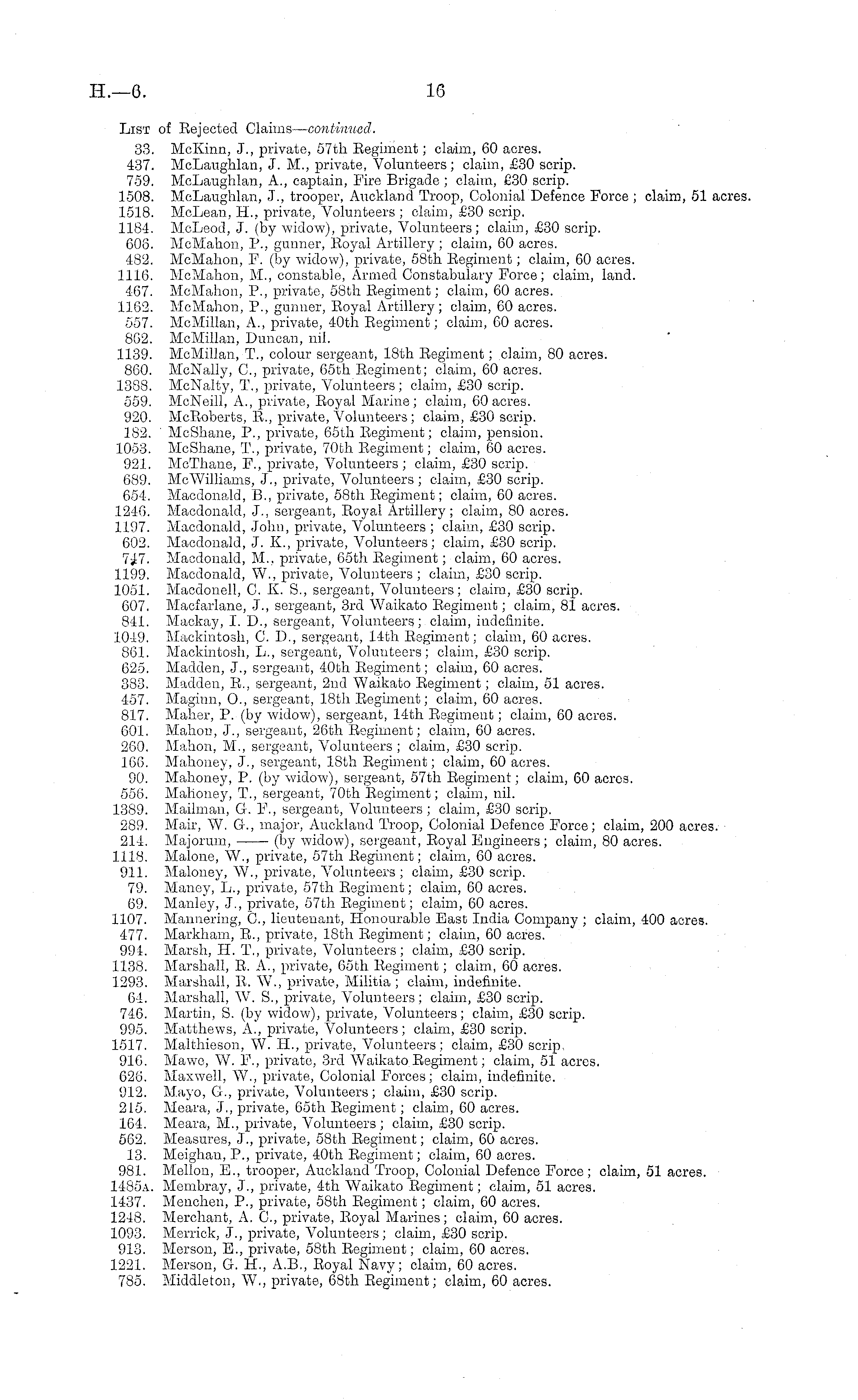 List of Eejected Claims— continued, 33. McKinn, J., private, 57th Begiment; claim, 60 acres. 437. McLaughlan, J. M., private, Volunteers; claim, £30 scrip. 759. McLaughlan, A., captain, Fire Brigade ; claim, £30 scrip. 1508. McLaughlan, J., trooper, Auckland Troop, Colonial Defence Force ; claim, 51 acres. 1518. McLean, H., private, Volunteers ; claim, £30 scrip. 1184. McLeod, J. (by widow), private, Volunteers; claim, £30 scrip. 606. McMahon, P., gunner, Eoyal Artillery ; claim, 60 acres. 482. McMahon, F. (by widow), private, 58th Begiment; claim, 60 acres. 1116. McMahon, M., constable, Armed Constabulary Force; claim, land. 467. McMahon, P., private, 58th Eegiment; claim, 60 acres. 1162. McMahon, P., gunner, Eoyal Artillery; claim, 60 acres. 557. McMillan, A., private, 40th Eegiment; claim, 60 acres. 862. McMillan, Duncan, nil. 1139. McMillan, T., colour sergeant, 18th Eegiment; claim, 80 acres. 860. McNally, C, private, 65th Eegiment; claim, 60 acres. 1388. McNalty, T., private, Volunteers ; claim, £30 scrip. 559. McNeill, A., private, Eoyal Marino; claim, 60 acres. 920. McEoberts, E., private, Volunteers; claim, £30 scrip. 182. McShane, P., private, 65th Eegiment; claim, pension. 1053. McShane, T., private, 70th Eegiment; claim, 60 acres. 921. MeThane, F., private, Volunteers ; claim, £30 scrip. 689. Me Williams, J., private, Volunteers; claim, £30 scrip. 654. Macdonald, 8., private, 58th Eegiment; claim, 60 acres. 1246. Macdonald, J., sergeant, Eoyal Artillery; claim, 80 acres. 1197. Macdonald, John, private, Volunteers ; claim, £30 scrip. 602. Macdonald, J. X., private, Volunteers; claim, £30 scrip. 747. Macdonald, M., private, 65th Eegiment; claim, 60 acres. 1199. Macdonald, W., private, Volunteers ; claim, £30 scrip. 1051. Macdonell, C. K. S., sergeant, Volunteers; claim, £30 scrip. 607. Macfarlane, J., sergeant, 3rd Waikato Begiment; claim, 81 acres. 841. Mackay, I. D., sergeant, Volunteers; claim, indefinite. 1049. Mackintosh, C. D., sergeant, 14th Eegiment; claim, 60 acres. 861. Mackintosh, L., sergeant, Volunteers; claim, £30 scrip. 625. Madden, J., sergeant, 40th Eegiment; claim, 60 acres. 383. Madden, E., sergeant, 2nd Waikato Eegiment; claim, 51 acres. 457. Maginn, 0., sergeant, 18th Eegiment; claim, 60 acres. 817. Maher, P. (by widow), sergeant, 14th Eegiment; claim, 60 acres. 601. Mahon, J., sergeant, 26th Eegiment; claim, 60 acres. 260. Mahon, M., sergeant, Volunteers ; claim, £30 scrip. 166. Mahoney, J., sergeant, 18th Eegiment; claim, 60 acres. 90. Mahoney, P. (by widow), sergeant, 57th Eegiment; claim, 60 acres. 556. Malioney, T., sergeant, 70th Eegiment; claim, nil. 1389. Mailman, G. F., sergeant, Volunteers ; claim, £30 scrip. 289. Mair, W. G., major, Auckland Troop, Colonial Defence Force; claim, 200 acres. 214. Majorum, ■ (by widow), sergeant, Eoyal Engineers; claim, 80 acres. 1118. Malone, W., private, 57th Eegiment; claim, 60 acres. 911. Maloney, W., private, Volunteers ; claim, £30 scrip. 79. Maney, L., private, 57th Eegiment; claim, 60 acres. 69. Manley, J., private, 57th Eegiment; claim, 60 acres. 1107. Mannering, C, lieutenant, Honourable East India Company ; claim, 400 acres. 477. Markham, E., private, 18th Eegiment; claim, 60 acres. 994. Marsh, H. T., private, Volunteers; claim, £30 scrip. 1138. Marshall, E. A., private, 65th Eegiment; claim, 60 acres. 1293. Marshall, E. W., private, Militia ; claim, indefinite. 64. Marshall, W. S., private, Volunteers; claim, £30 scrip. 746. Martin, S. (by widow), private, Volunteers; claim, £30 scrip. 995. Matthews, A., private, Volunteers; claim, £30 scrip. 1517. Malthieson, W. EL, private, Volunteers; claim, £30 scrip, 916. Mawe, W. F., private, 3rd Waikato Eegiment; claim, 51 acres, 626. Maxwell, W., private, Colonial Forces; claim, indefinite. 912. Mayo, G., private, Volunteers ; claim, £30 scrip. 215. Meara, J., private, 65th Eegiment; claim, 60 acres. 164. Meara, M., private, Volunteers ; claim, £30 scrip. 562. Measures, J., private, 58th Eegiment; claim, 60 acres. 13. Meighau, P., private, 40th Eegiment; claim, 60 acres. 981. Mellon, E., trooper, Auckland Troop, Colonial Defence Force; claim, 51 acres. 1485 a. Membray, J., private, 4th Waikato Eegiment; claim, 51 acres. 1437. Menchen, P., private, 58th Eegiment; claim, 60 acres. 1248. Merchant, A. C, private, Eoyal Marines; claim, 60 acres. 1093. Merrick, J., private, Volunteers; claim, £30 scrip. 913. Merson, E., private, 58th Eegiment; claim, 60 acres. 1221. Merson, G. H., A.8., Eoyal Navy; claim, 60 acres. 785. Middleton, W., private, 68th Eegiment; claim, 60 acres.