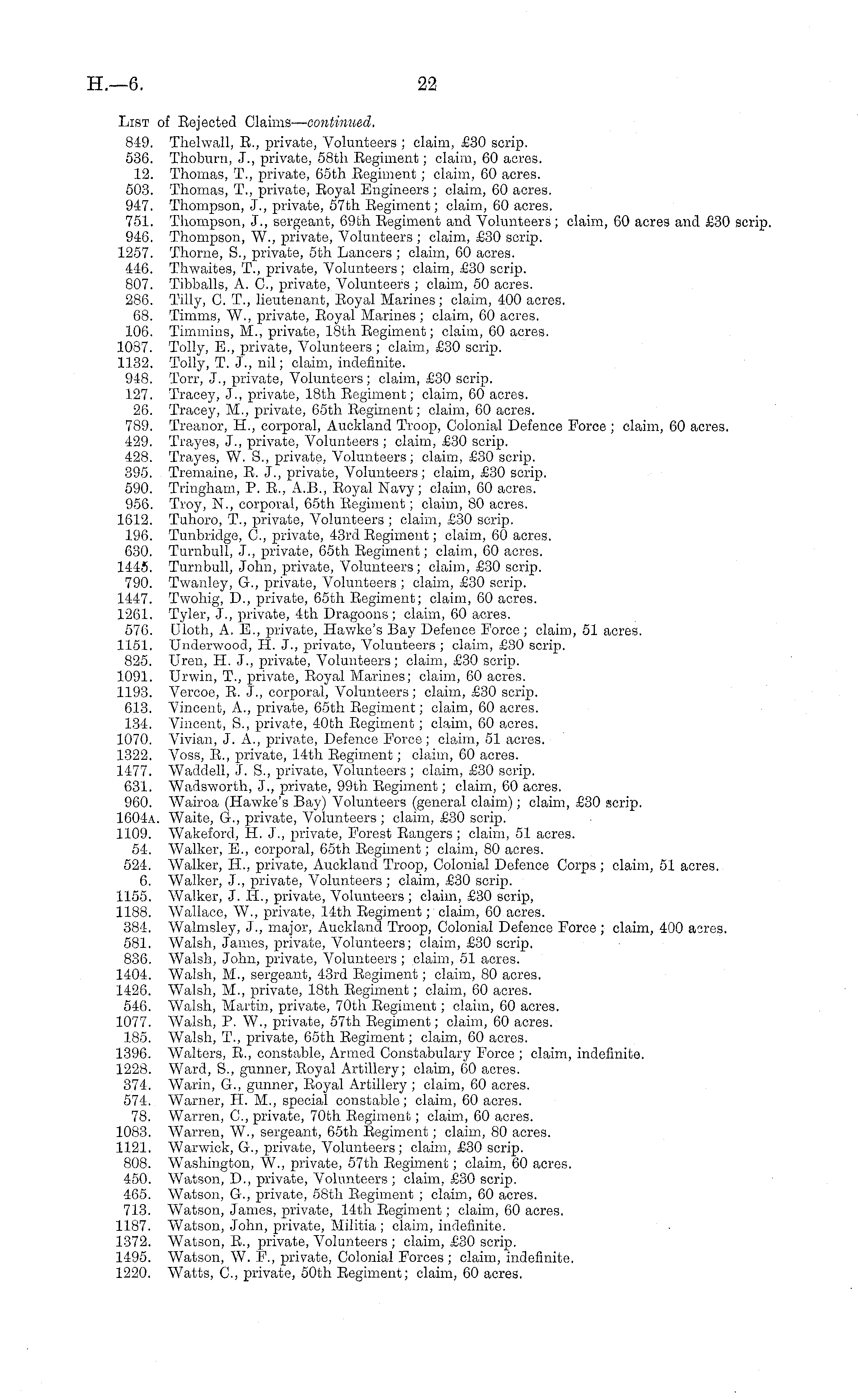 List of Eejected Claims— continued. 849. Thelwall, 8., private, Volunteers ; claim, £80 scrip. 536. Thoburn, J., private, 58th Regiment; claim, 60 acres. 12. Thomas, T., private, 65th Regiment ; claim, 60 acres. 503. Thomas, T., private, Eoyal Engineers ; claim, 60 acres. 947. Thompson, J., private, 57th Regiment ; claim, 60 acres. 751. Thompson, J., sergeant, 69th Regiment and Volunteers; claim, 60 acres and £30 scrip. 946. Thompson, W., private, Volunteers ; claim, £30 scrip. 1257. Thome, S., private, sth Lancers ; claim, 60 acres. 446. Thwaites, T., private, Volunteers; claim, £30 scrip. 807. Tibballs, A. C, private, Volunteers ; claim, 50 acres. 286. Tilly, G. T., lieutenant, Eoyal Marines ; claim, 400 acres. 68. Timms, W., private, Eoyal Marines; claim, 60 acres. 106. Timmins, M., private, 18th Regiment; claim, 60 acres. 1087. Tolly, E., private, Volunteers; claim, £30 scrip. 1132. Tolly, T. J., nil; claim, indefinite. 948. Torr, J., private, Volunteers; claim, £30 scrip. 127. Tracey, J., private, 18th Regiment; claim, 60 acres. 26. Tracey, M., private, 65th Regiment; claim, 60 acres. 789. Treanor, H., corporal, Auckland Troop, Colonial Defence Force ; claim, 60 acres. 429. Trayes, J., private, Volunteers ; claim, £30 scrip. 428. Trayes, W. S., private, Volunteers; claim, £30 scrip. 395. Tremaine, E. J., private, Volunteers; claim, £30 scrip. 590. Tringham, P. E., A.8., Eoyal Navy; claim, 60 acres. 956. Troy, N., corporal, 65th Eegiment; claim, 80 acres. 1612. Tuhoro, T., private, Volunteers; claim, £30 scrip. 196. Tunbridge, C, private, 43rd Begimeut; claim, 60 acres. 630. Turnbull, J., private, 65th Eegiment; claim, 60 acres. 1445. Turnbull, John, private, Volunteers; claim, £30 scrip. 790. Twanley, G., private, Volunteers ; claim, £30 scrip. 1447. Twohig, D., private, 65th Eegiment; claim, 60 acres. 1261. Tyler, J., private, 4th Dragoons; claim, 60 acres. 576. Uloth, A. E., private, Hawke's Bay Defence Force; claim, 51 acres. 1151. Underwood, H. J., private, Volunteers ; claim, £30 scrip. 825. Uren, H. J., private, Volunteers; claim, £30 scrip. 1091. Urwin, T., private, Eoyal Marines; claim, 60 acres. 1193. Vercoe, E. J., corporal, Volunteers; claim, £30 scrip. 613. Vincent, A., private, 65th Eegiment; claim, 60 acres. 134. Vincent, S., private, 40th Eegiment; claim, 60 acres. 1070. Vivian, J. A., private, Defence Force; claim, 51 acres. 1322. Voss, E., private, 14th Eegiment; claim, 60 acres. 1477. Waddell, J. S., private, Volunteers ; claim, £30 scrip. 631. Wadsworth, J., private, 99th Eegiment; claim, 60 acres. 960. Wairoa (Hawke's Bay) Volunteers (general claim); claim, £30 scrip. 1604 a. Waite, G., private, Volunteers ; claim, £30 scrip. 1109. Wakeford, H. J., private, Forest Bangers ; claim, 51 acres. 54. Walker, E., corporal, 65th Eegiment; claim, 80 acres. 524. Walker, H., private, Aucklaud Troop, Colonial Defence Corps ; claim, 51 acres. 6. Walker, J., private, Volunteers ; claim, £30 scrip. 1155. Walker, J. H., private, Volunteers ; claim, £30 scrip, 1188. Wallace, W., private, 14th Eegiment; claim, 60 acres. 384. Walmsley, J., major, Auckland Troop, Colonial Defence Force ; claim, 400 acres. 581. Walsh, James, private, Volunteers; claim, £30 scrip. 836. Walsh, John, private, Volunteers ; claim, 51 acres. 1404. Walsh, M., sergeant, 43rd Eegiment; claim, 80 acres. 1426. Walsh, M., private, 18th Eegiment; claim, 60 acres. 546. Walsh, Martin, private, 70th Eegiment; claim, 60 acres. 1077. Walsh, P. W., private, 57th Eegiment; claim, 60 acres. 185. Walsh, T., private, 65th Eegiment; claim, 60 acres. 1396. Walters, E., constable, Armed Constabulary Force ; claim, indefinite. 1228. Ward, S., gunner, Eoyal Artillery; claim, 60 acres. 374. Warm, G., gunner, Eoyal Artillery ; claim, 60 acres. 574. Warner, H. M., special constable; claim, 60 acres. 78. Warren, C, private, 70th Eegiment; claim, 60 acres. 1083. Warren, W., sergeant, 65th Eegiment; claim, 80 acres. 1121. Warwick, G., private, Volunteers ; claim, £30 scrip. 808. Washington, W., private, 57th Eegiment; claim, 60 acres. 450. Watson, D., private, Volunteers ; claim, £30 scrip. 465. Watson, G., private, 58th Eogiment ; claim, 60 acres. 713. Watson, James, private, 14th Eegiment; claim, 60 acres. 1187. Watson, John, private, Militia ; claim, indefinite. 1372. Watson, E., private, Volunteers ; claim, £30 scrip. 1495. Watson, W. F., private, Colonial Forces ; claim, indefinite. 1220. Watts, C, private, 50th Eegiment; claim, 60 acres.