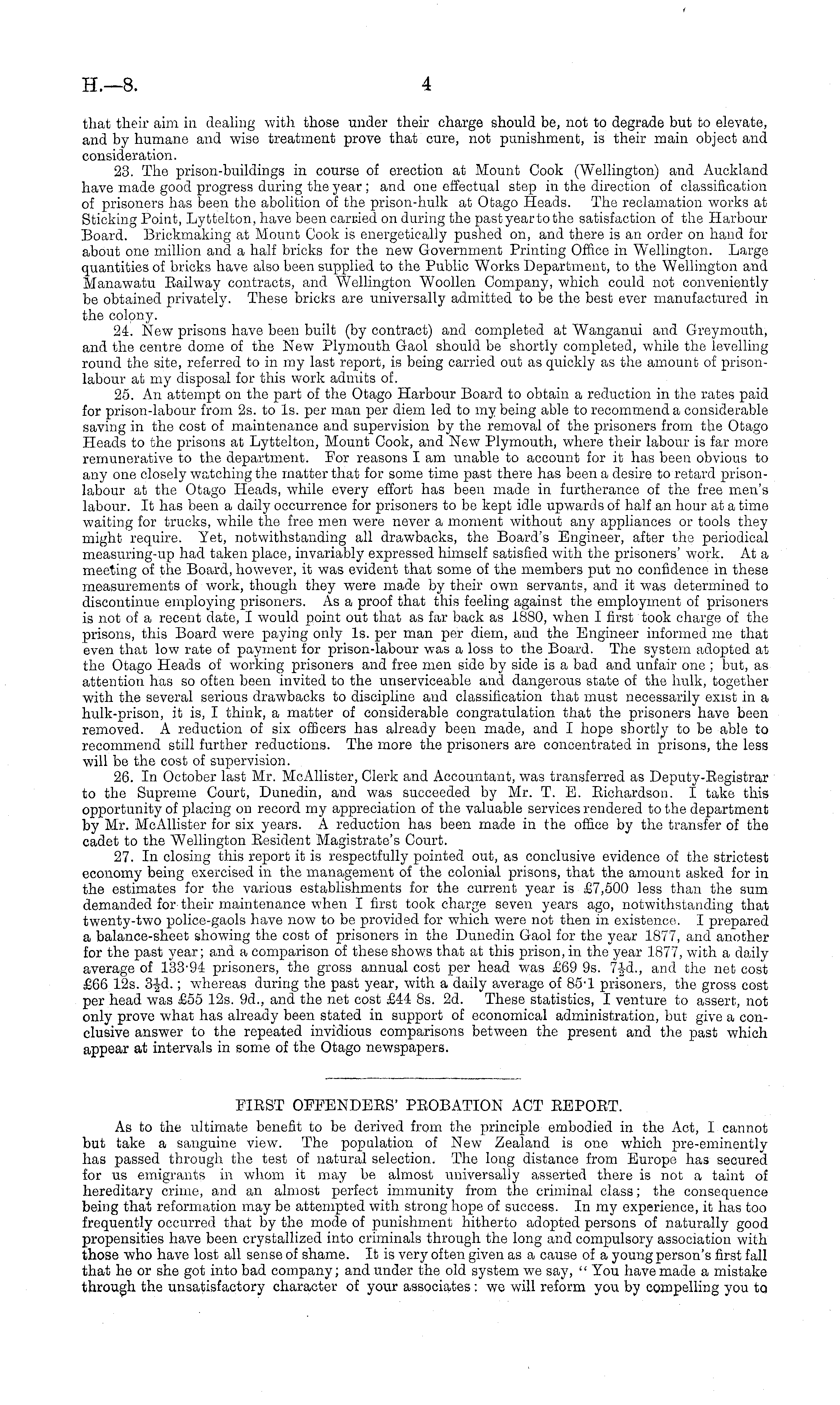 FIRST OFFENDERS' PEOBATION ACT EEPORT. As to the ultimate benefit to be derived from the principle embodied in the Act, I cannot but take a sanguine view. The population of New Zealand is one which pre-eminently has passed through the test of natural selection. The long distance from Europe has secured for us emigrants in whom it may be almost universally asserted there is not a taint of hereditary crime, and an almost perfect immunity from the criminal class; the consequence being that reformation may be attempted with strong hope of success. In my experience, it has too frequently occurred that by the mode of punishment hitherto adopted persons of naturally good propensities have been crystallized into criminals through the long and compulsory association with those who have lost all sense of shame. It is very often given as a cause of a young person's first fall that he or she got into bad company; and under the old system we say, " You have made a mistake through the unsatisfactory character of your associates : we will reform you by compelling you to