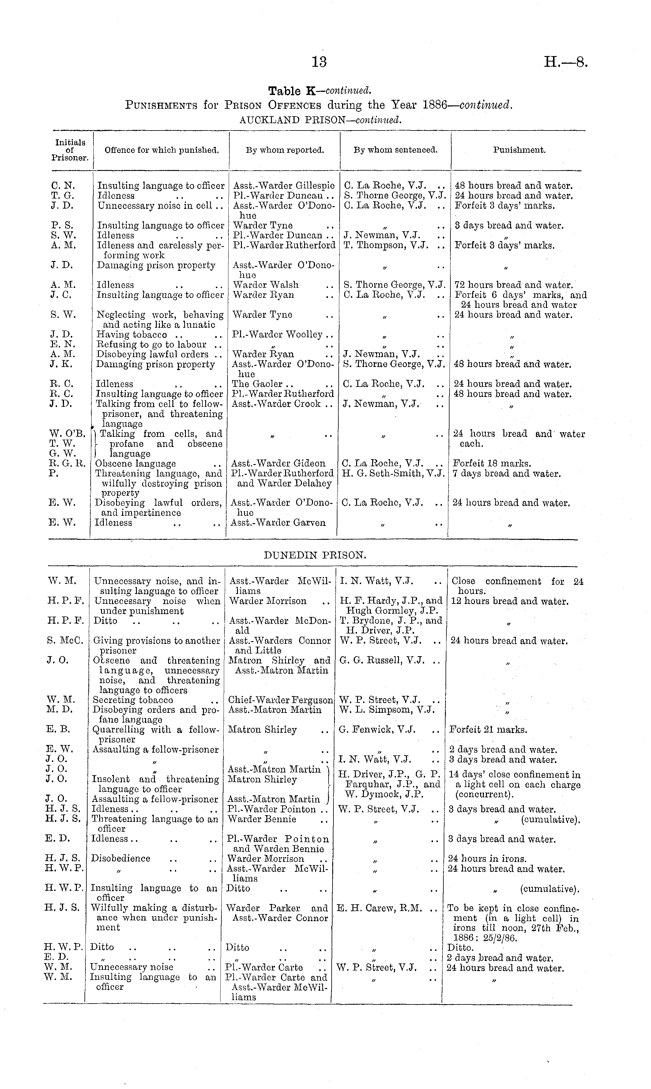 W. M. II. P. F. Unnecessary noise, and insulting language to officer Unnecessary noise when under punishment Ditto Asst.-Warder McWil- : liams ; Warder Morrison I. N. Watt, V..T. H. P. Hardy, J.P., and Hugh Gormlcy, J.P. T. Brydono, J. P., and H. Driver, J.P. W. P. Street, V.J. .. Close confinement for 24 hours. j 12 hours bread and water. H. P. F. S. McC. Giving provisions to another prisoner Obscene and threatening language, unnecessary noise, and threatening language to officers Secreting tobacco Disobeying orders and profane language Quarrelling with a fellowprisoner Assaulting a fellow-prisoner 1 Asst.-Warder McDon- • aid Asst.-Warders Connor and Little Matron Shirley and Asst.-Matron Martin 24 hours bread and water. J. 0. G. G. Russell, V.J. .. W. M. M. D. Chief-Warder Ferguson Asst.-Matron Martin W. P. Street, V.J. .. W. L. Simpsom, V.J. E. B. Matron Shirley G. Fenwick, V.J. Forfeit 21 marks. E. W. J. 0. J. 0. J. 0. Insolent and threatening language to officer Assaulting a fellow-prisoner Idleness Threatening language to an officer Idleness Asst.-Matron Martin ) Matron Shirley Asst.-Matron Martin J Pl.-Warder Pointon .. Warder Bennie I. N. Watt, V.J. '.'. H. Driver, J.P., G. P. Farquhar, J.P., and W. Dymock, J.P. 2 days bread and water. 3 days bread and water. 14 days' close confinement in a light cell on each charge (concurrent). J. 0. H. J. S. H. J. S. W. P. Street, V.J. .. 3 days bread and water. „ (cumulative). E. D. Pl.-Wardcr Pointon and Warden Bennie Warder Morrison Asst.-Warder McWilliams Ditto 3 days bread and water. H. J. S. H. W. P. Disobedience 24 hours in irons. 24 hours bread and water. H. W. P. H. J. S. Insulting language to an officer Wilfully making a disturbance when unclcr punishment Warder Parker and Asst.-Warder Connor E. II. Oarew, E.M. .. „ (cumulative). To bo kept in close confinement (in a light cell) in irons till noon, 27th Feb., 1886: 25/2/86. Ditto. 2 days bread and water. 24 hours bread and water. H.W.P. E. D. W. M. W. M. Ditto .. Ditto Unnecessary noise Insulting language to an officer PL-Warder Carte Pl.-Warder Carte and Asst.-Warder McWilliams W. P. Street, V.J. !.'